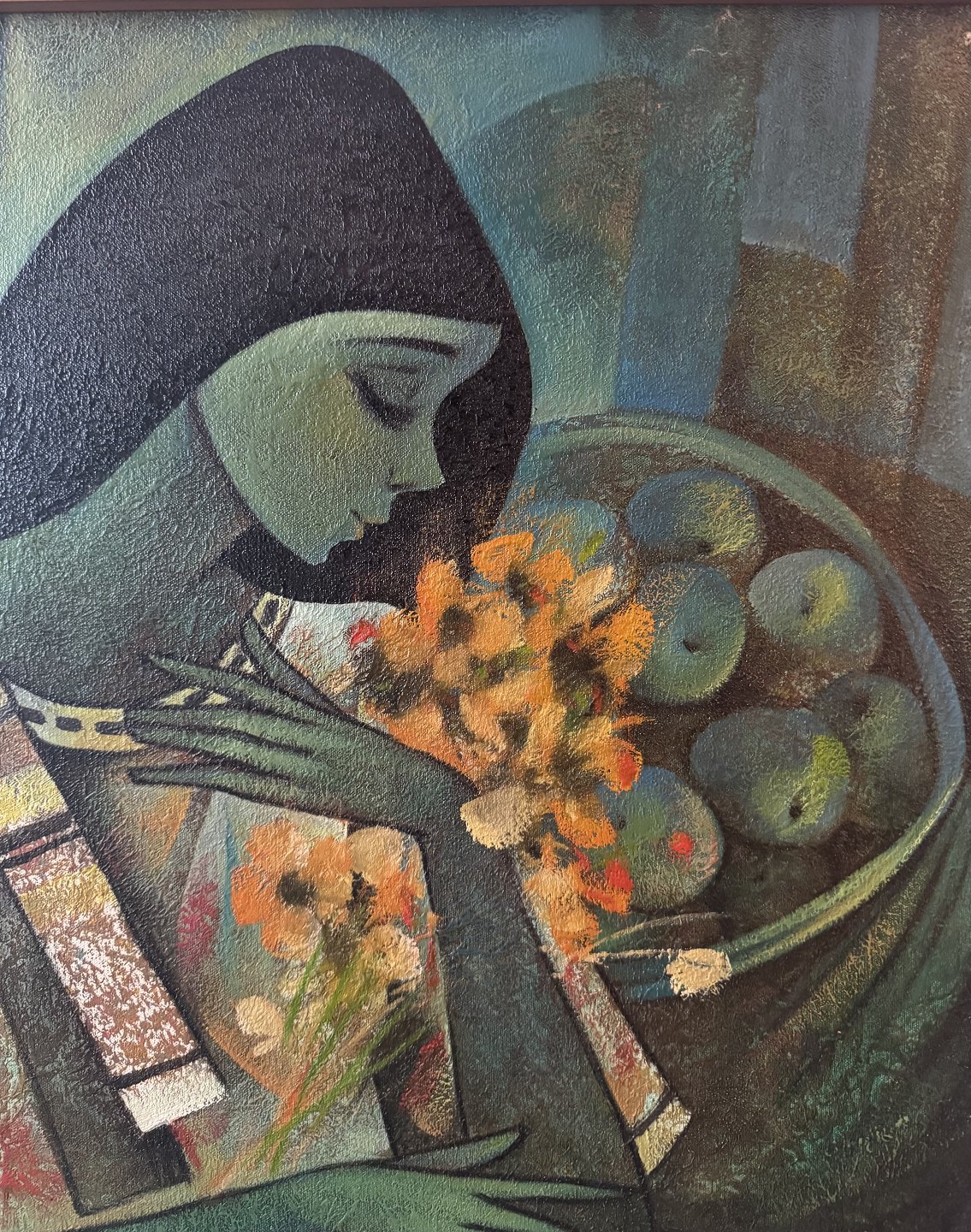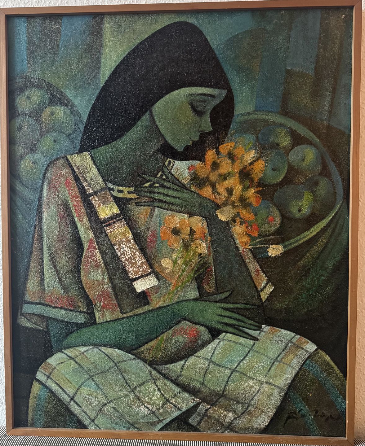 Portræt af en ung kvinde med buket af blomster og kurve med æbler omkring sig. Mål: 61,5 x 75,5 cm.