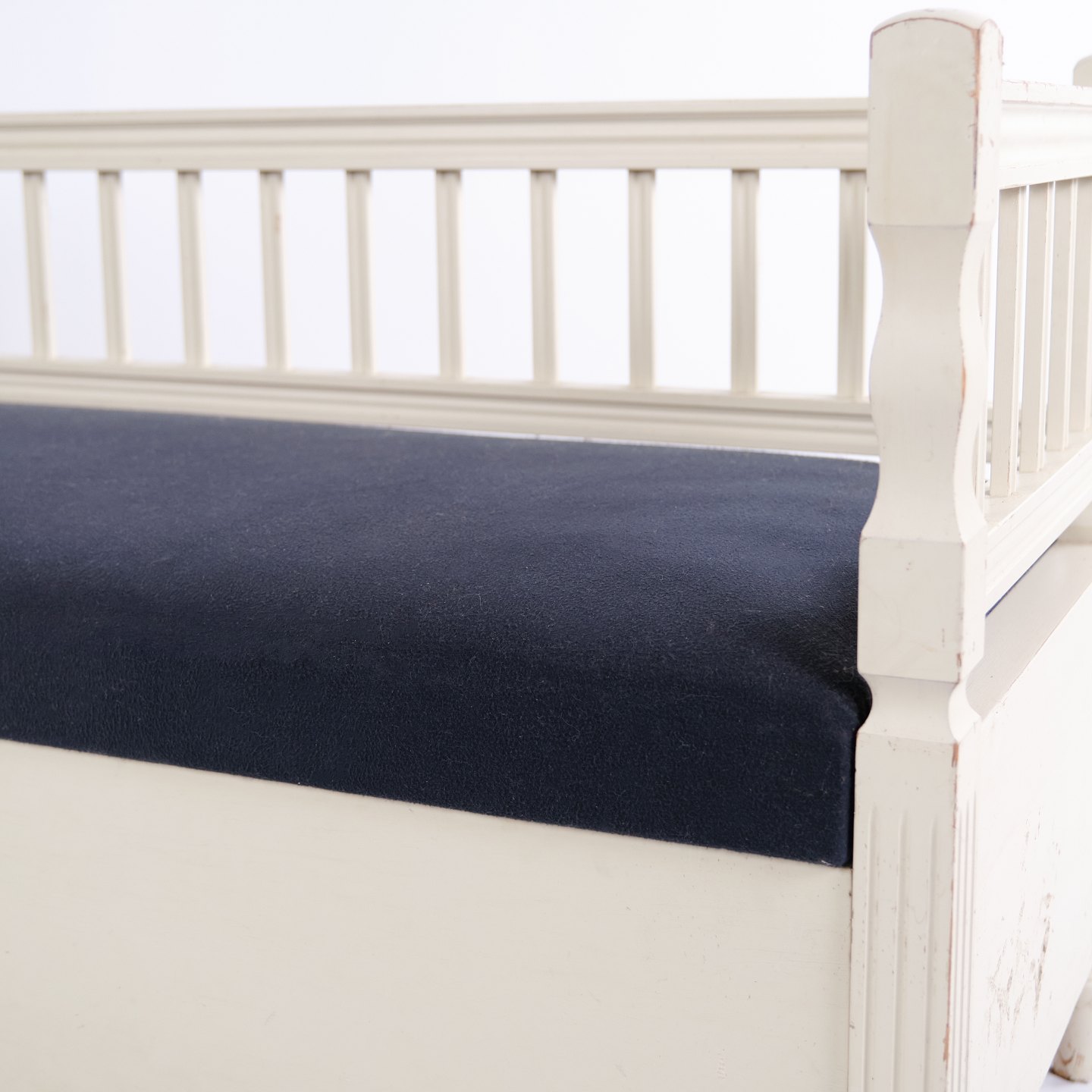 Description: Antique storage bench in Gustavian style from around 1890. White painted with upholstered seat. Classic piece with patina and charm.