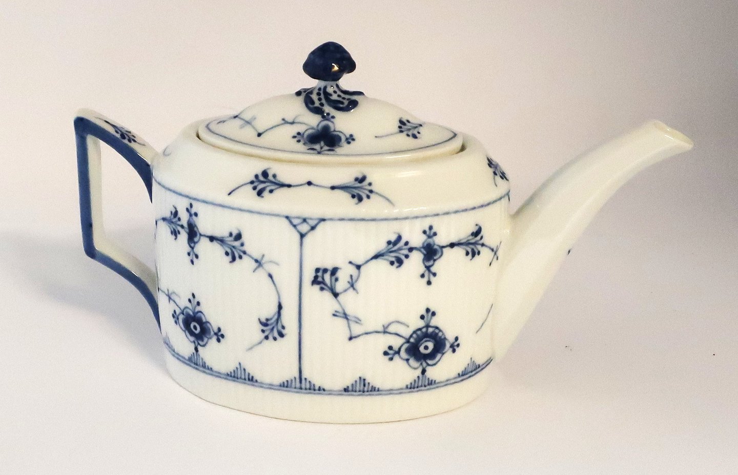 Royal Copenhagen. Musselmalet, riflet. Tekande. Model 253. Højde 13 cm. Længde 22 cm. (2 sortering). Produceret før 1923