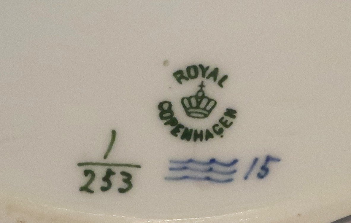 Beskrivelse: Royal Copenhagen. Musselmalet, riflet. Tekande. Model 253. Højde 13 cm. Længde 22 cm. (2 sortering). Produceret før 1923