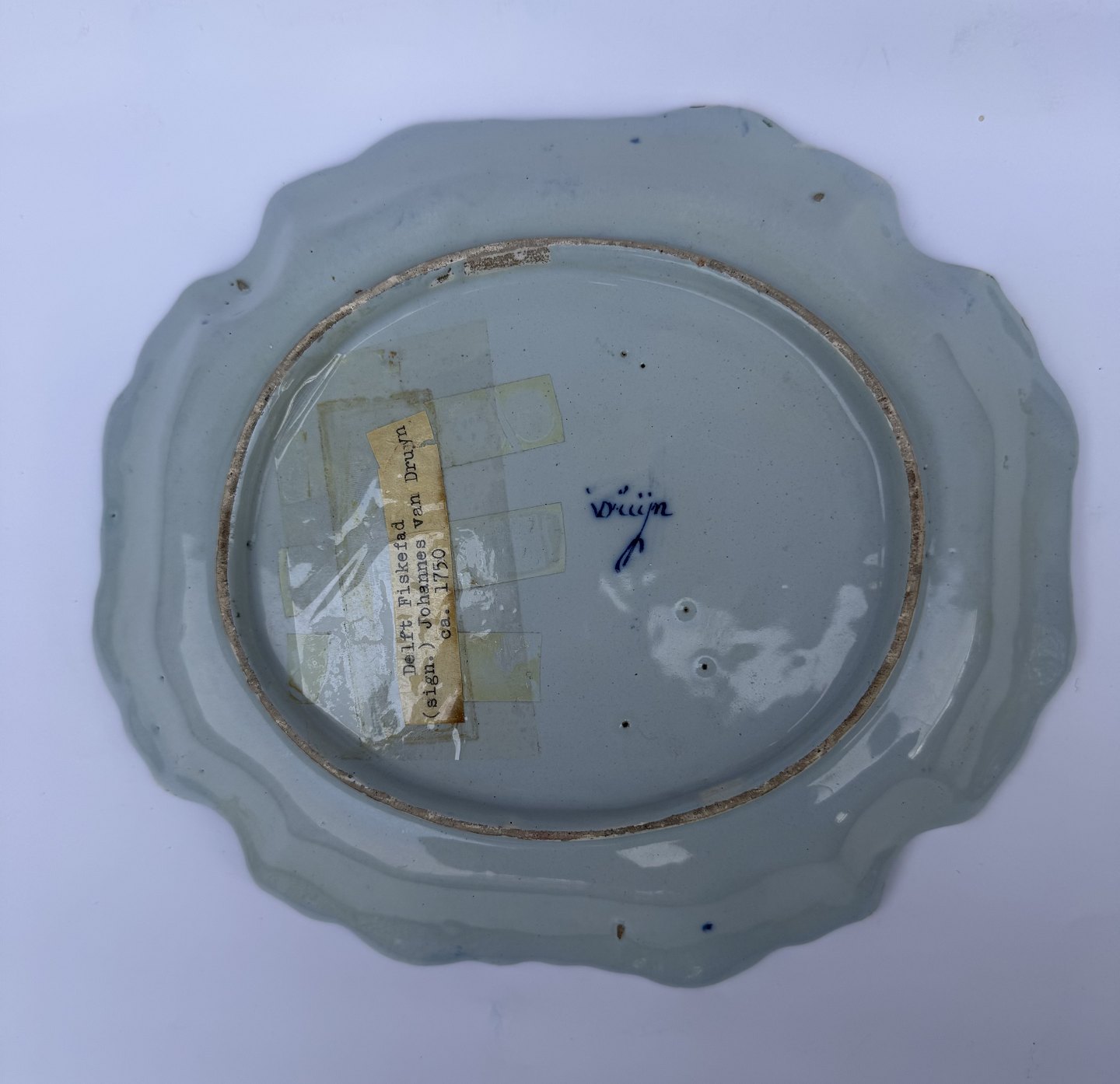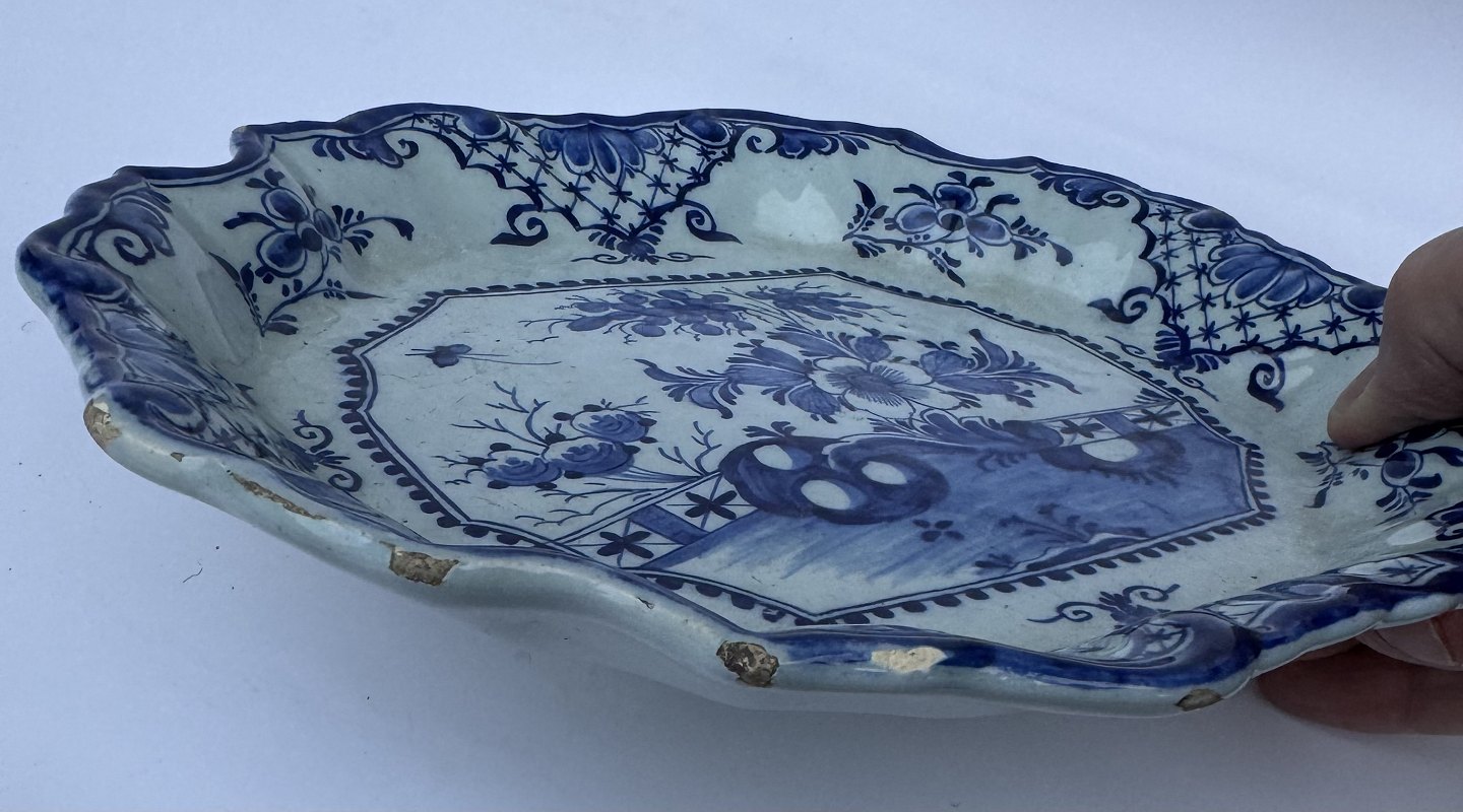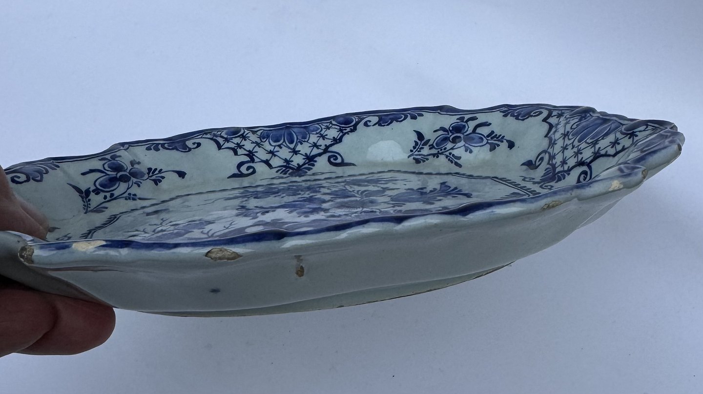 Beskrivelse: BLÅ BLOMSTER DEKORATION: Delft fajance fiskefad fra den nederlandske fabrik van Duyn fremstillet omkring 1765. Fremstår i god stand med alders relaterede brugsspor rundt på kanten i form af små overflade afslag i glasuren (se mange fotos). Der udover ingen skader eller reparationer. Fabriksmærket på bunden samt gammel label med dansk tekst. Mål:H.3,4 cm, L. 23,3 cm, D. 20,9 cm