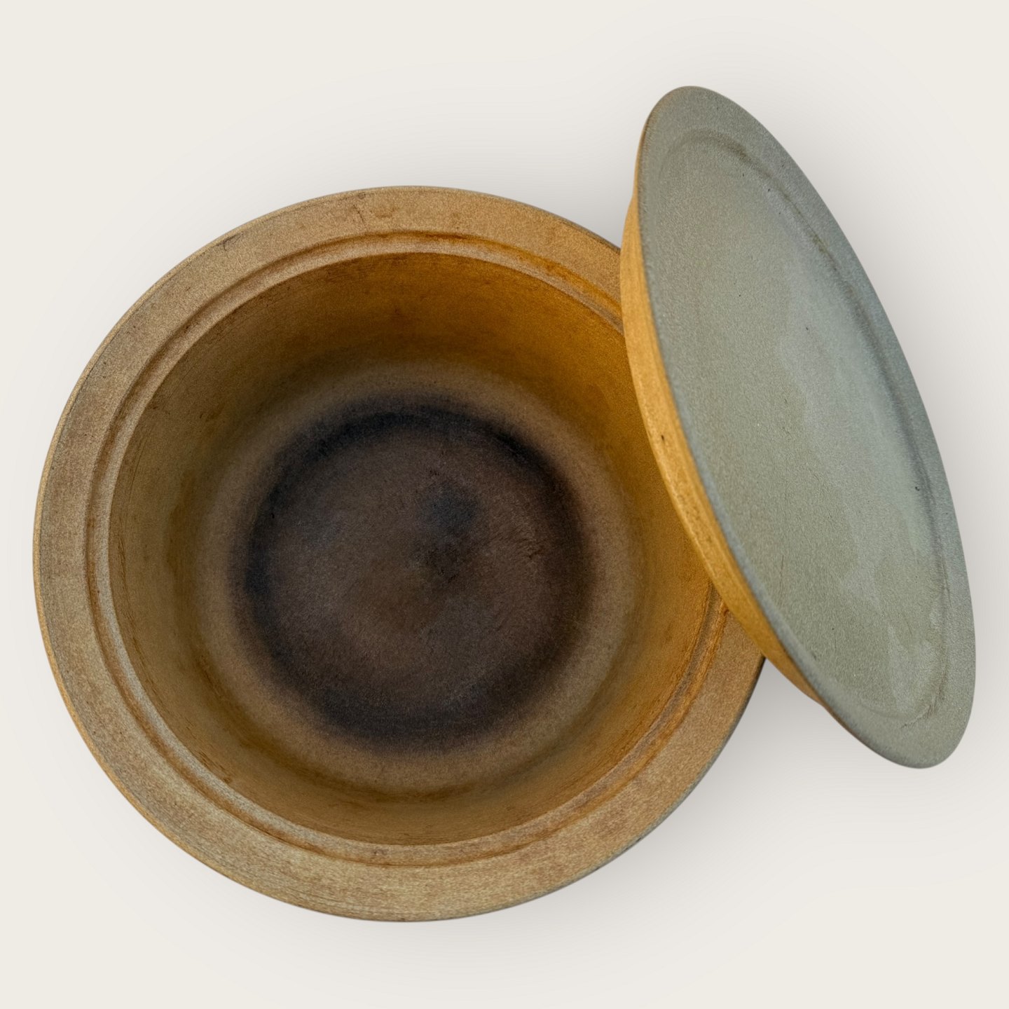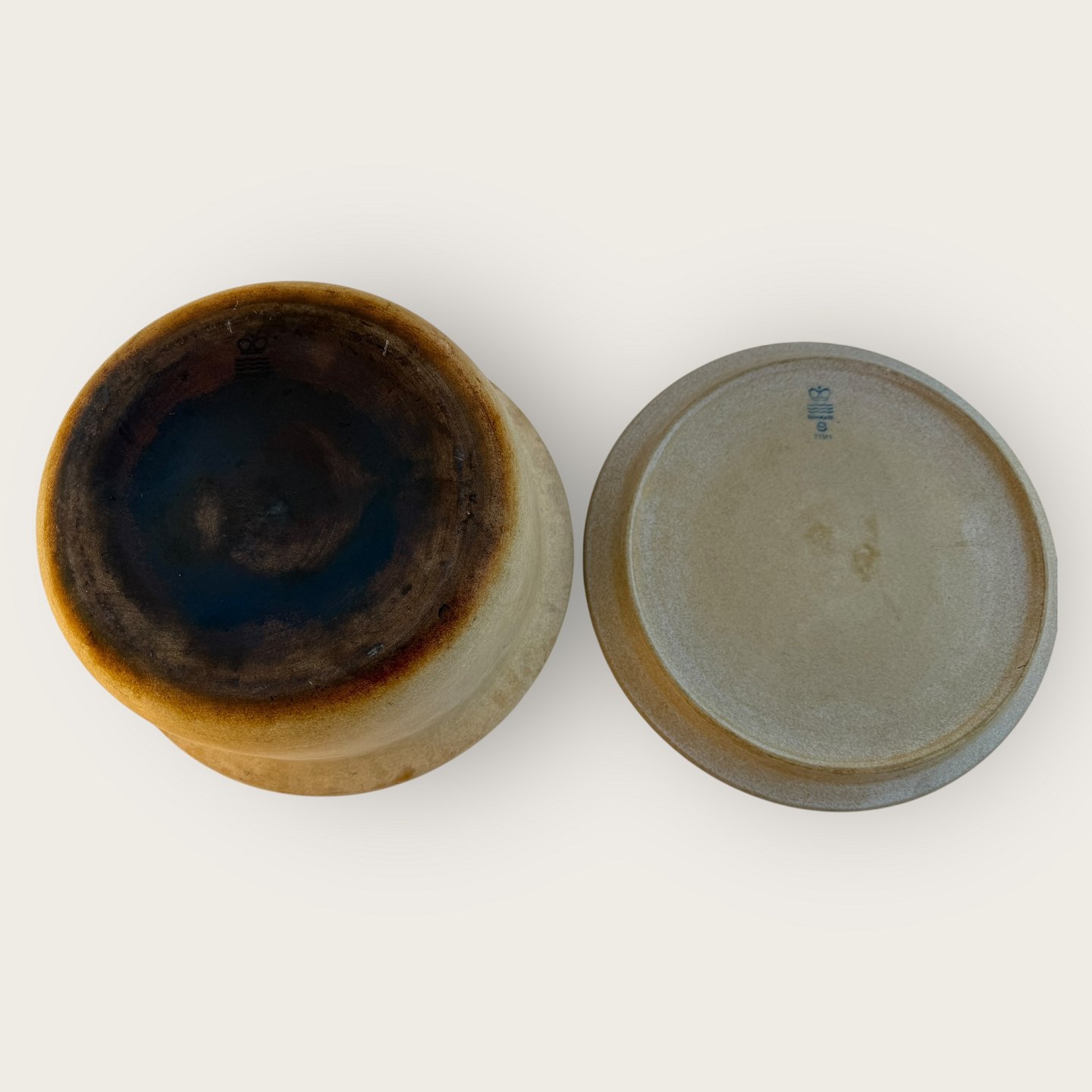 Beskrivelse: Royal Copenhagen, Ildpot, Stor gryde med låg, #22506 og # 22514, 29cm i diameter og 13,5cm høj, 1. sortering, Design Grethe Meyer * Meget lille afslag på låget (se foto) og noget mørk under bunden ellers pæn brugt stand*