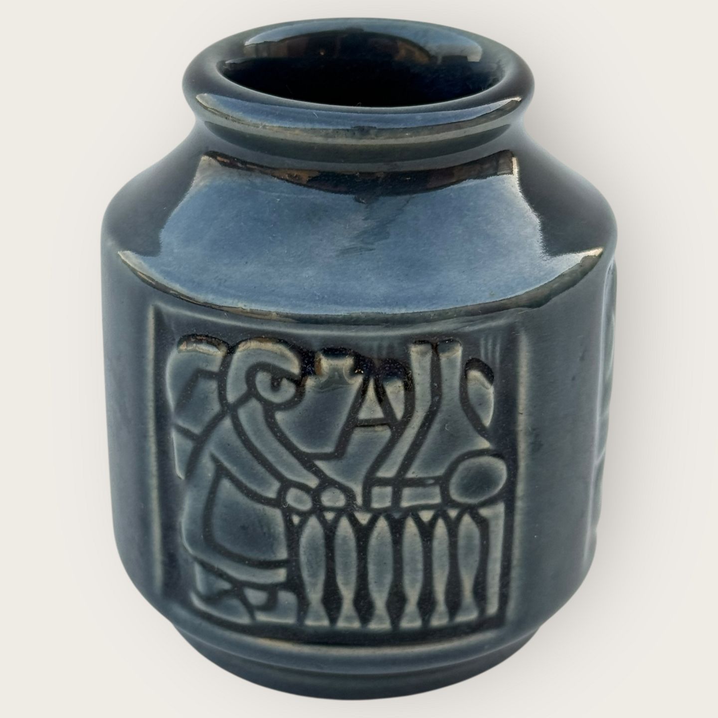 Beskrivelse: Bornholmsk keramik, Michael Andersen, Lille vasemed med motiver fra Bornholm, røgerier, fiskerkoner mv. Højde 8cm, diameter 6,5cm, #6123, fin stand.