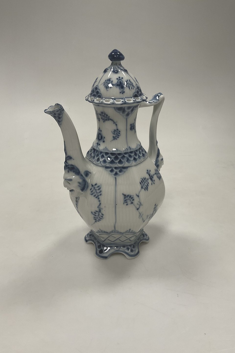 Beskrivelse: Royal Copenhagen Musselmalet Helblonde Lille sekskantet kaffekande No. 1030. 1. sortering. Måler 21 cm (8 17/64 in.)