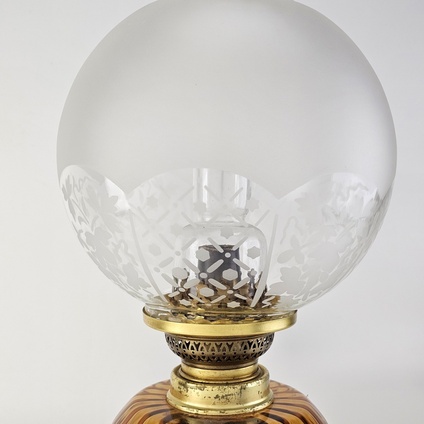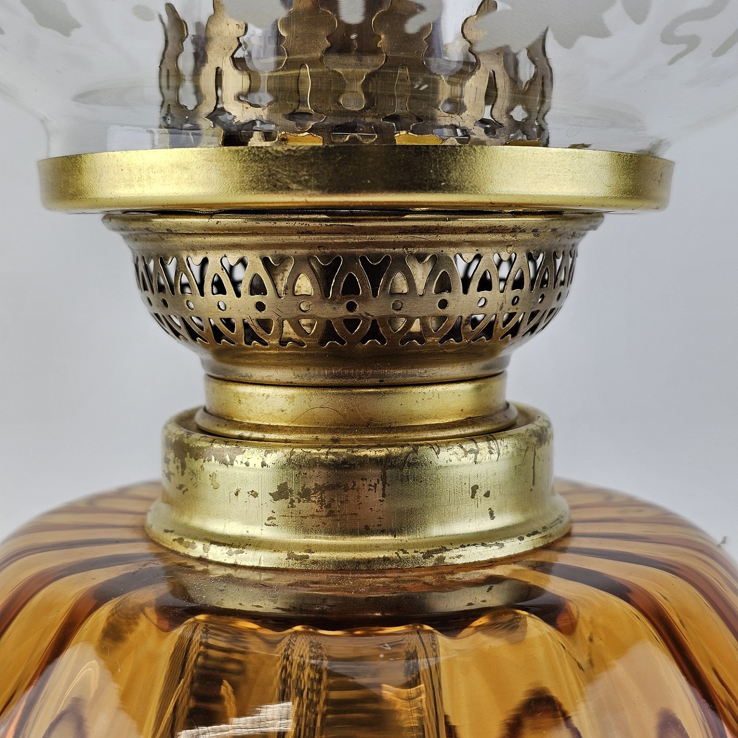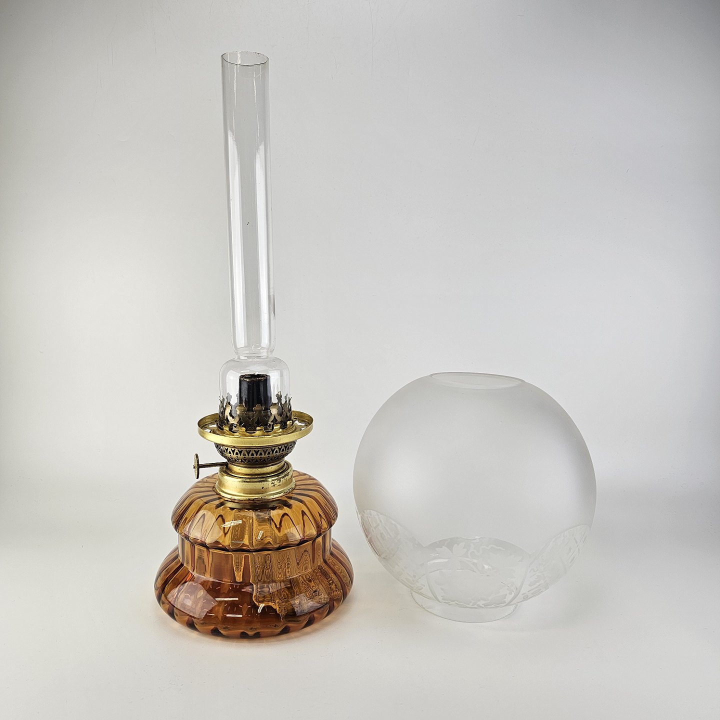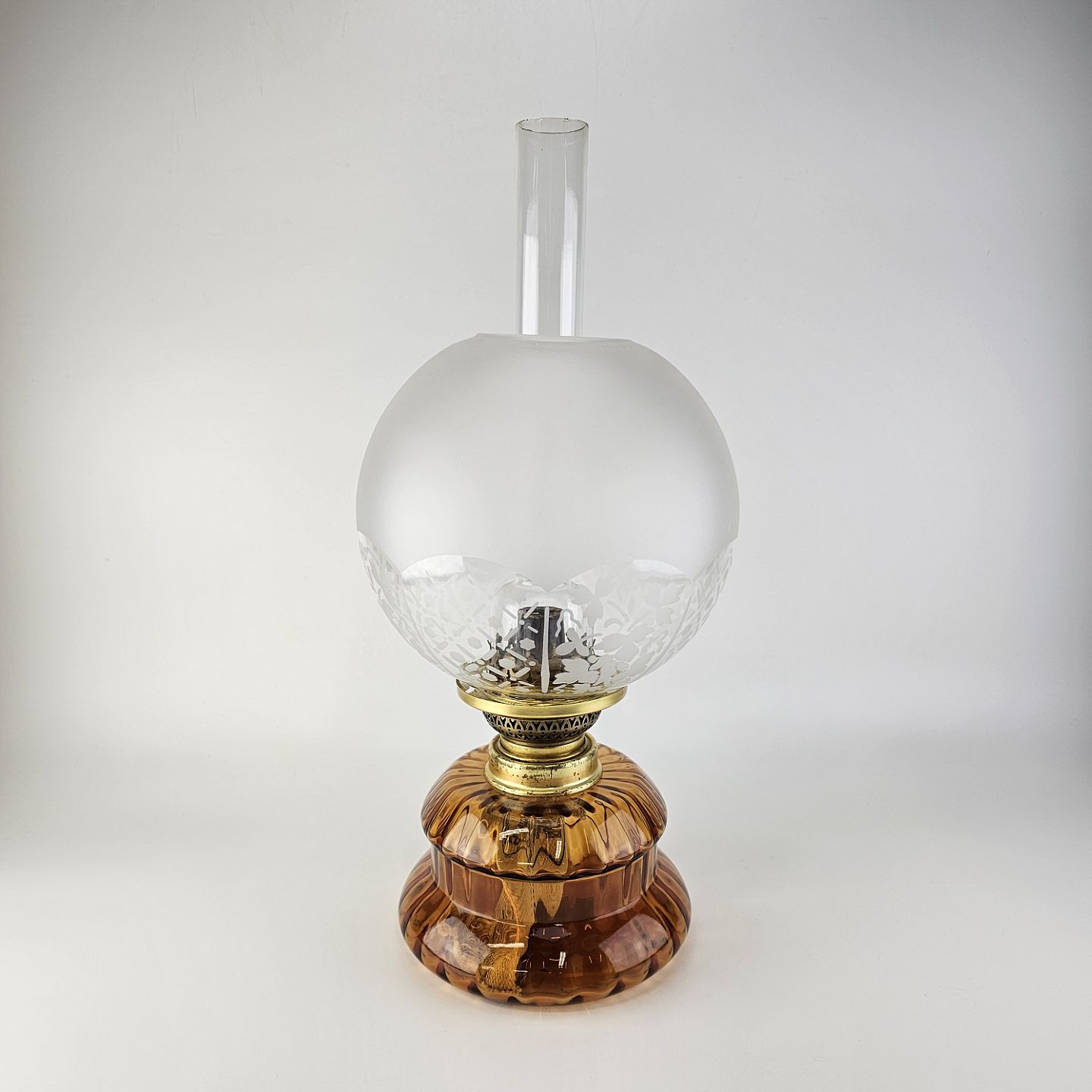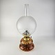 Beskrivelse: Glas ravfarvet petroliumslampe til bord model Dagmar Maxi med glasrør og rund kuppel i klar glas. Lille afslag på kuppelskærm i fod, som ikke ses.