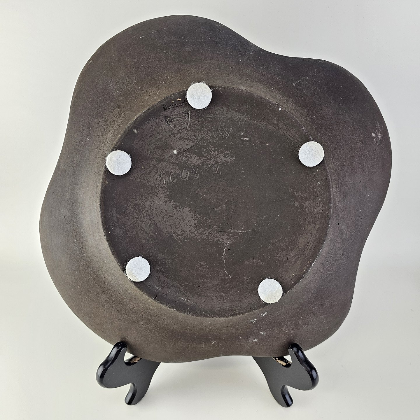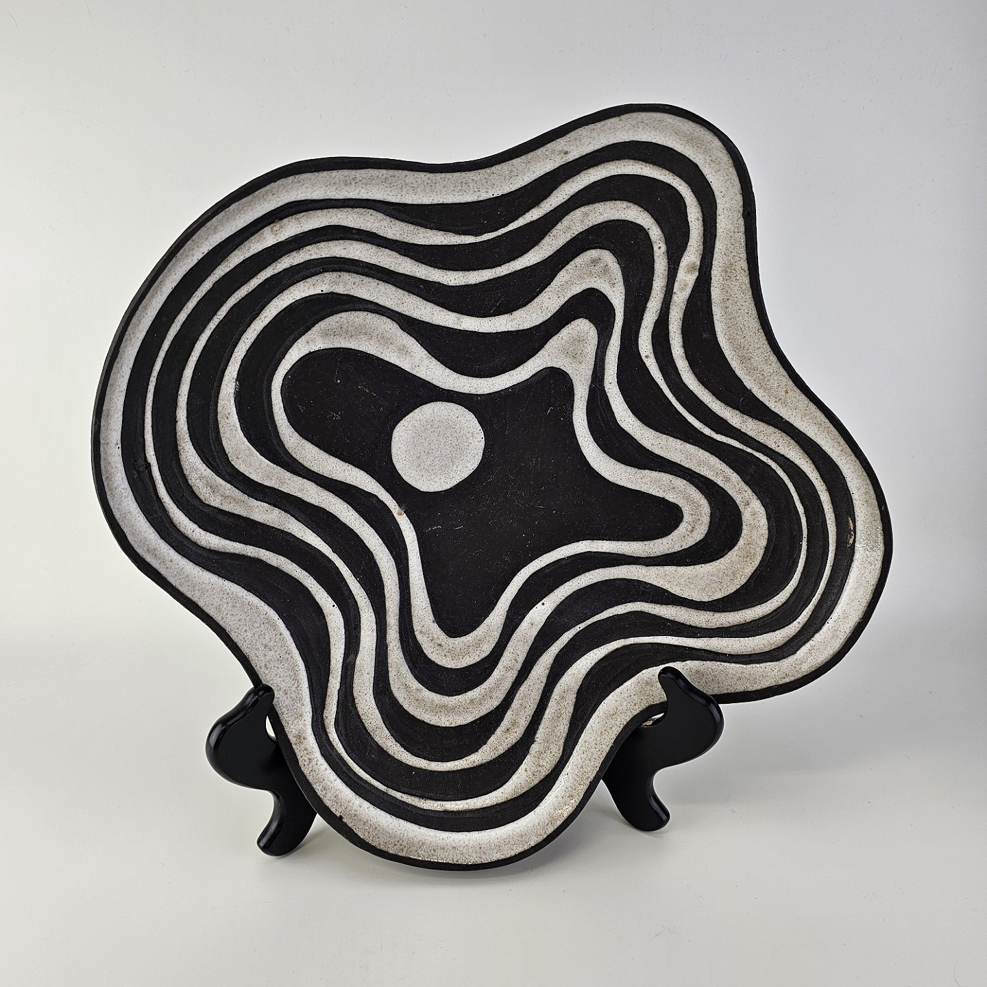 Beskrivelse: Fad i keramik fra Negro serien med abstrakt motiv på mørk baggrund. Nr. 5608-2