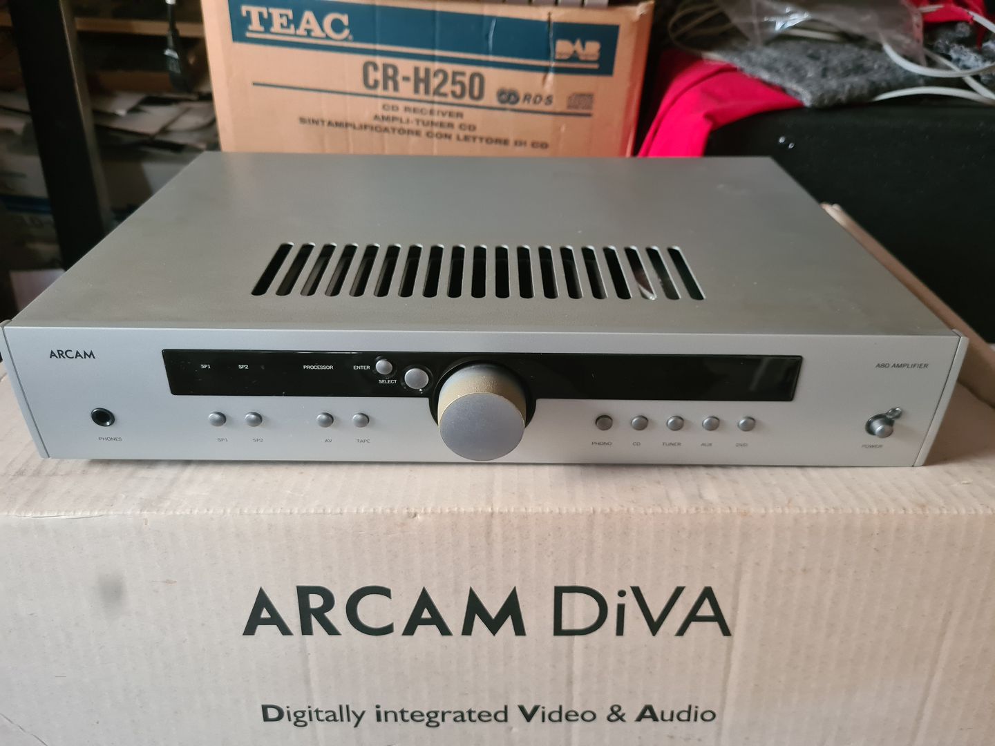 Beskrivelse: Integreret forstærker Arcam DiVA model A80. Testet og virker fint. Kommer med og i original emballage samt med strømførende kabel og fjernbetjening CR-389.