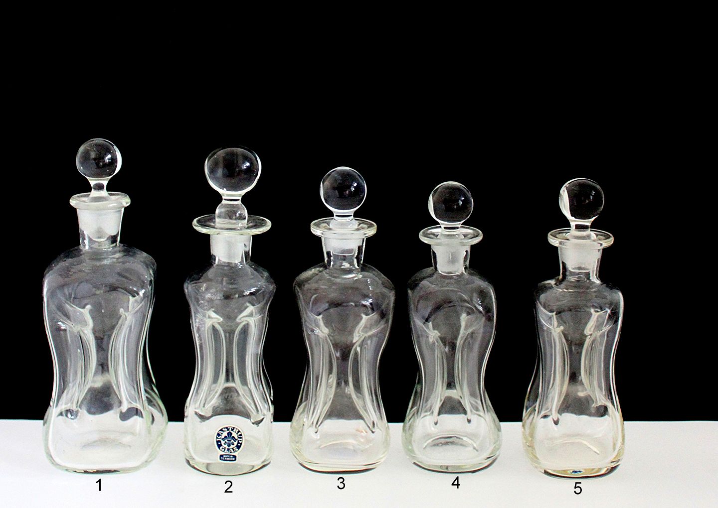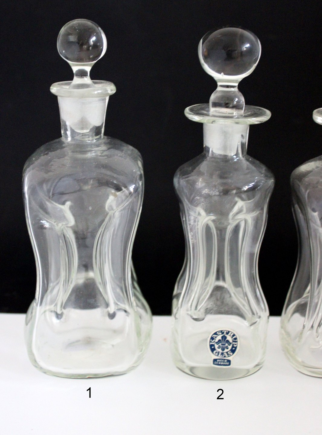 Beskrivelse: Kastrup/Holmegaard glasværk. Små kuvert klukflasker i klar glas. Almindelig brugsspor. Propperne formodes at høre til flaskerne fra start.