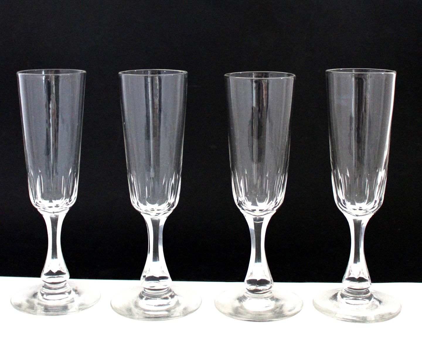 Beskrivelse: Derby Champagnefløjter. Oliveslibning i kumme, slebet stilk og rundslebet bund. Højden varierer fra 15,7 til 16,1 cm. Almindelig aldersbrusspor med den tids skavanker og skygger. Pris samlet for 4 stk: 800 kr.