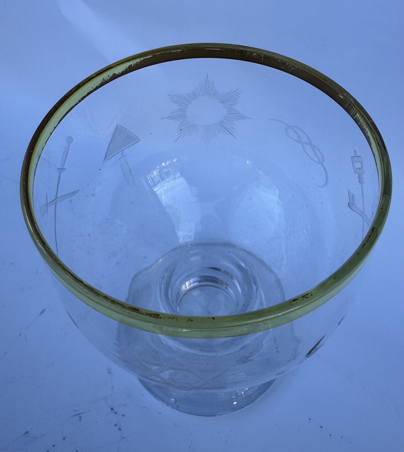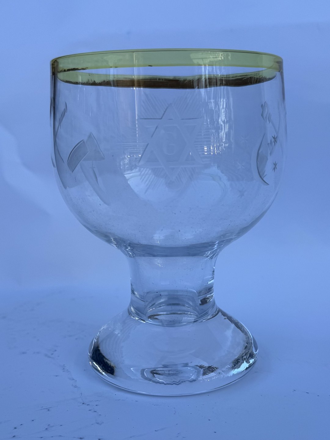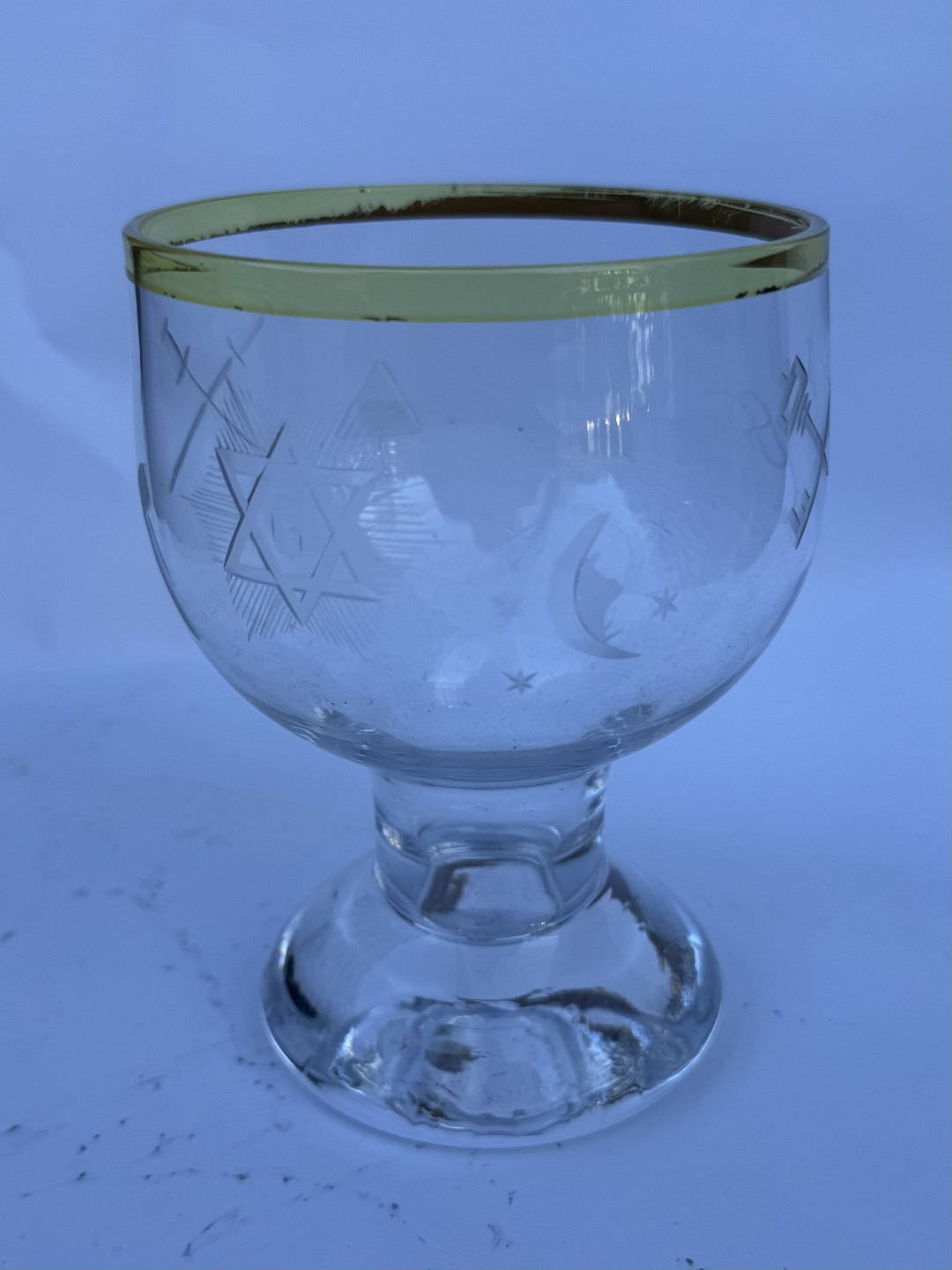 Beskrivelse: Stort glas med guldkant. Et fint glas til f.eks. øl. Stående på kraftig fod. Indgraverede frimurer symboler rundt om glasset. Fremstår i god stand. Formodes fremstillet i 1930’erne. H. 14 cm.