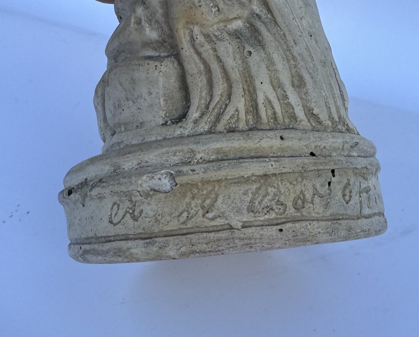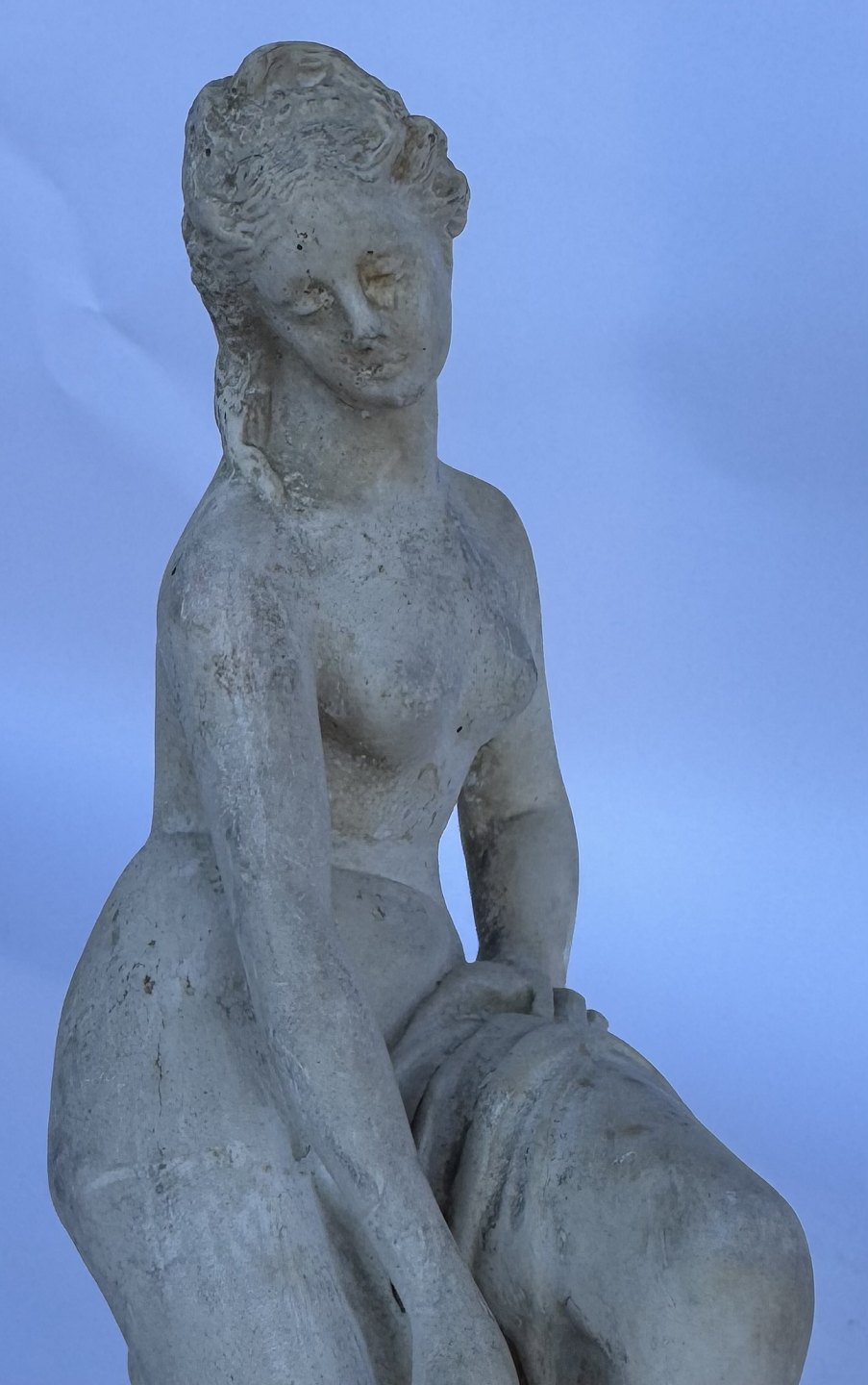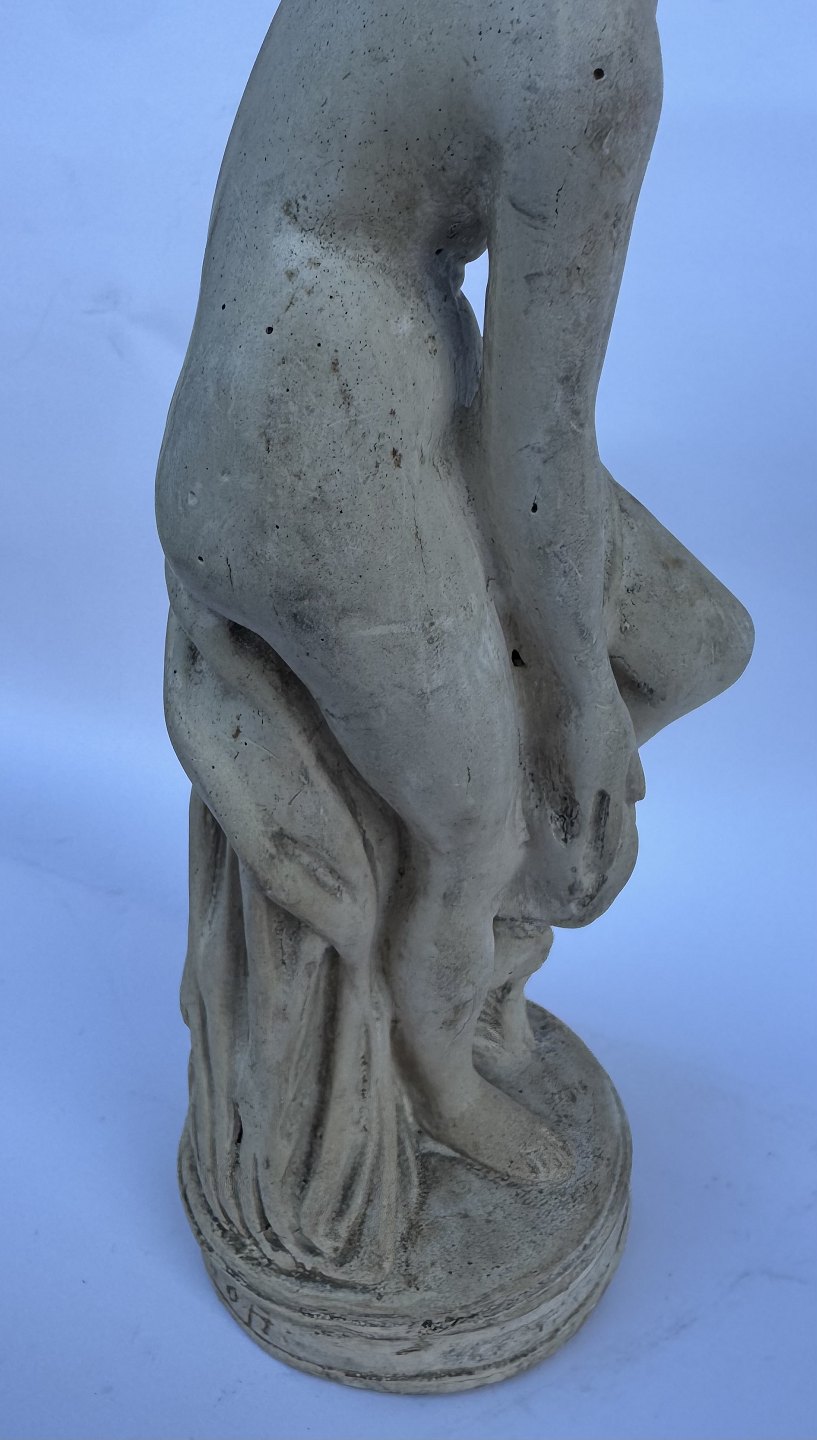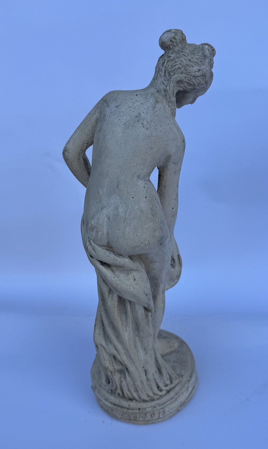 Beskrivelse: Venus, kærlighedens gudinde, forbereder sig på eller stiger ud af et bad. Skabt af den franske billedhugger Étienne-Maurice Falconets i 1767. Figuren er ofte brugt som havefigur og i mindre stue-venlige udgaver. Er fremstillet i både sten, marmor , keramik, gips og bronze gennem mere end 250 år. Denne figur er udført i gips formentlig i midten af 1900-tallet. Den fremstår i god stand uden skader eller reparationer. 25 cm høj.