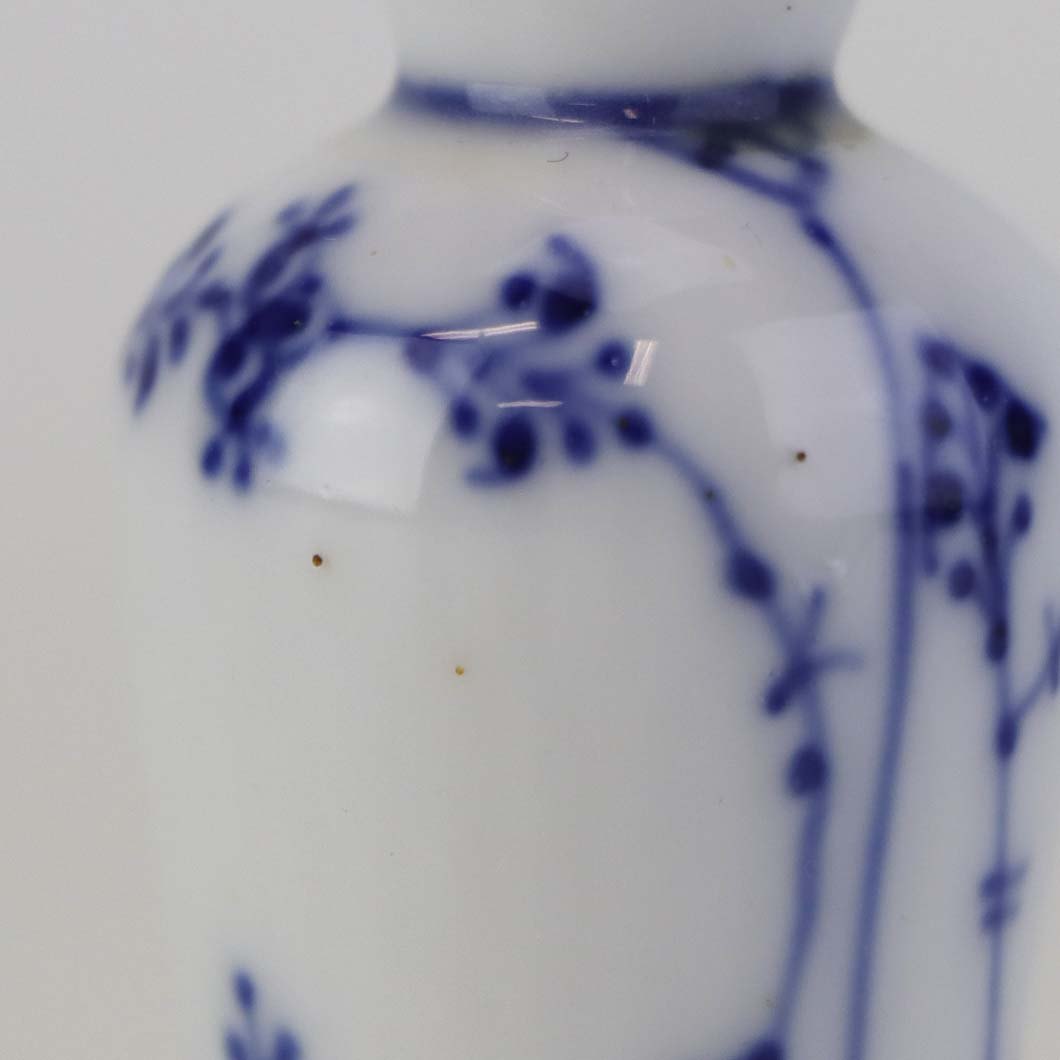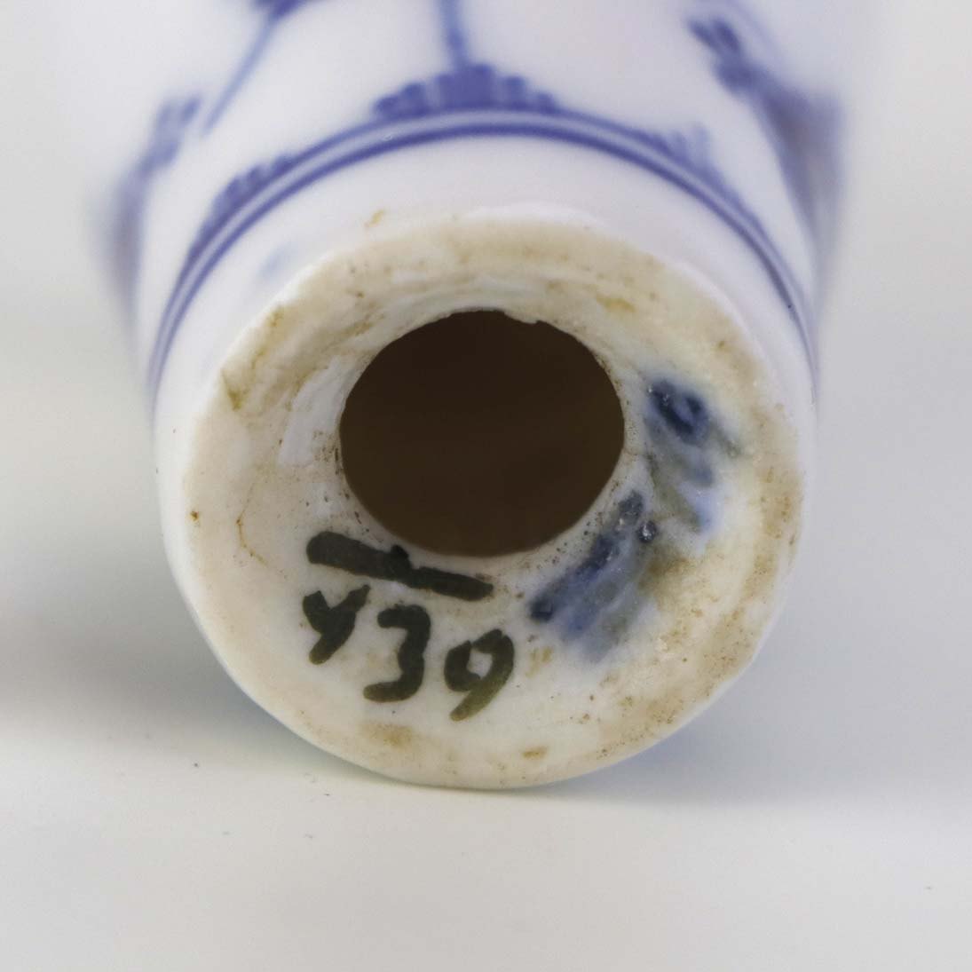 Musselmalet er af kongeligt hvidt porcelæn, dekoreret med rifler og mønster af blå ranker og blomster.