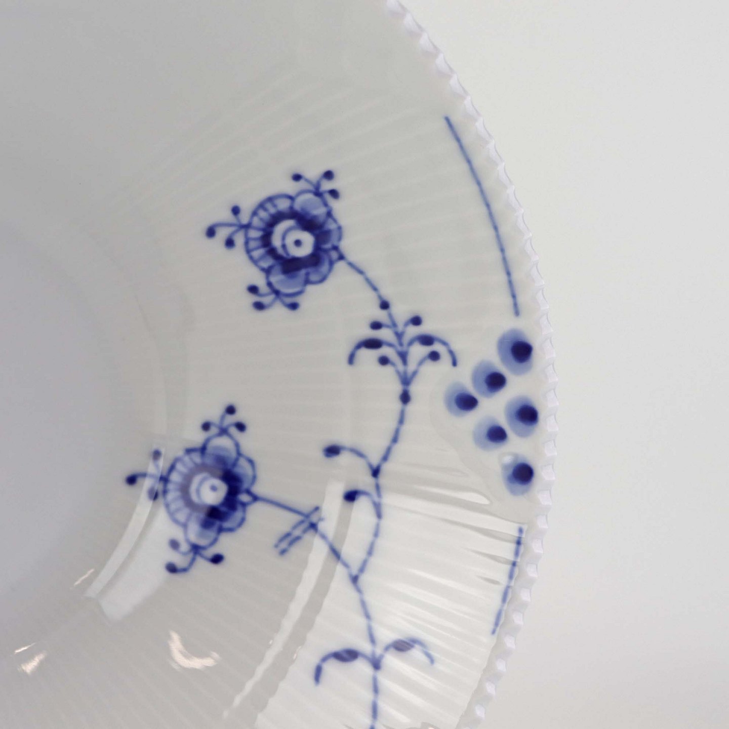 Service i glat porcelæn med let riflet kant og blå dekoration