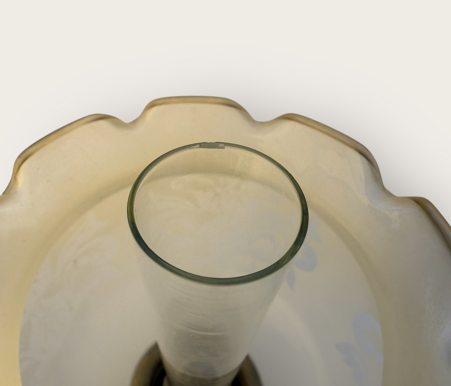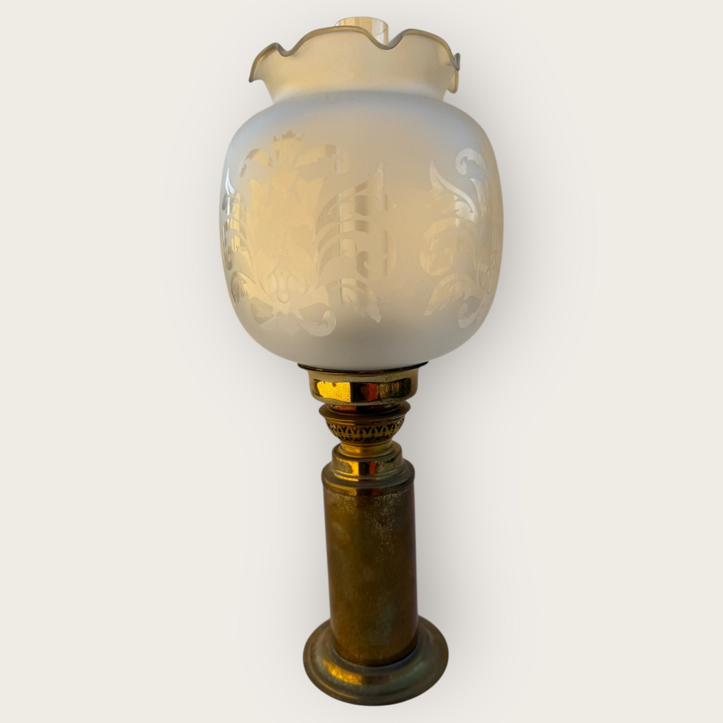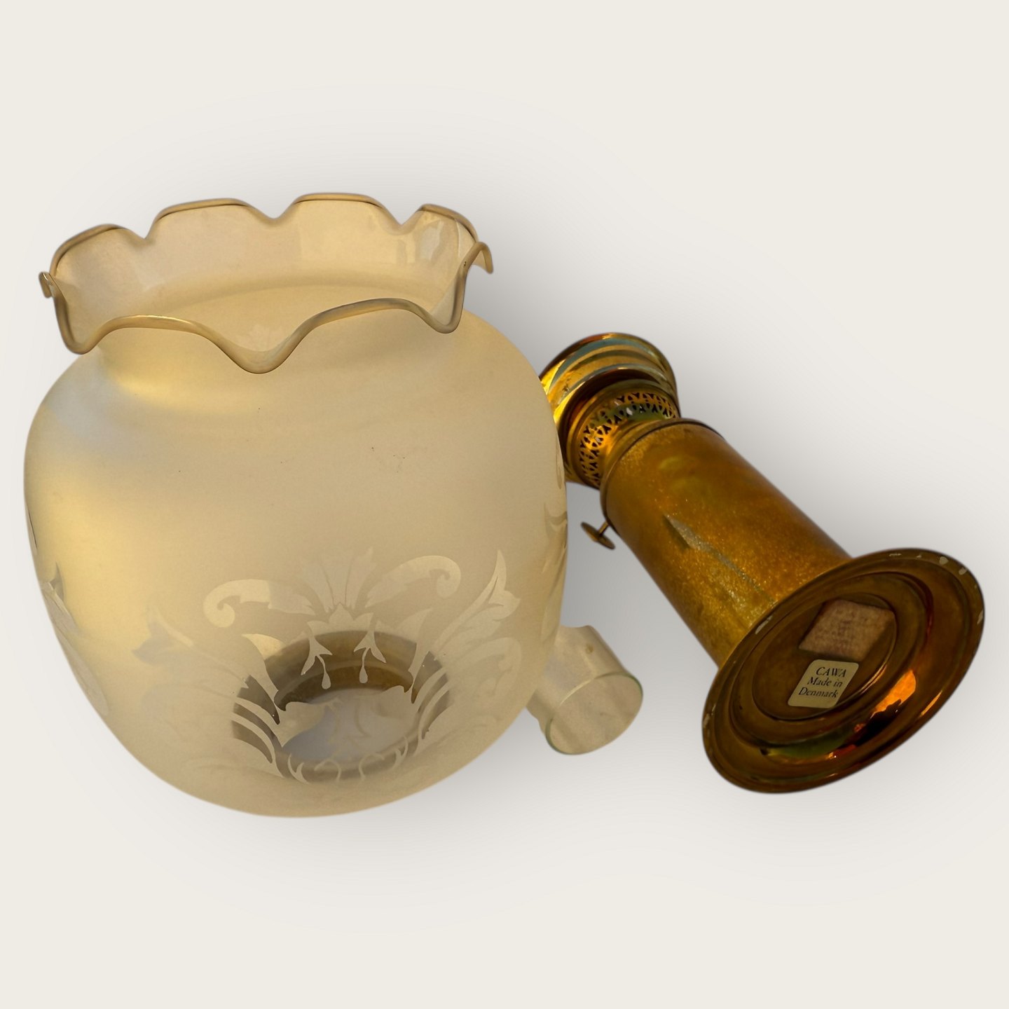 Beskrivelse: Cawa petroleumslampe, messing med glasskærm, højde 31cm, meget lille hak i brændeglasset øverst (se foto) *Ellers pæn patineret stand*