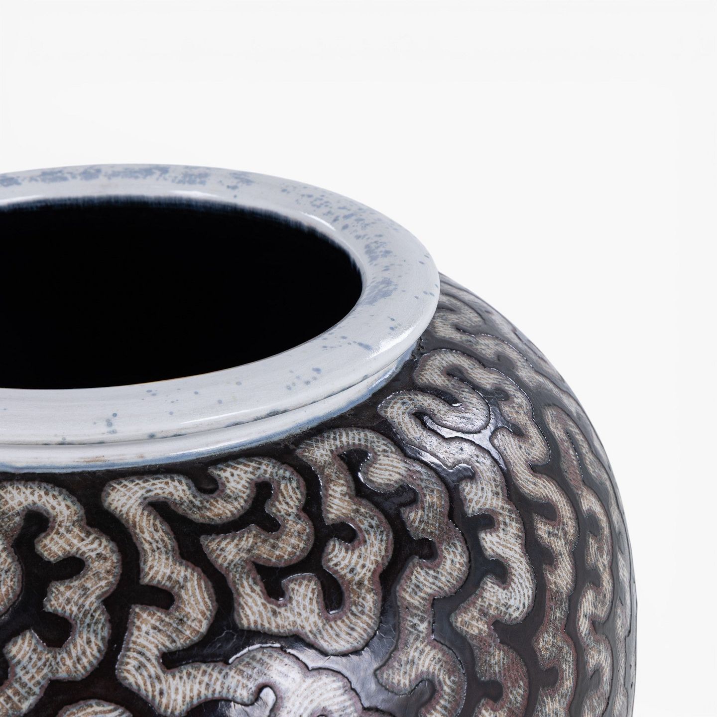 Kolossal krukke i stentøj med sort glasur og hvide stafferinger. Signeret.