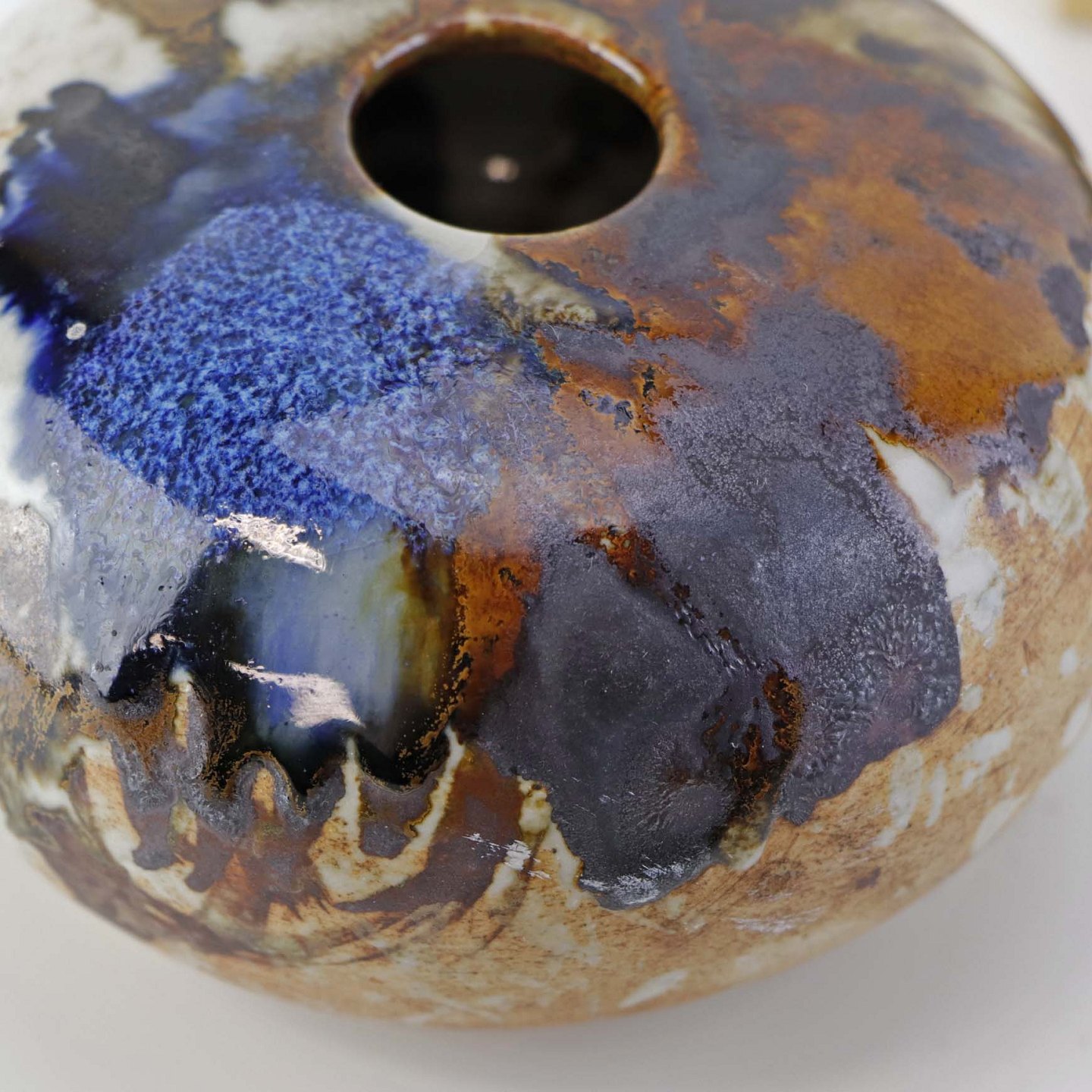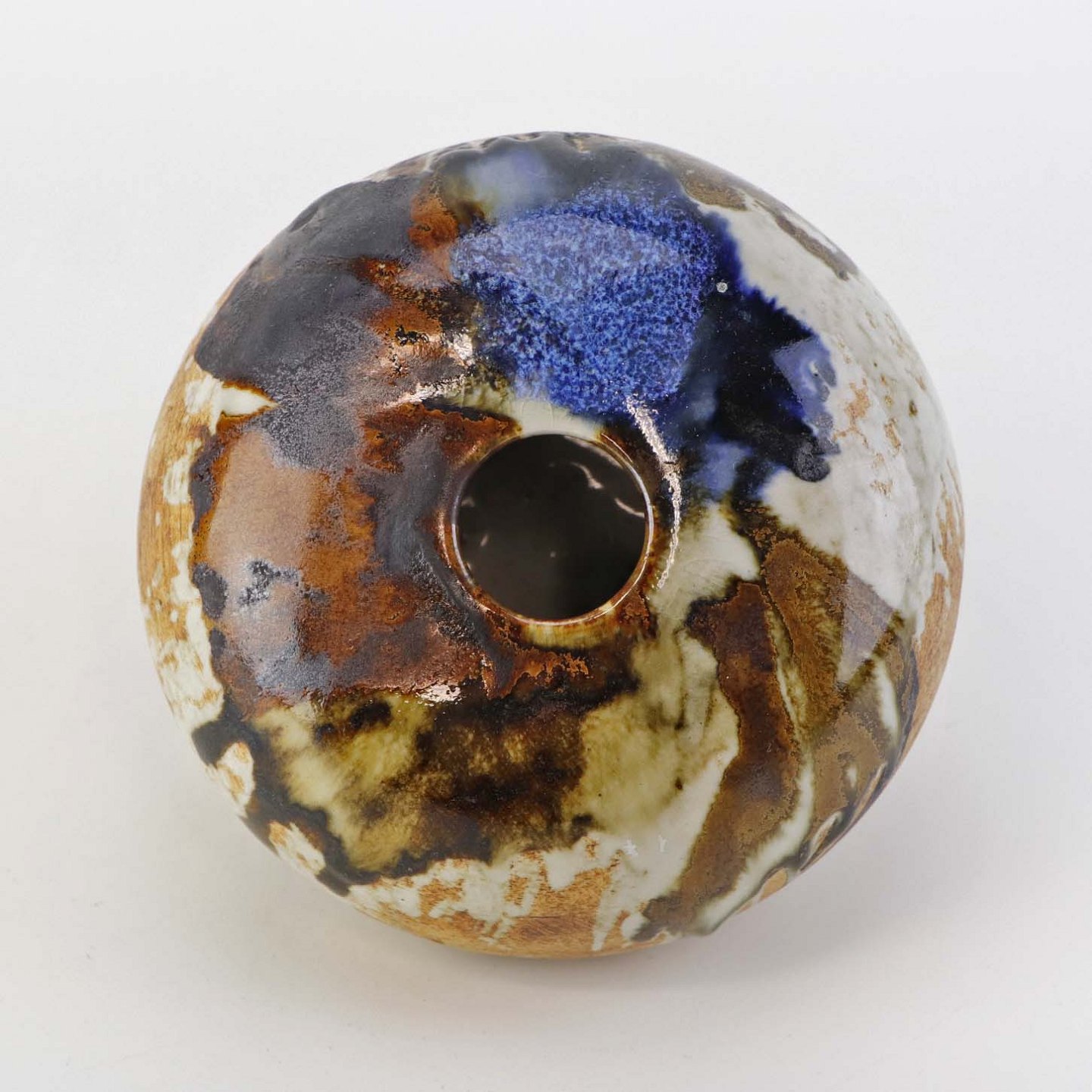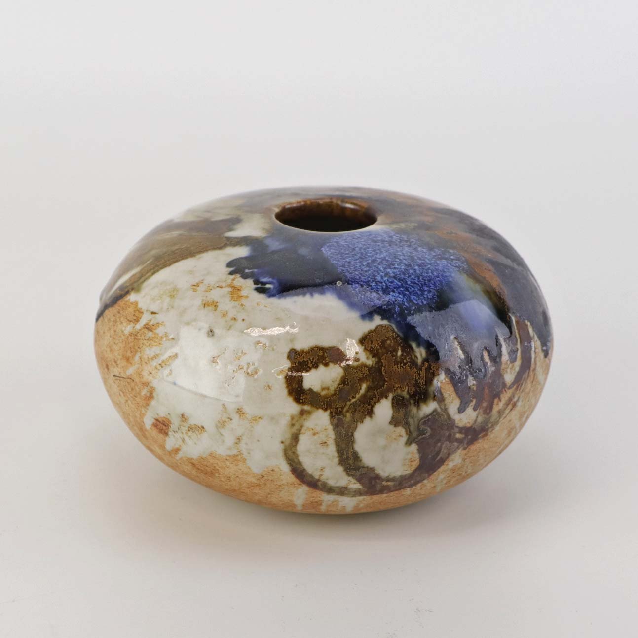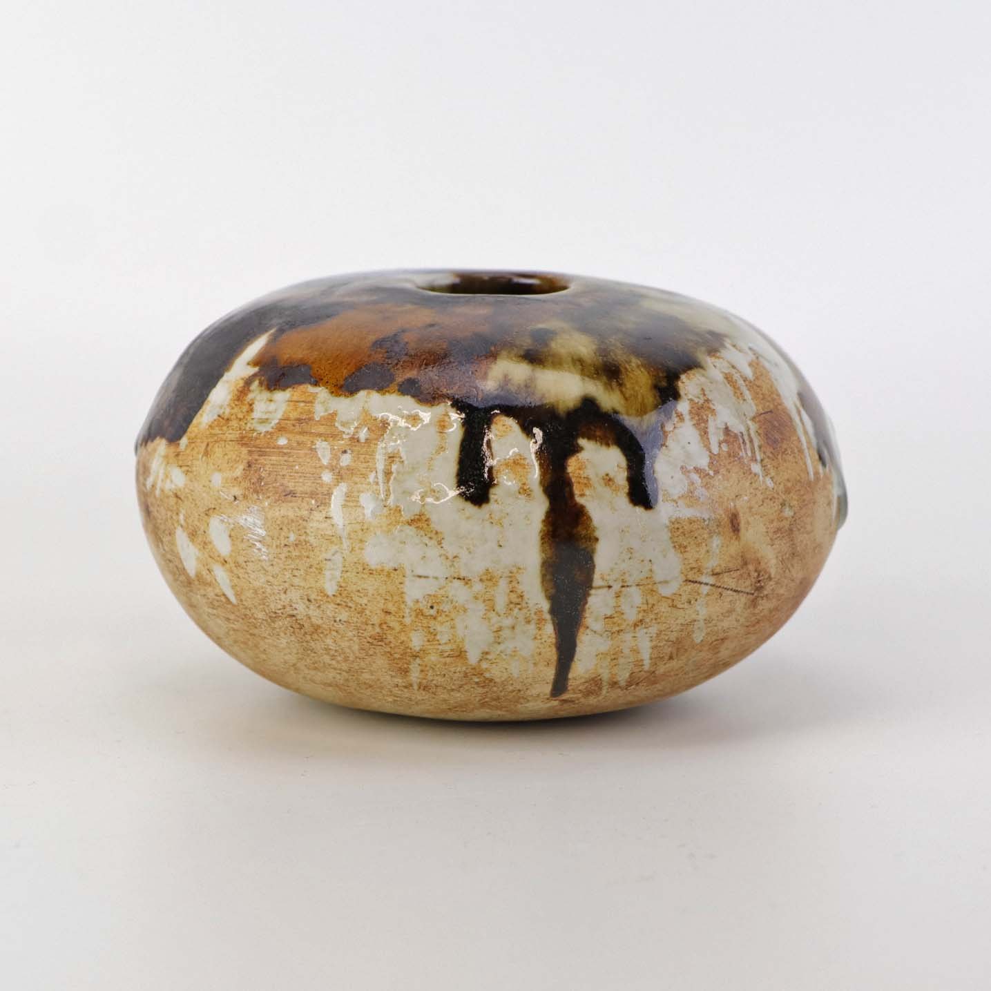 Beskrivelse: Lav rund vase i keramik. Delvist glaseret med flerfarvet mat og glansfuld glasur.