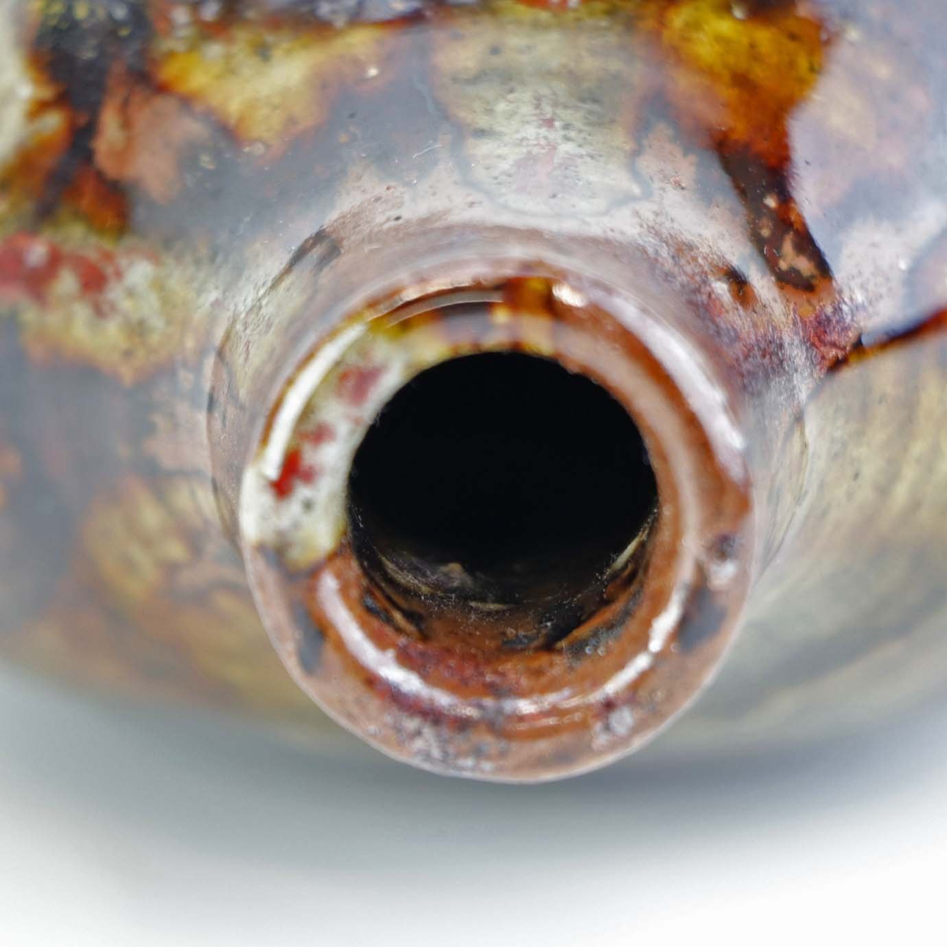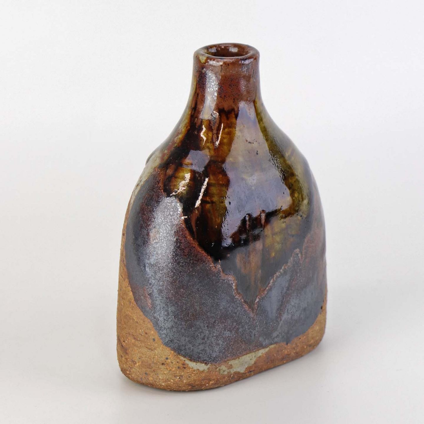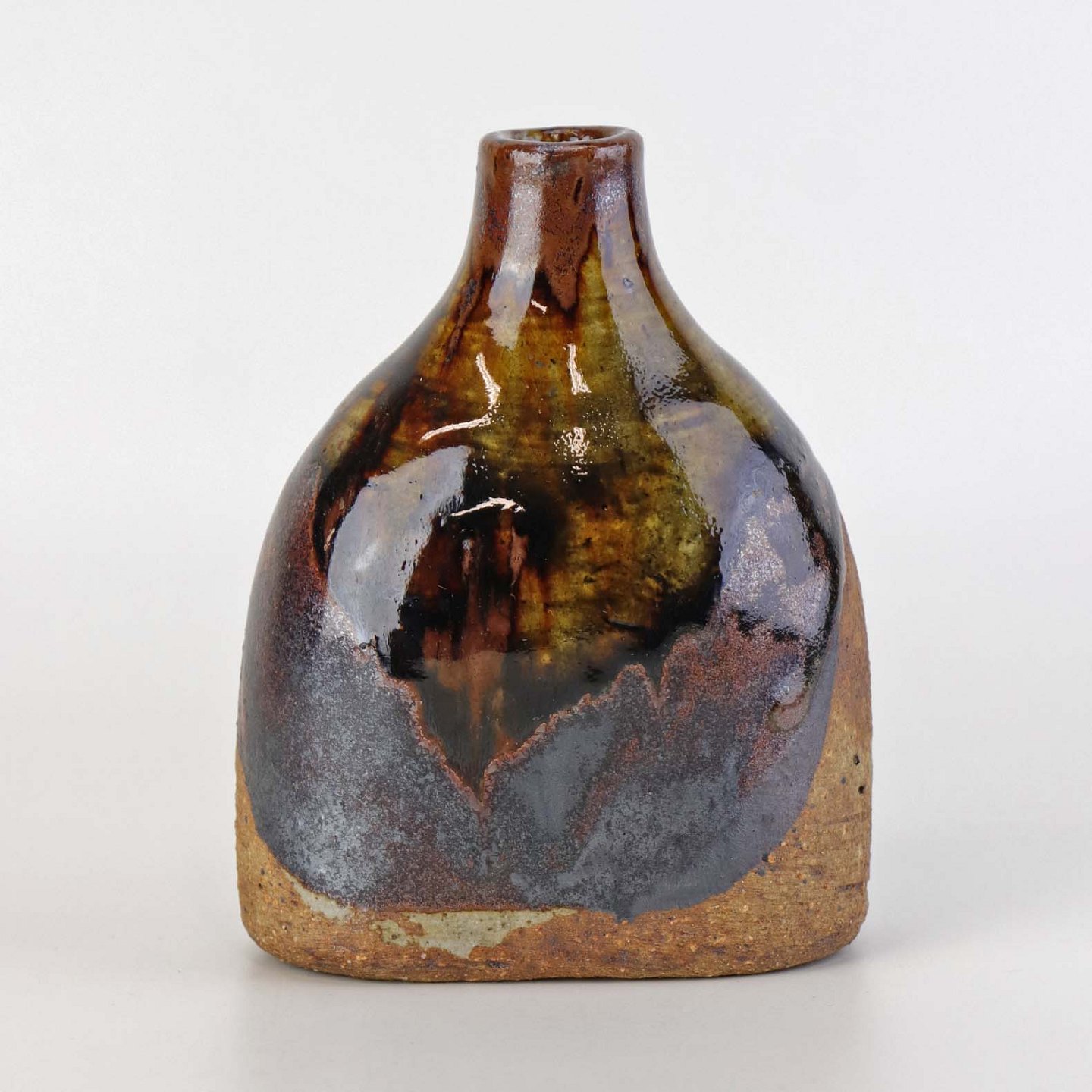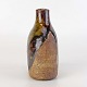 Beskrivelse: Lille flaskeformet vase i keramik med flerfarvet glansfuld og mat glasur.