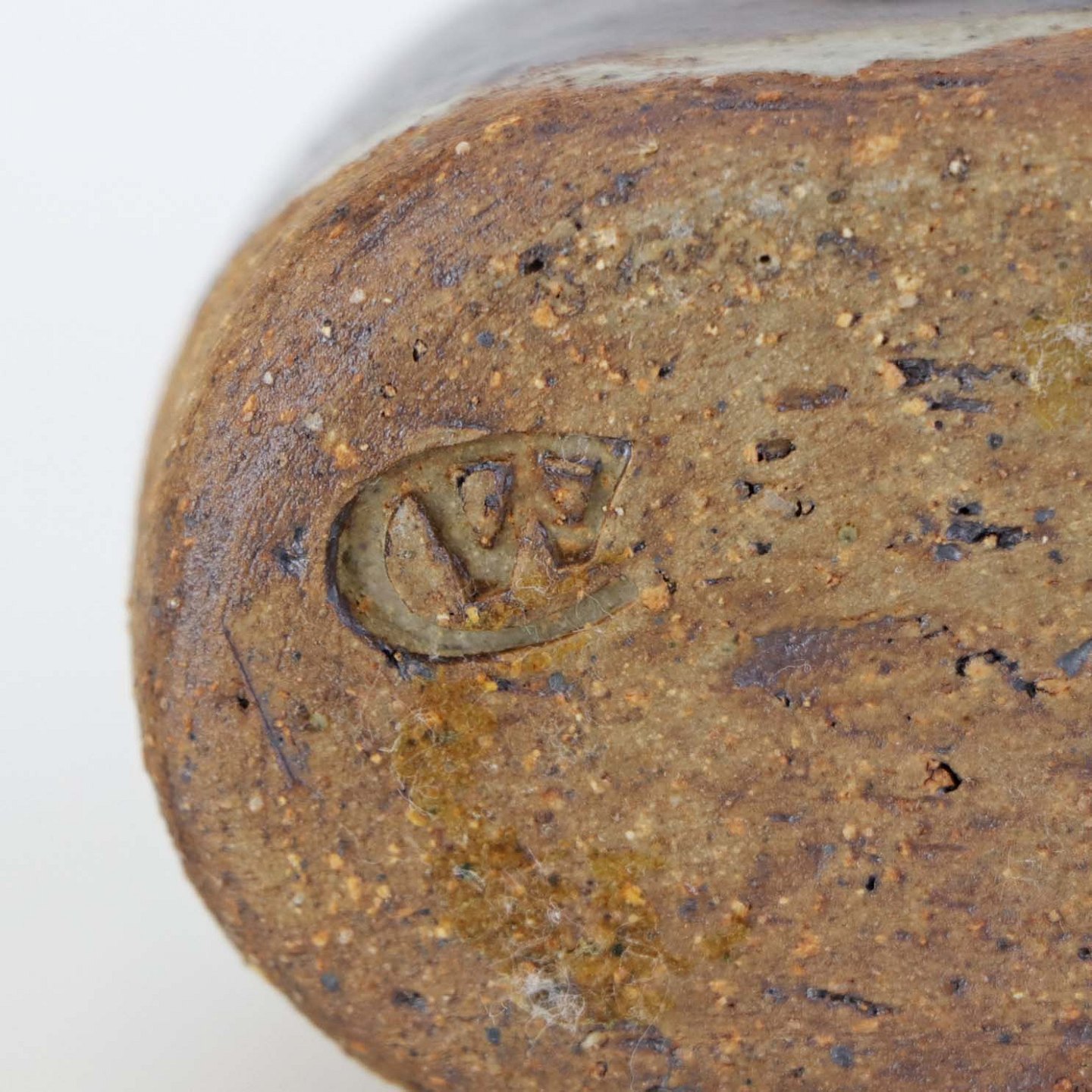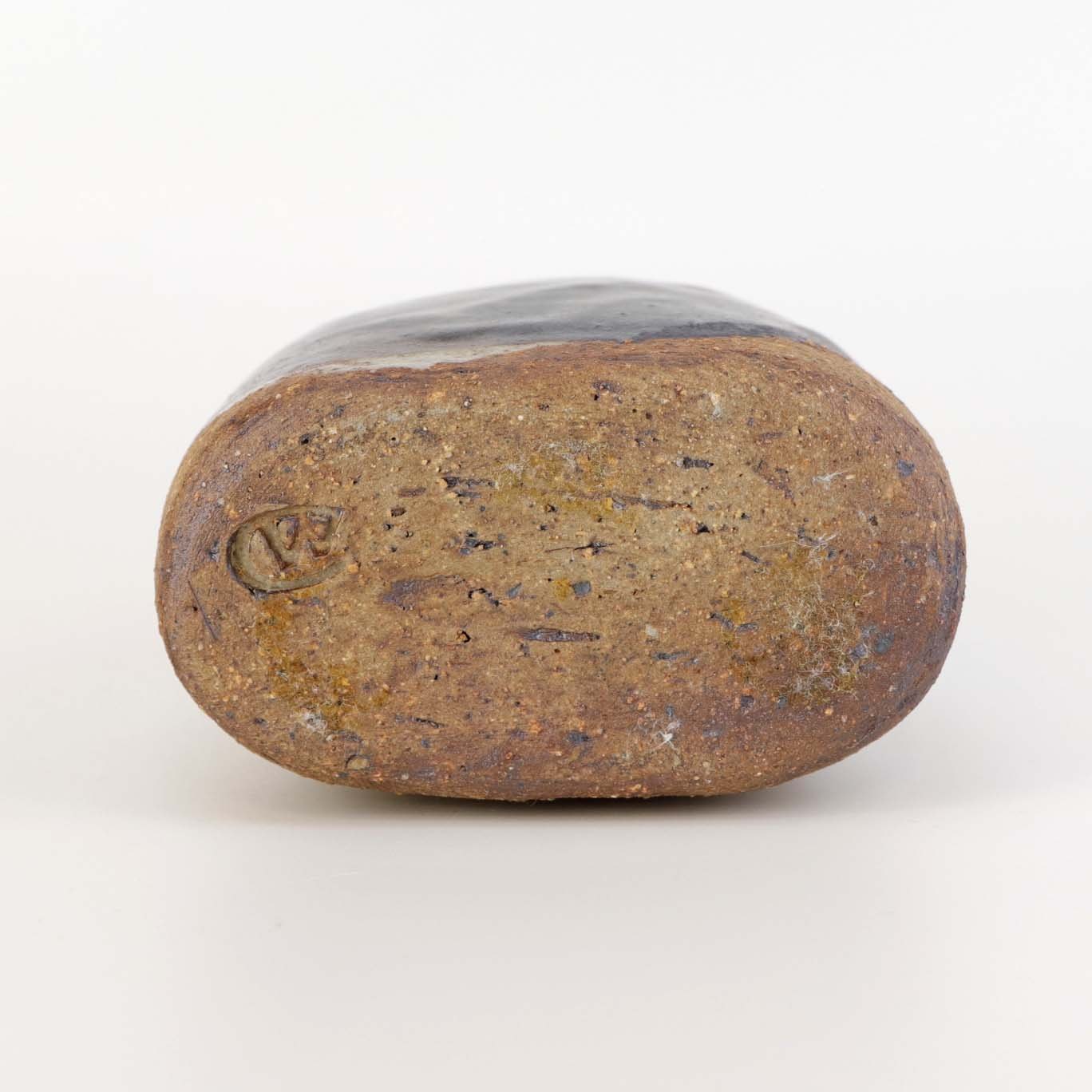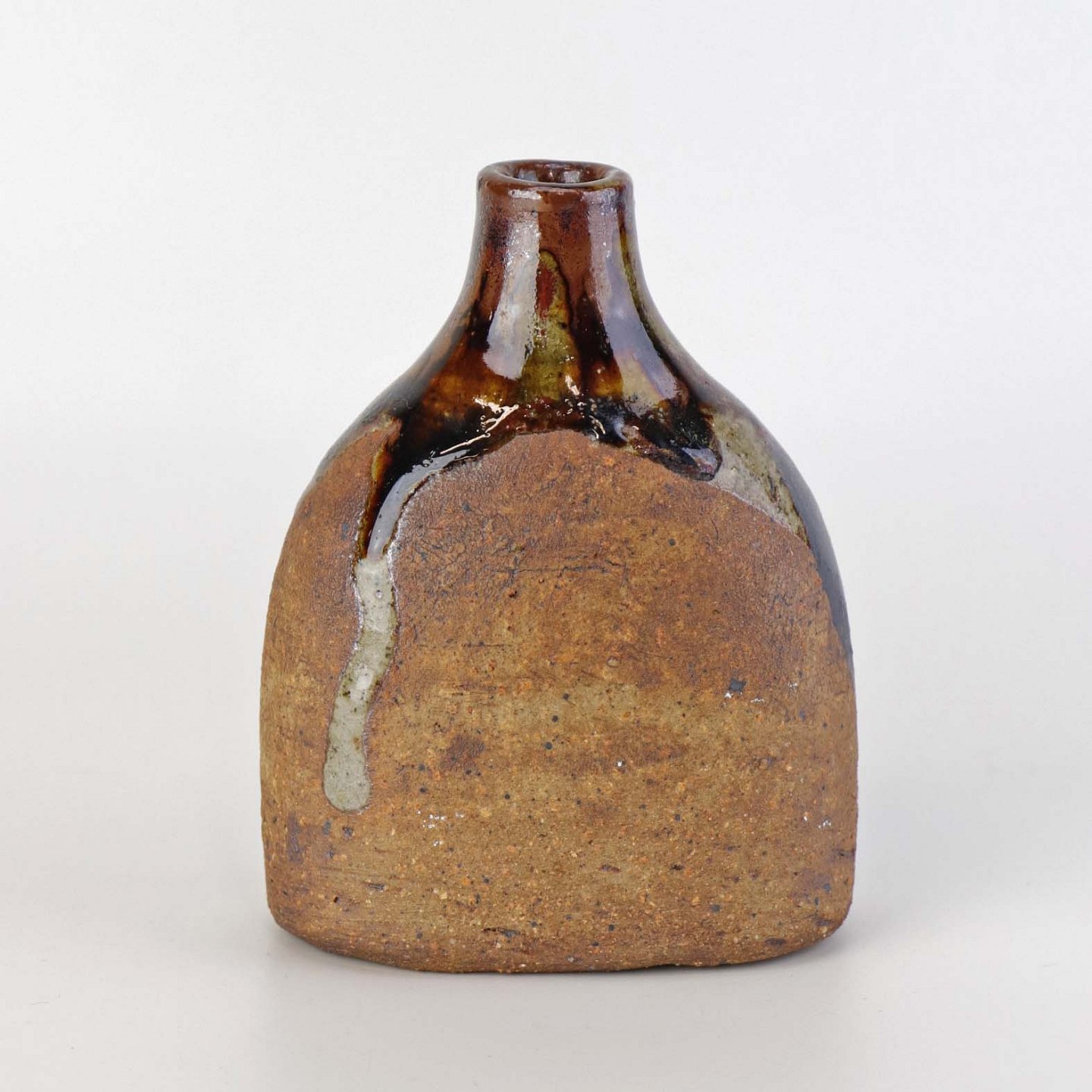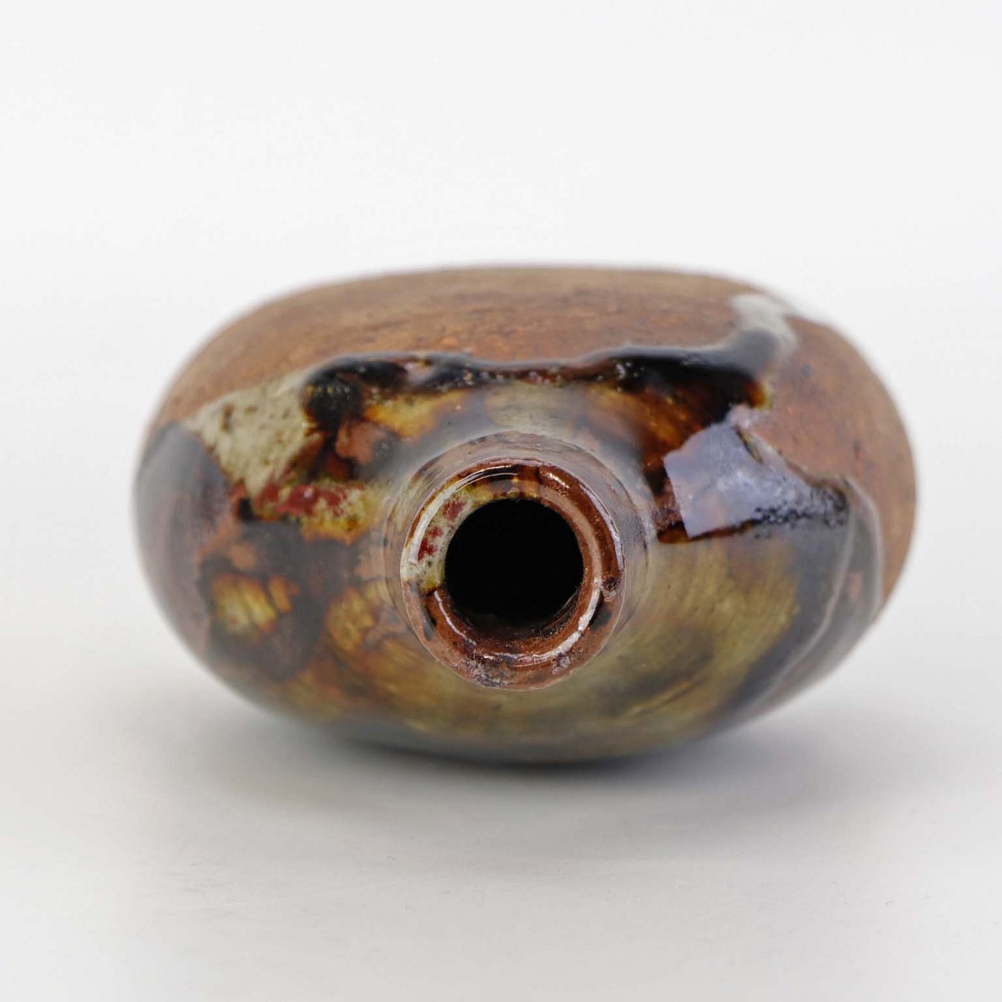 Beskrivelse: Lille flaskeformet vase i keramik med flerfarvet glansfuld og mat glasur.
