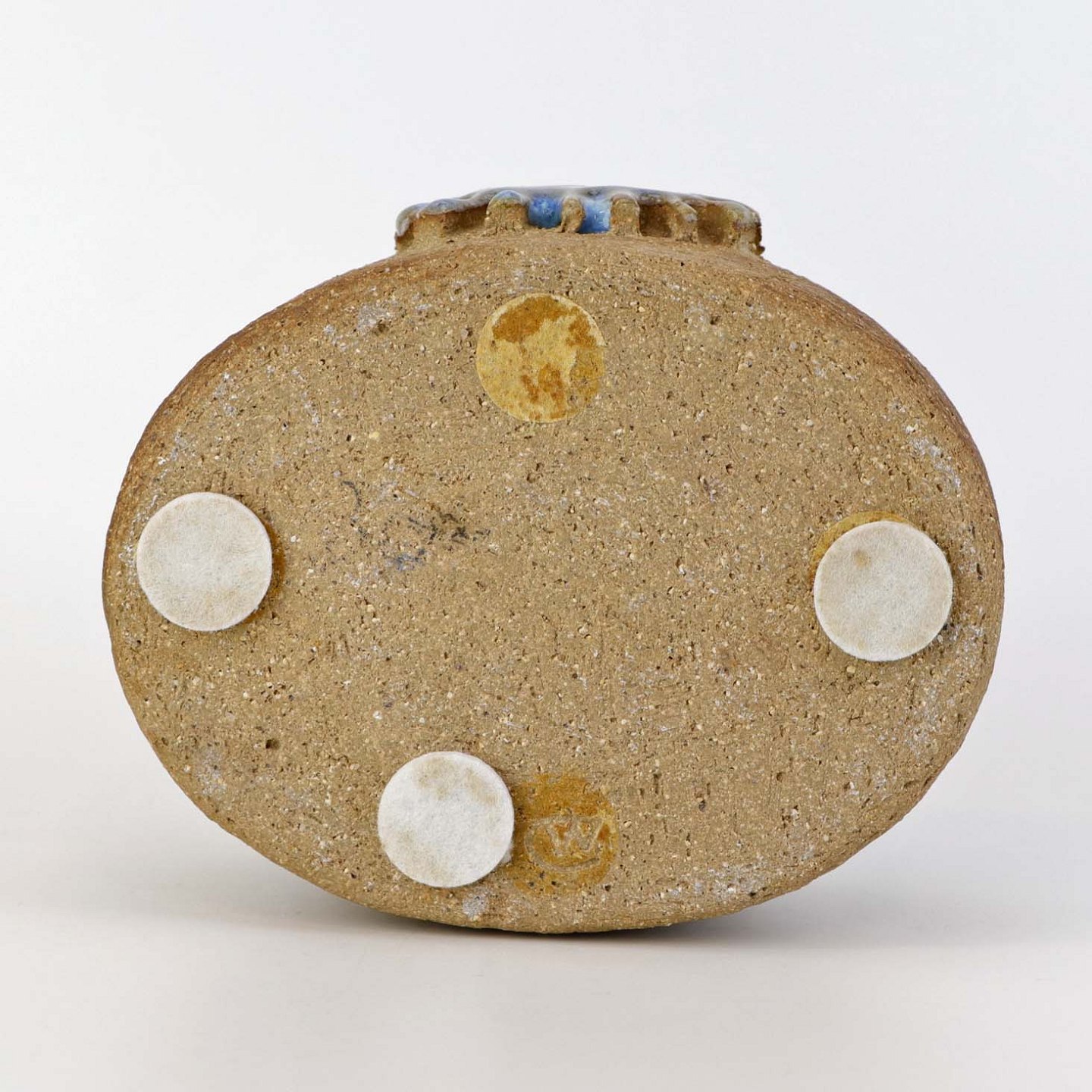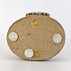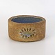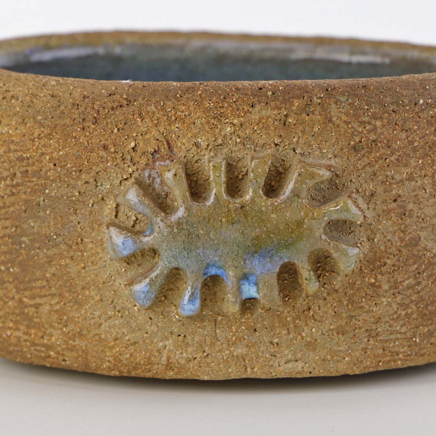 Beskrivelse: Lille oval skål i keramik med lysblå glasur på indersiden samt delvist glaseret sol mønster på ydersiden.