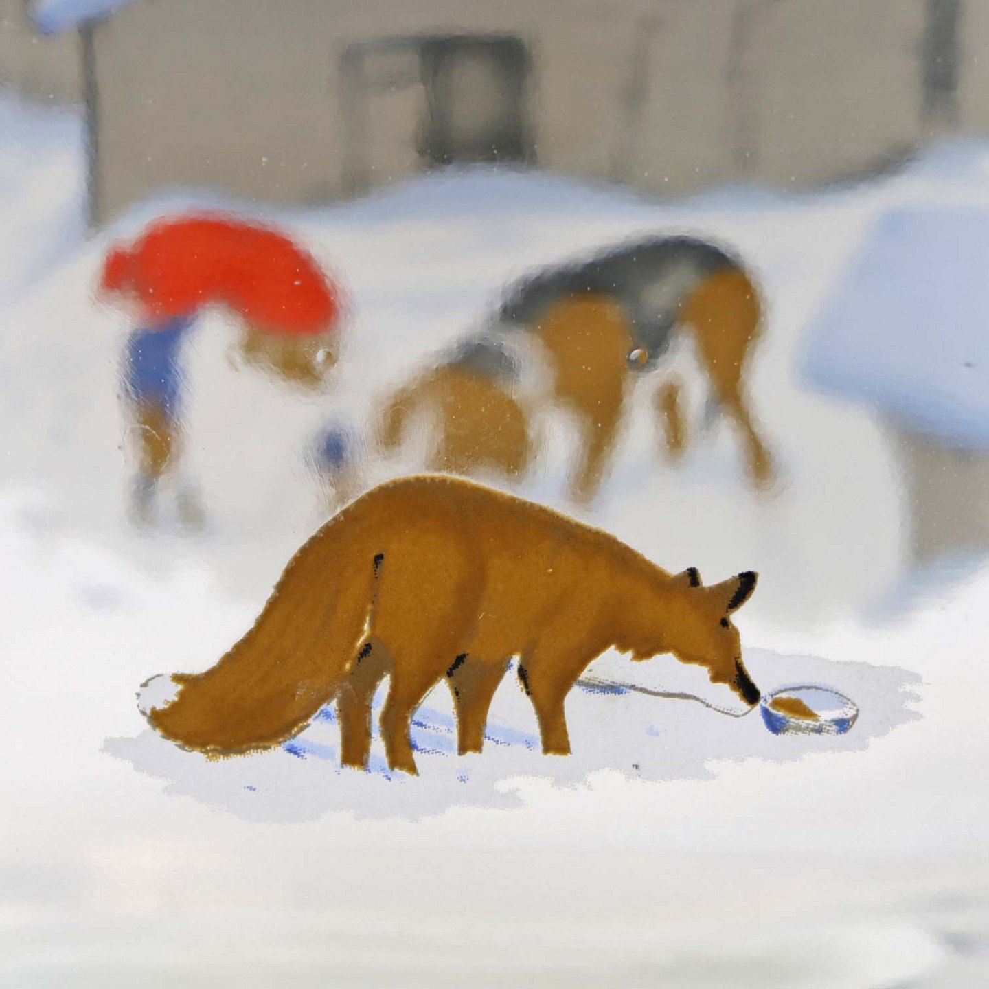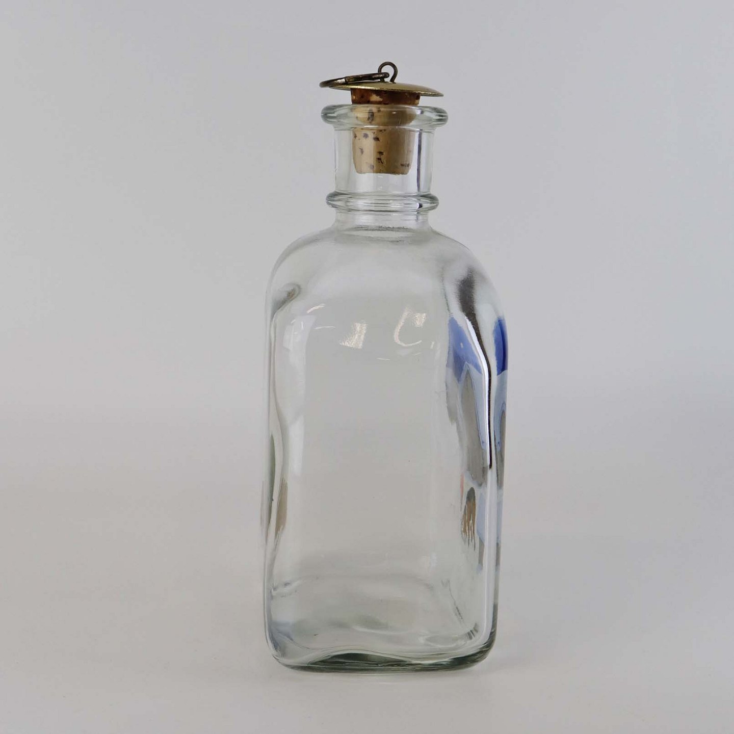 Beskrivelse: Dramflaske i glas med julemotiv af Nisse, hund og ræv efter tegning af Harald Wibergs. Snapseflasken kommer med korkprop.