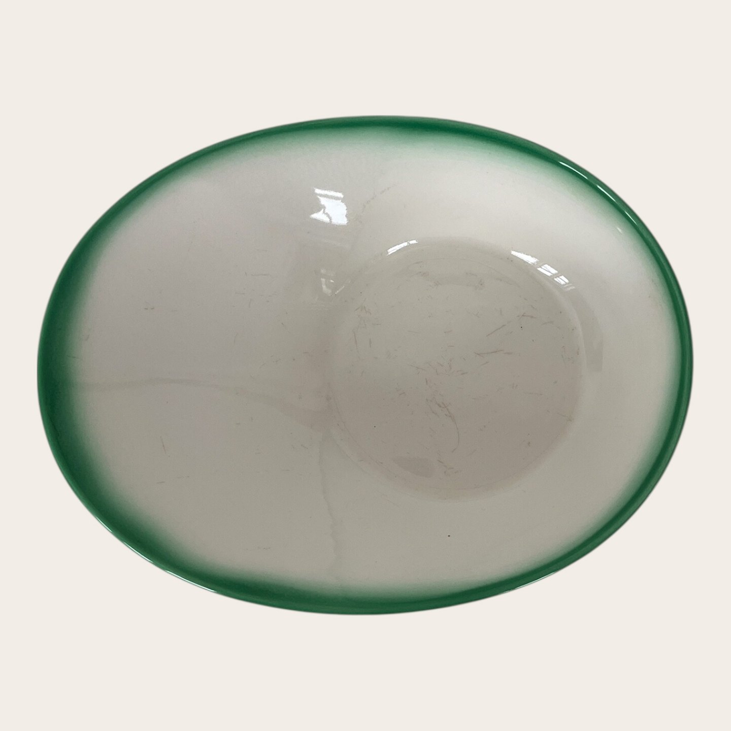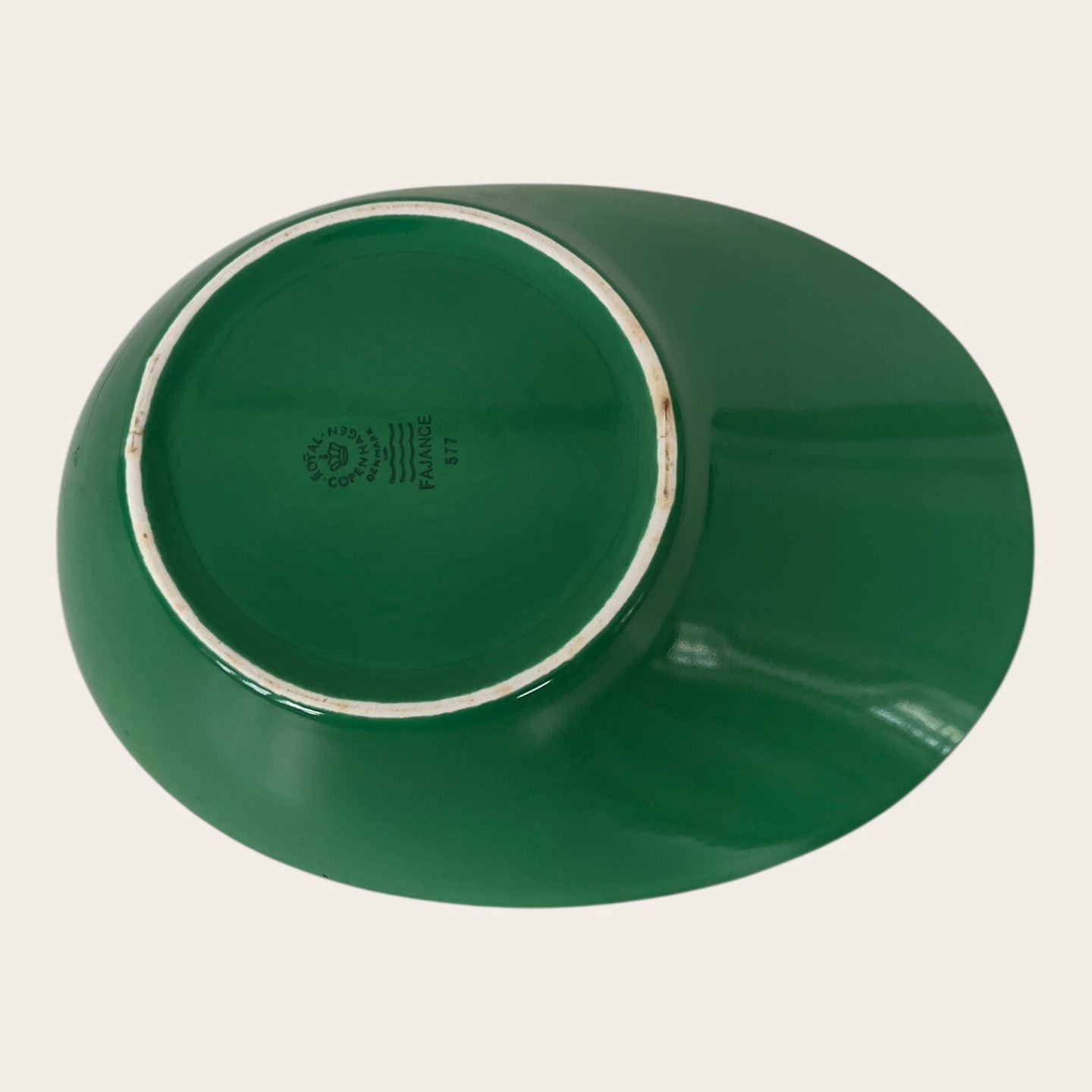 Beskrivelse: Royal Copenhagen / Aluminia, Ursula #577, Asymmetrisk grøn/ hvid skål, 1. sortering, 23,5cm lang, 18cm bred, 6cm høj, Design Ursula Munch Petersen *Med brugsspor*