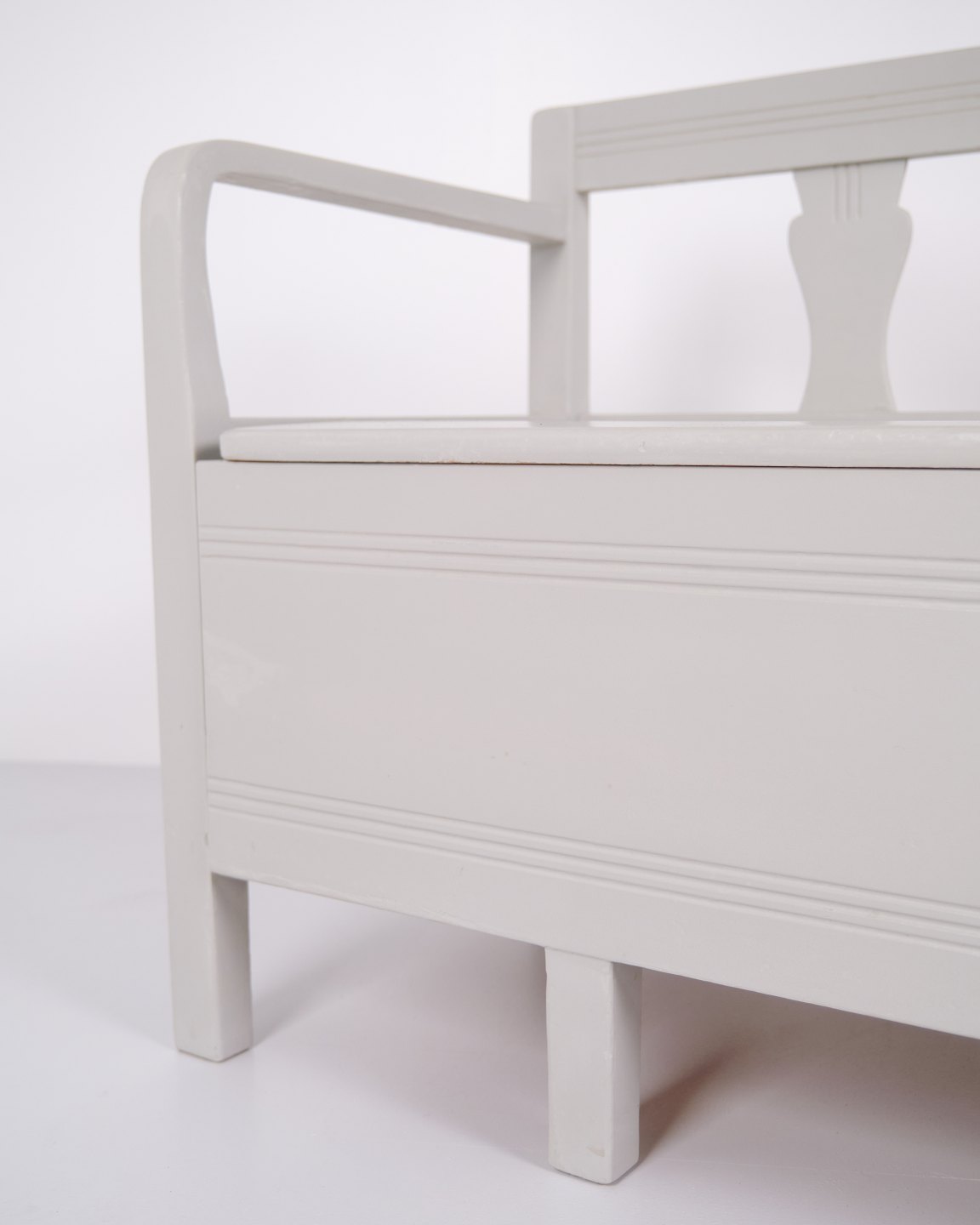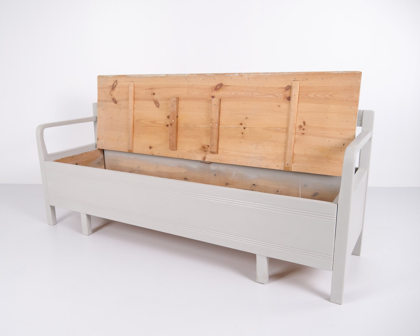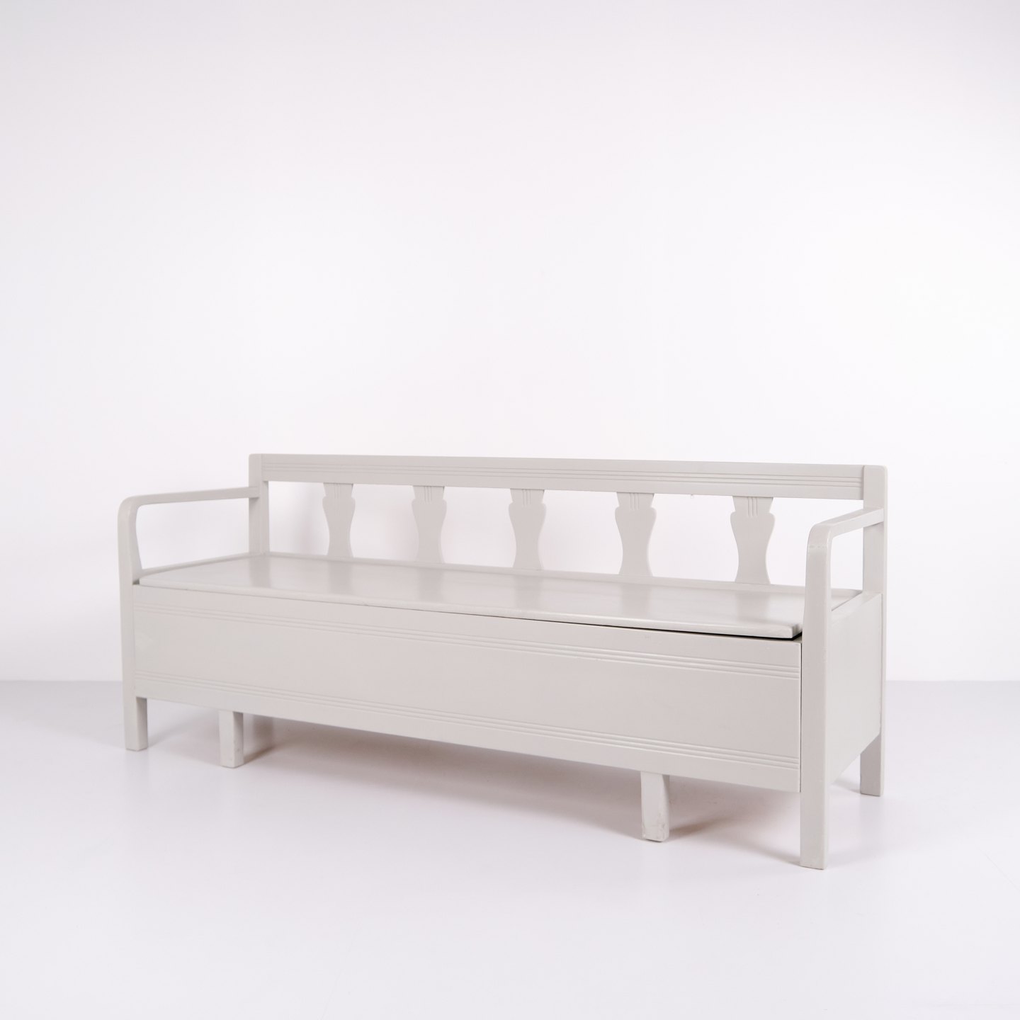 Beskrivelse: Antik slagbænk fra 1860’erne i gråmalet fyrretræ. Klassisk almuedesign med siddeplads og opbevaring. Historisk og funktionelt møbel.