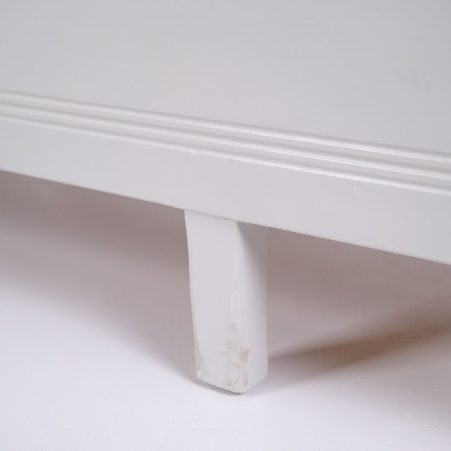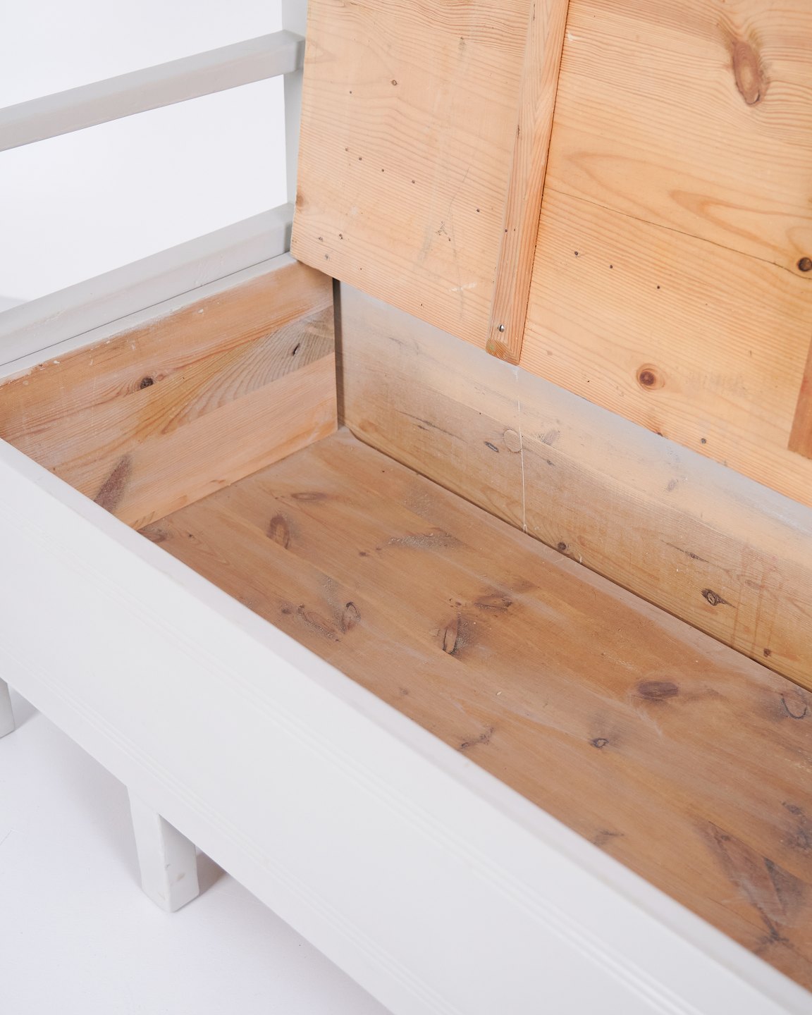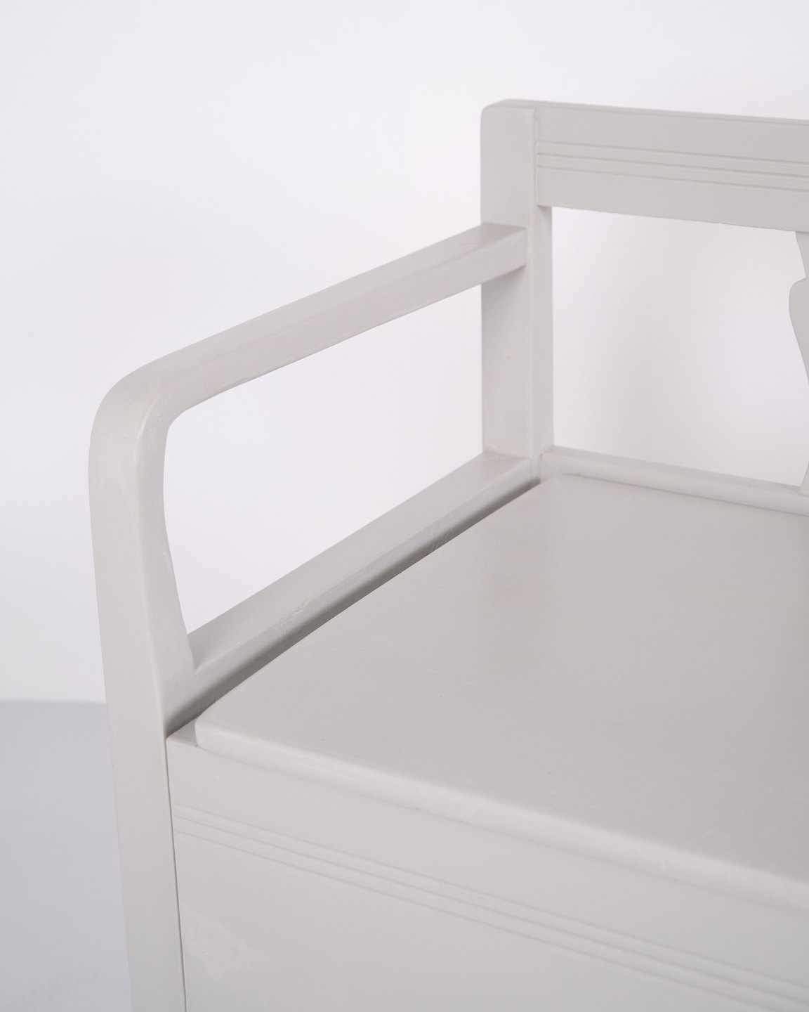 Beskrivelse: Antik slagbænk fra 1860’erne i gråmalet fyrretræ. Klassisk almuedesign med siddeplads og opbevaring. Historisk og funktionelt møbel.
