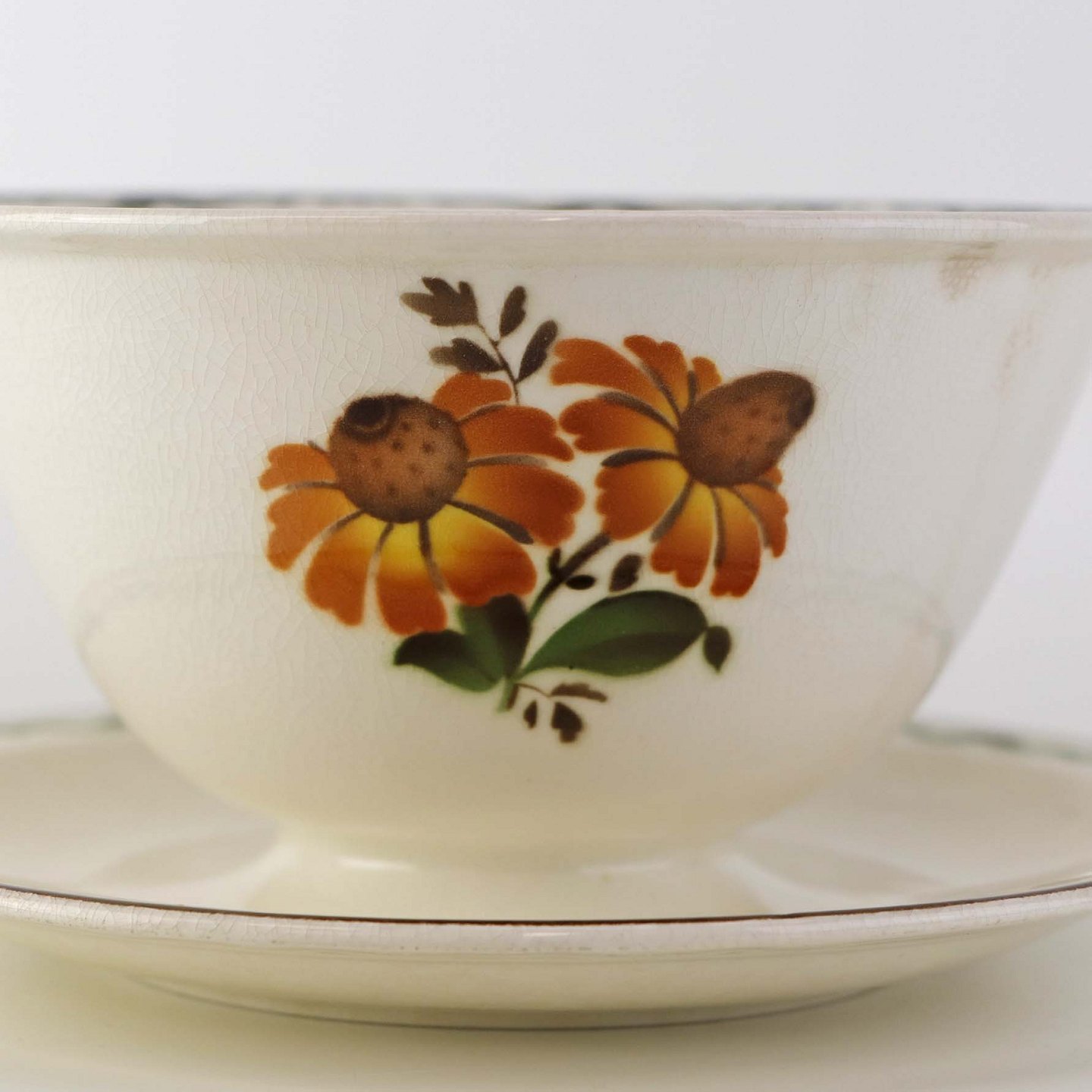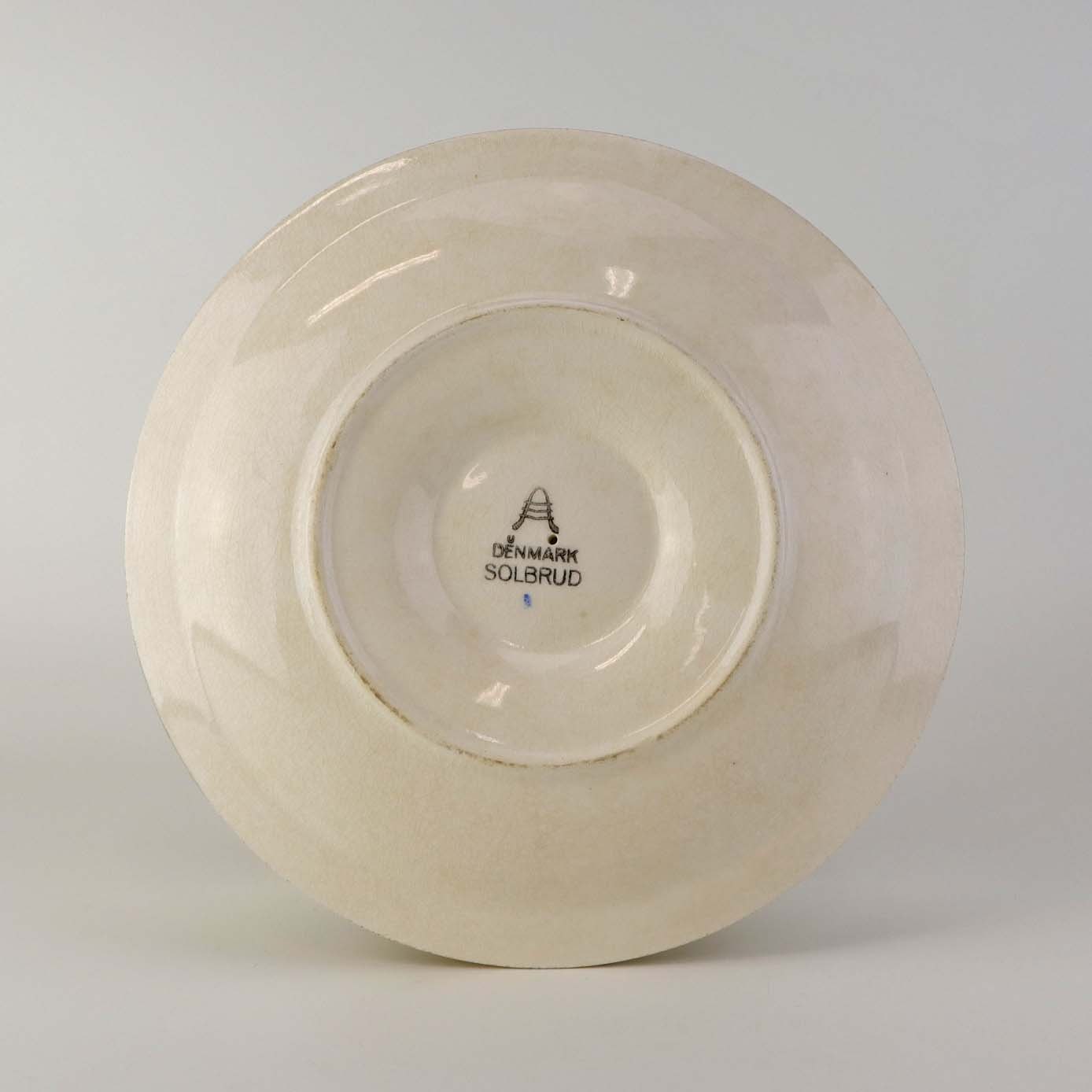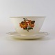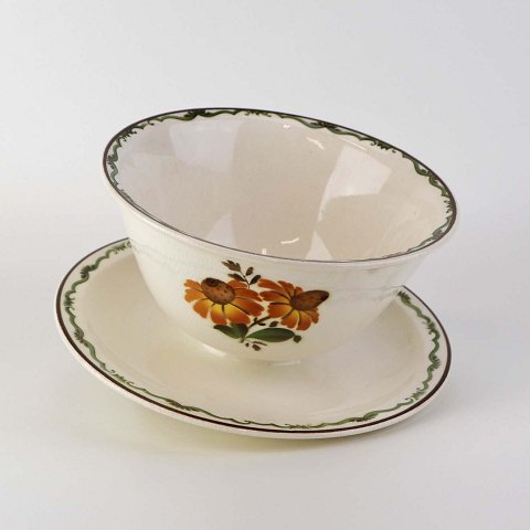 Beskrivelse: Sovseskål på fast fod i fajance fra stellet Solbrud fremstillet i perioden 1937-1967