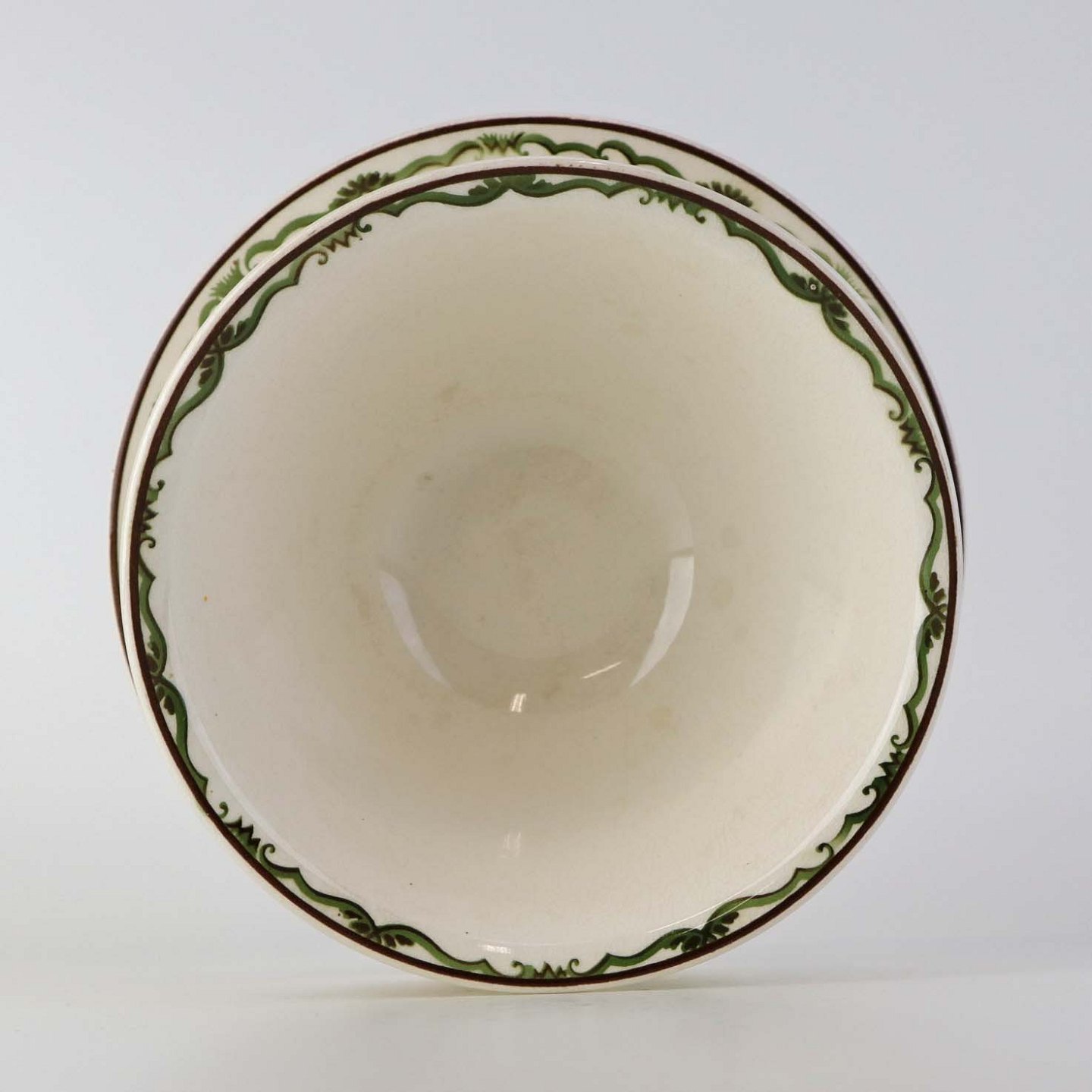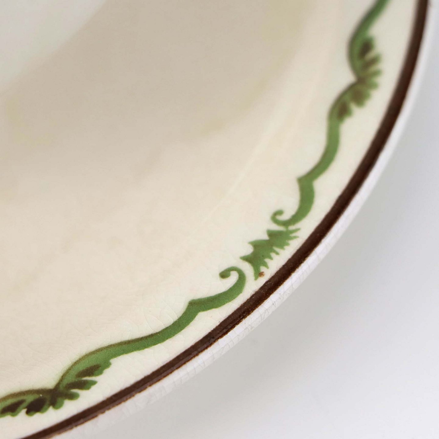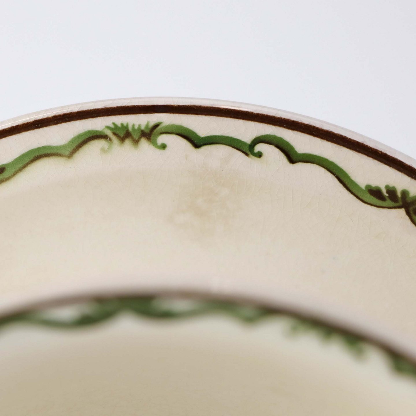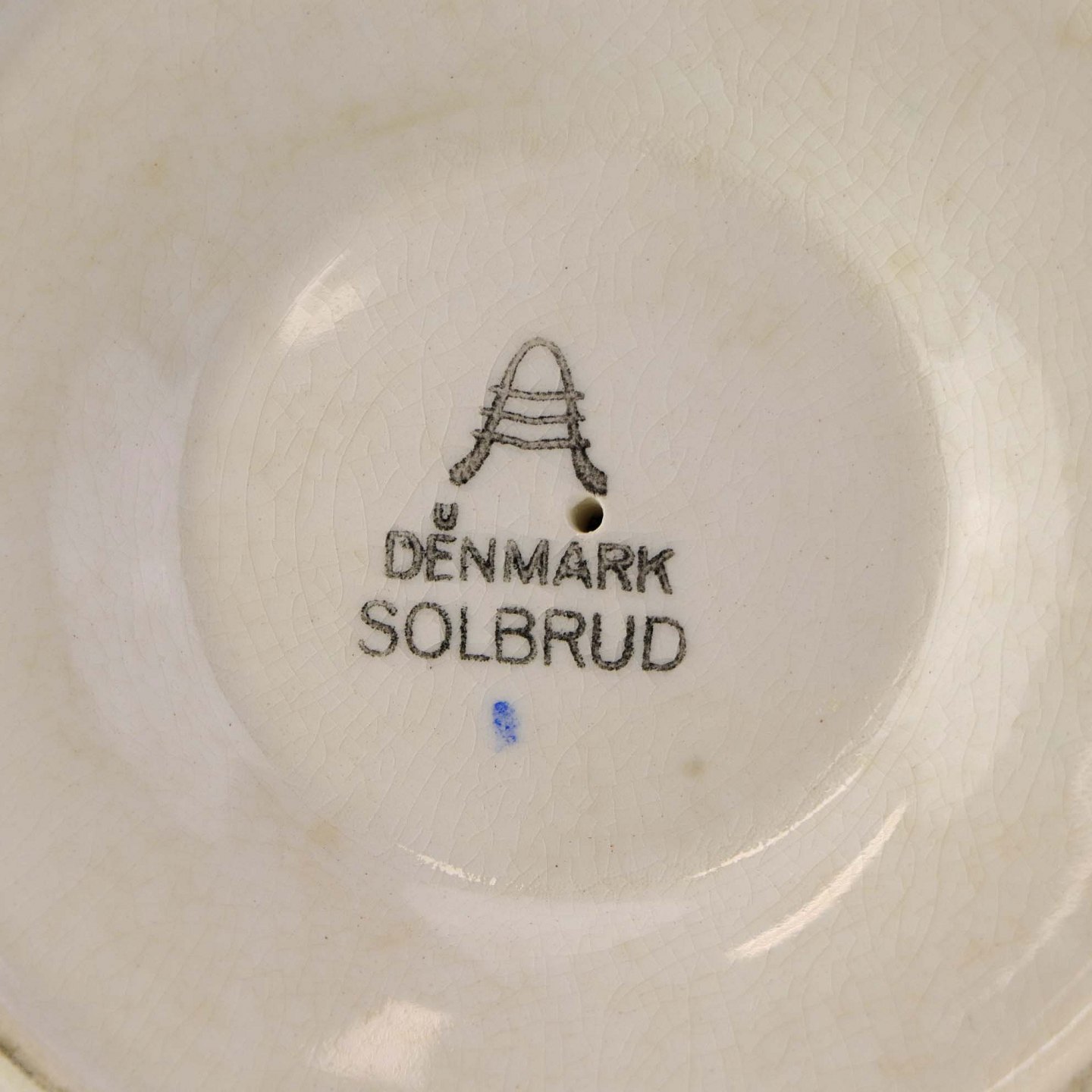 Fremstår med krakkeleringer samt steder med bruneringer under glasuren.