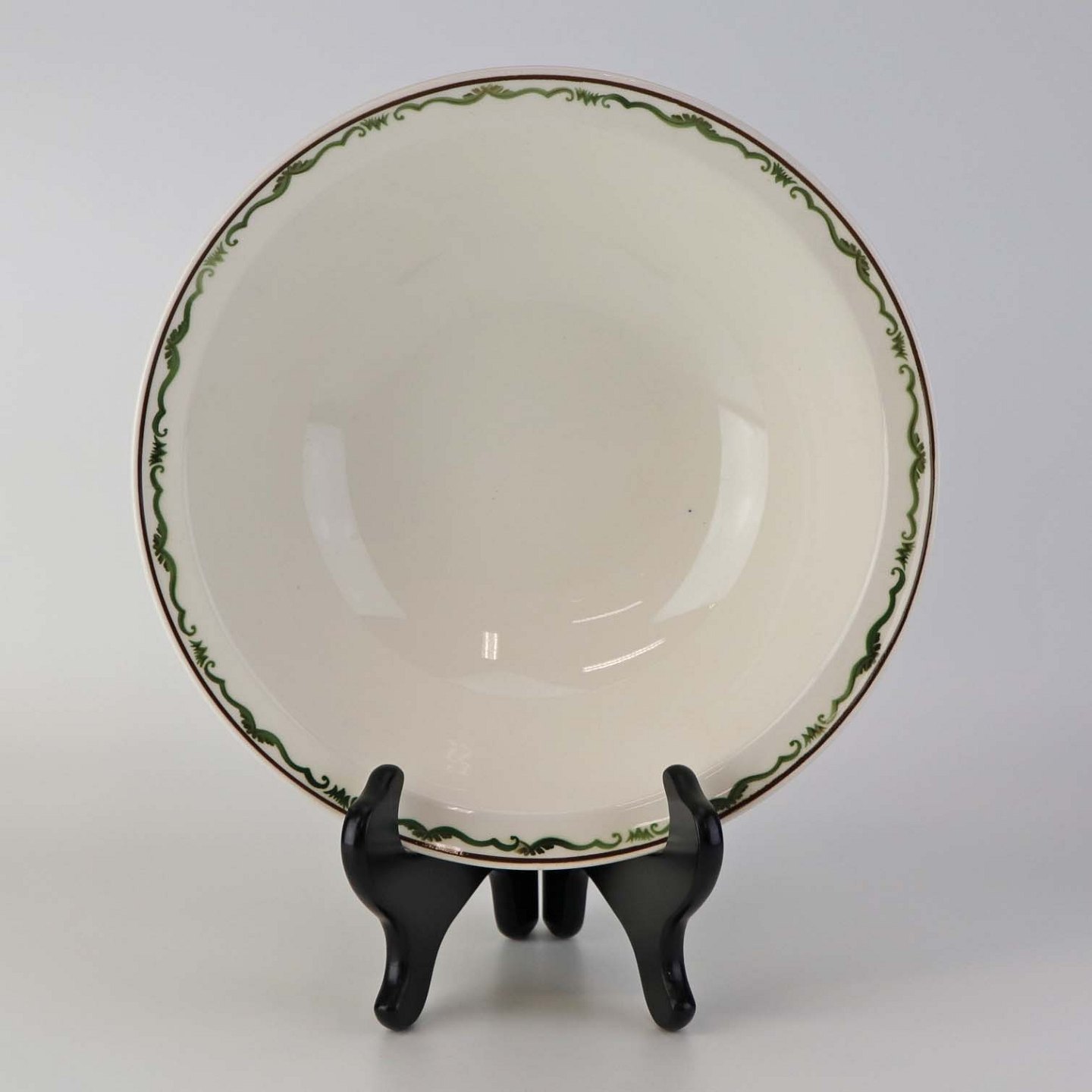 Fajancestel i stelform G med dekoration af orangegule blomster og grønne guirlander på lys baggrund med brun kant.