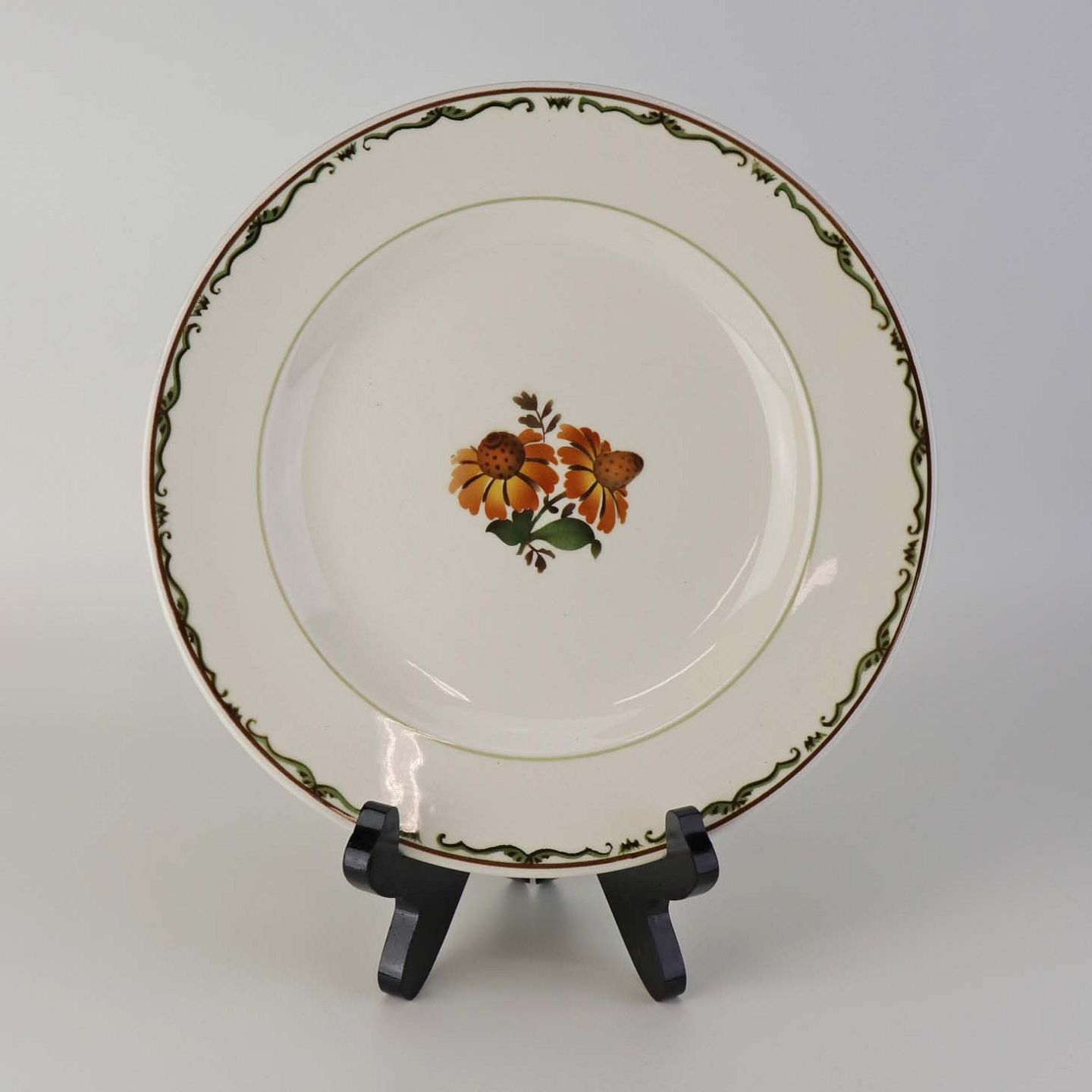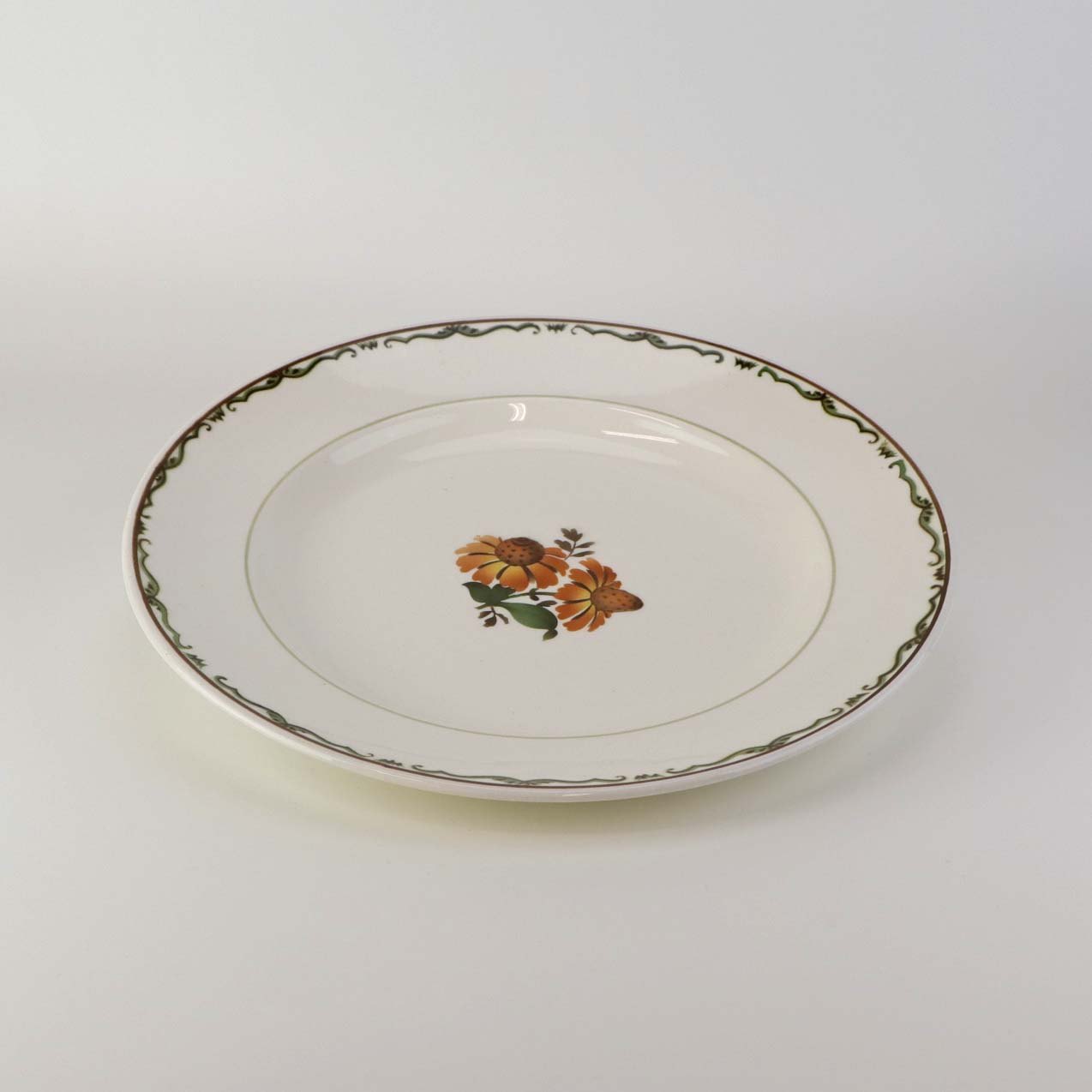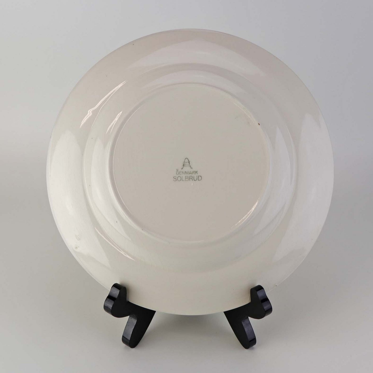 Beskrivelse: Middagstallerken i fajance fra stellet Solbrud fremstillet i perioden 1937-1967