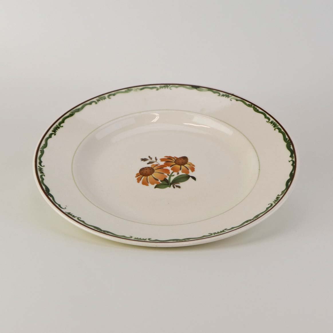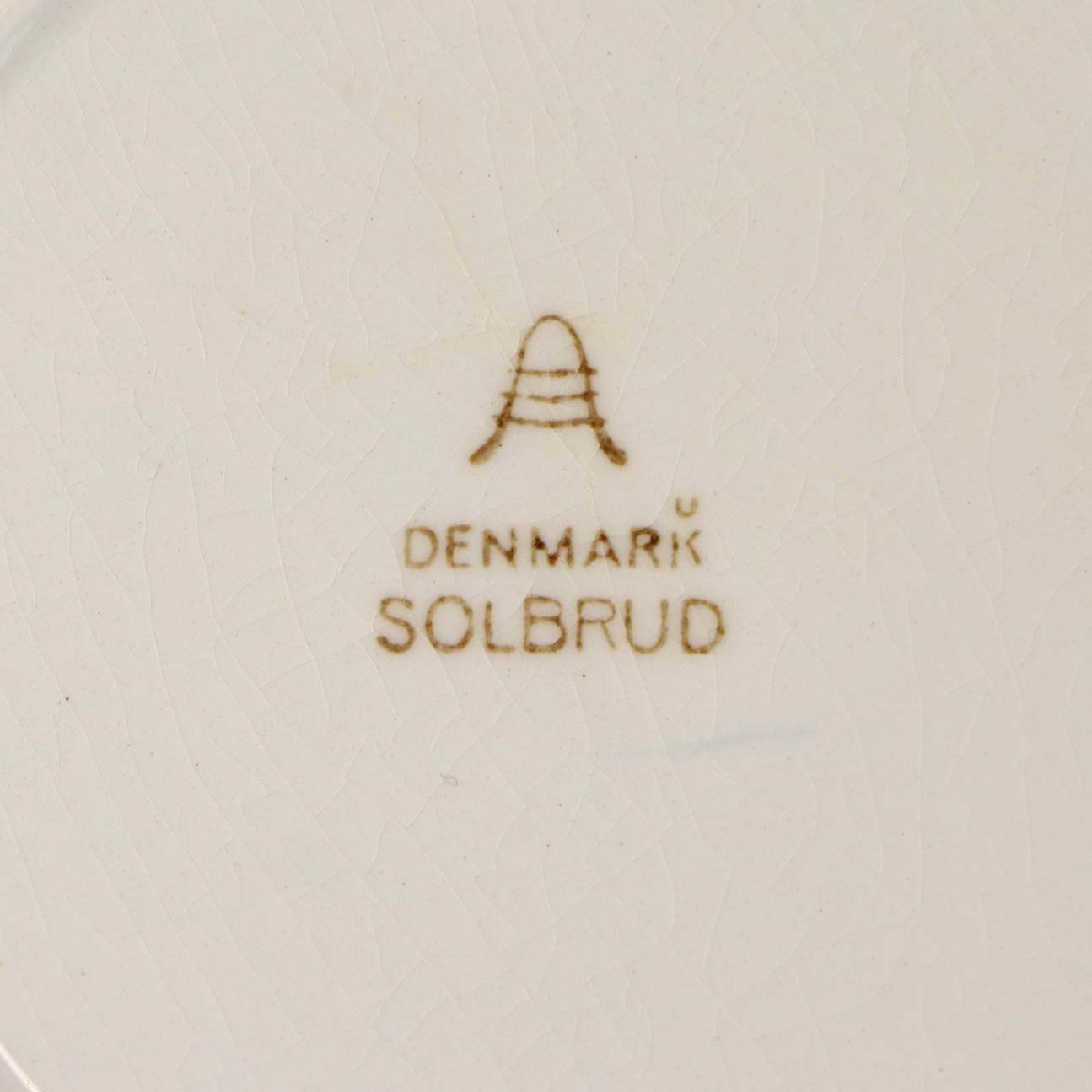 Beskrivelse: Desserttallerken i fajance fra stellet Solbrud fremstillet i perioden 1937-1967