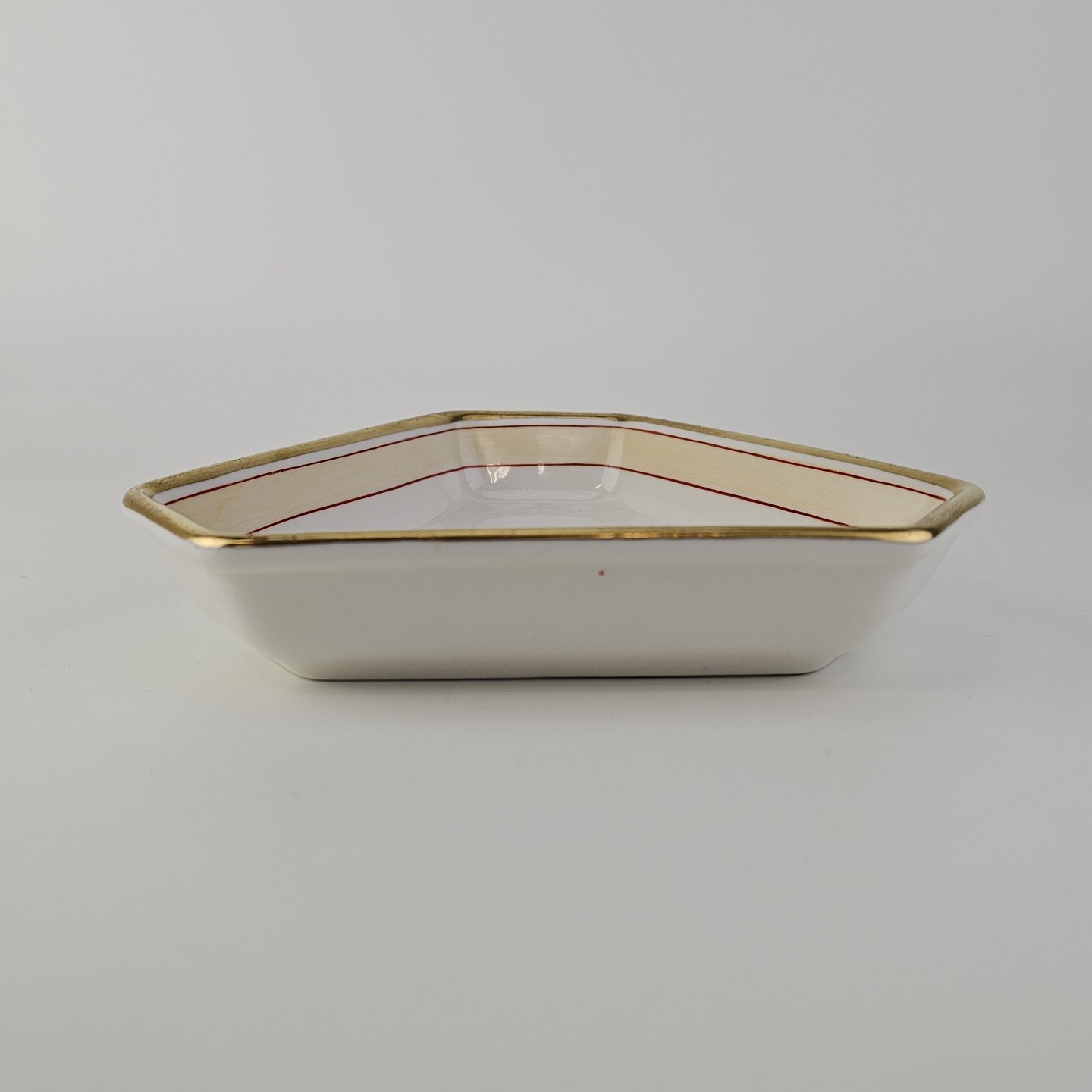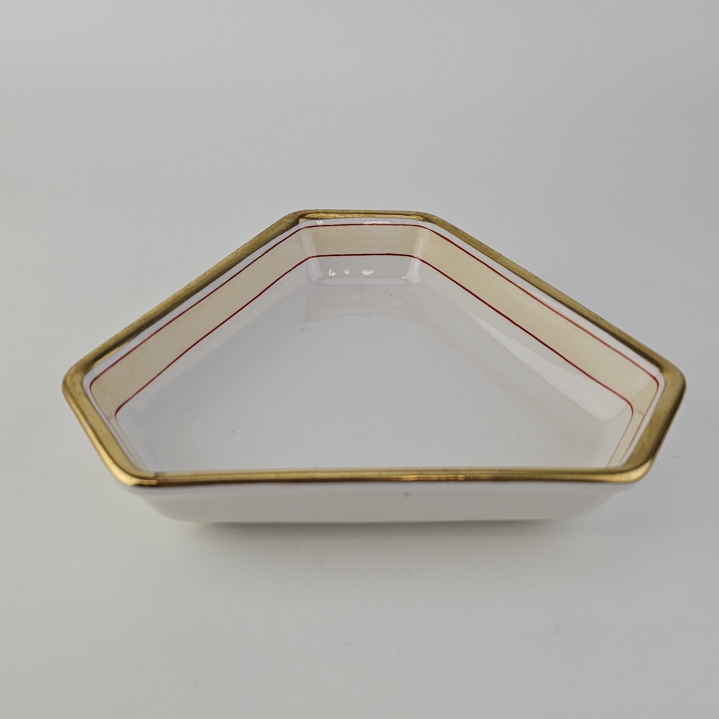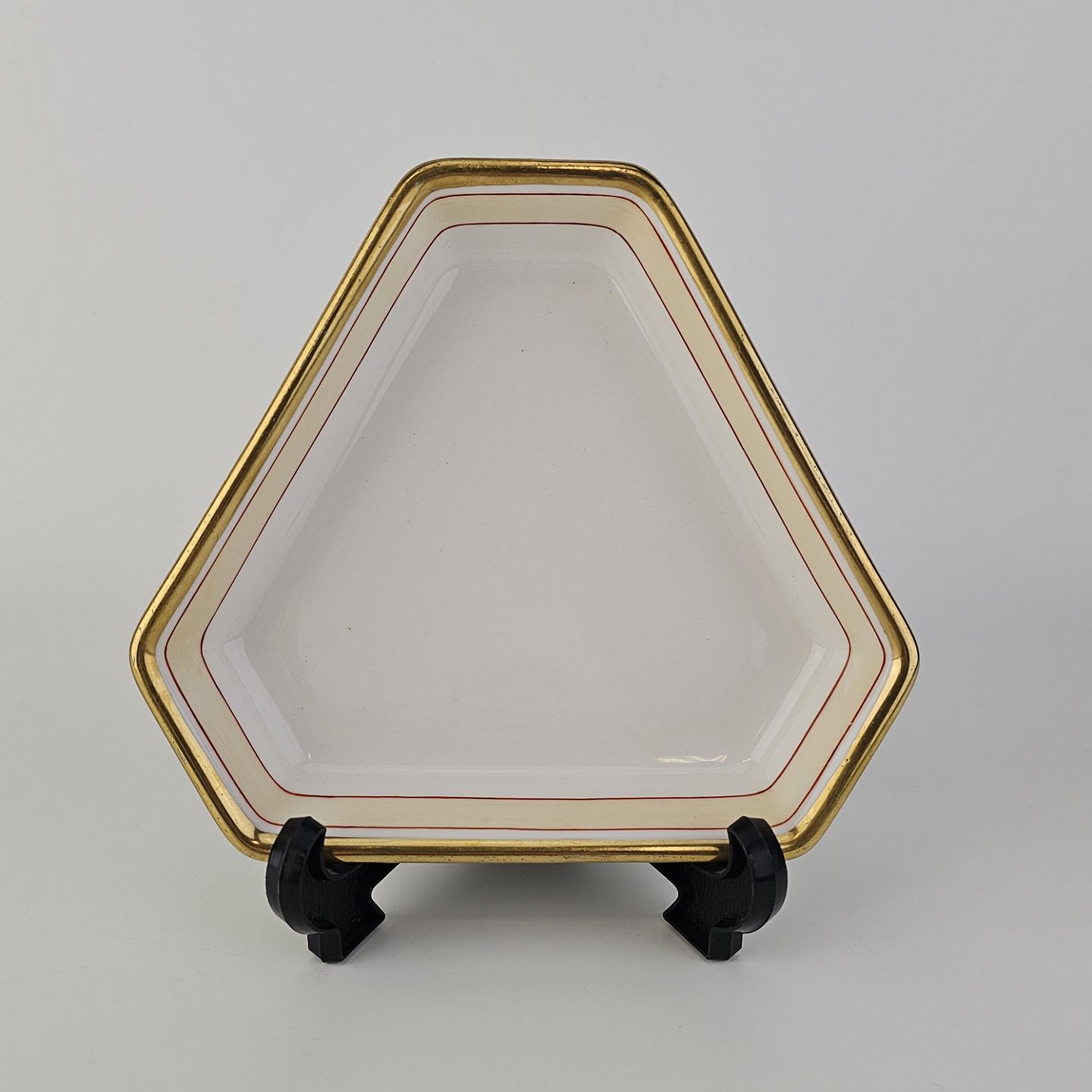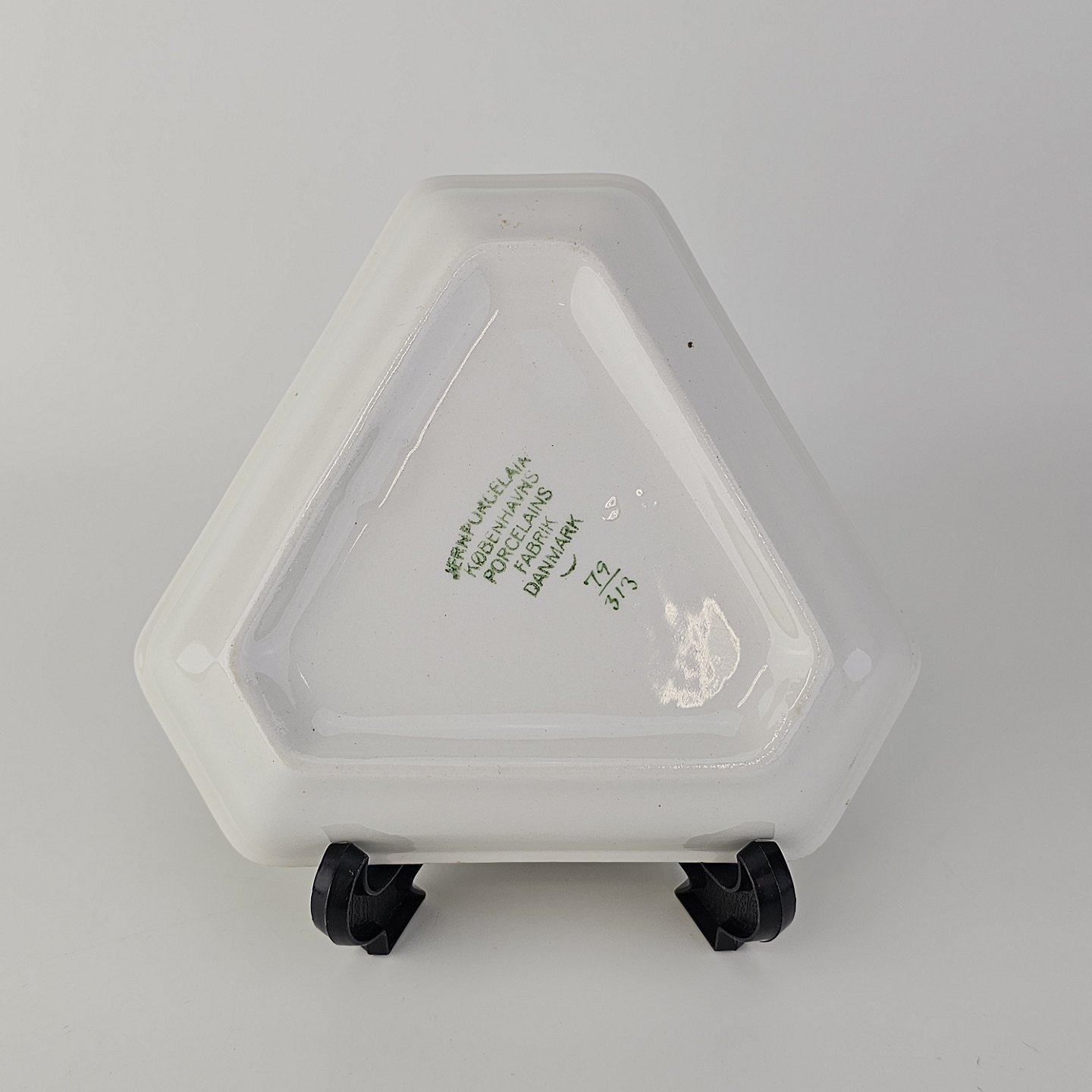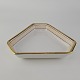 Beskrivelse: Trekantet fad i kongeligt porcelæn fra stellet Det spanske stel.