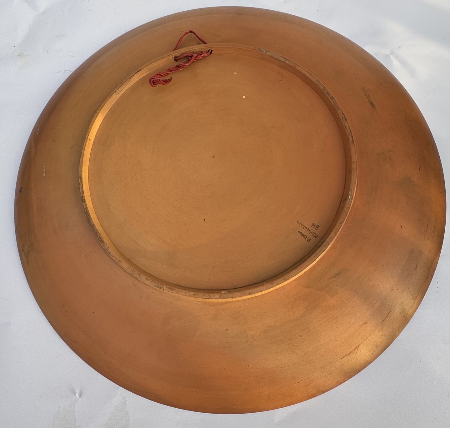 Beskrivelse: Meget stor platte terracotta fra Peter Ipsen, Kjøbenhavn fra omkring 1900. Bemalet med tre storke ved storkerede. Lidt overflade brugsspor. Ingen skader eller reparationer. Fabriksmærket på bagsiden. Mål: H. 4 cm Ø. 37 cm