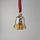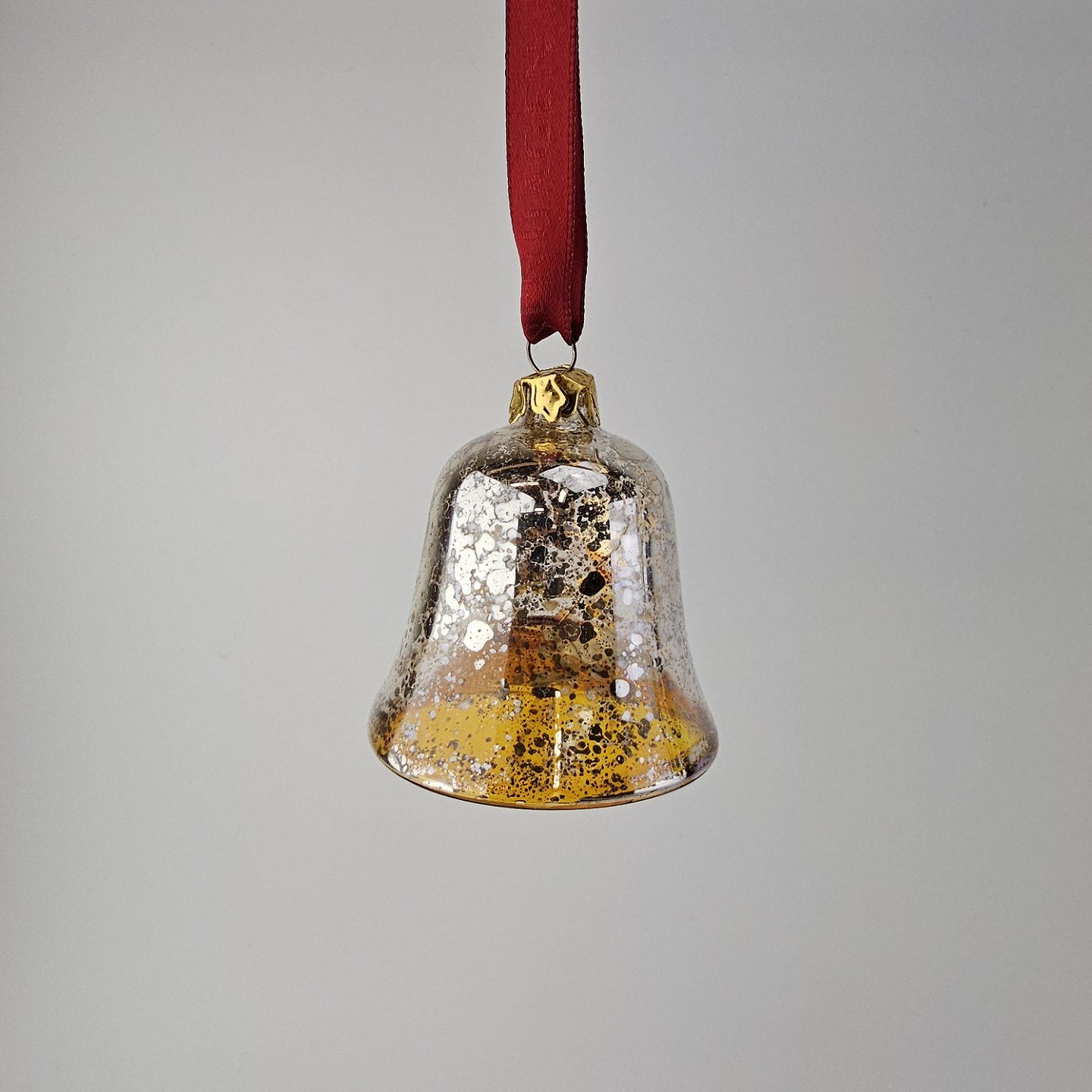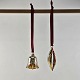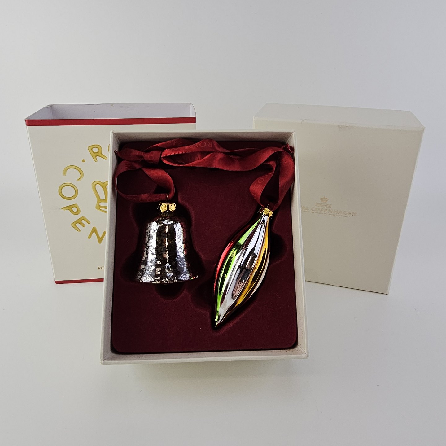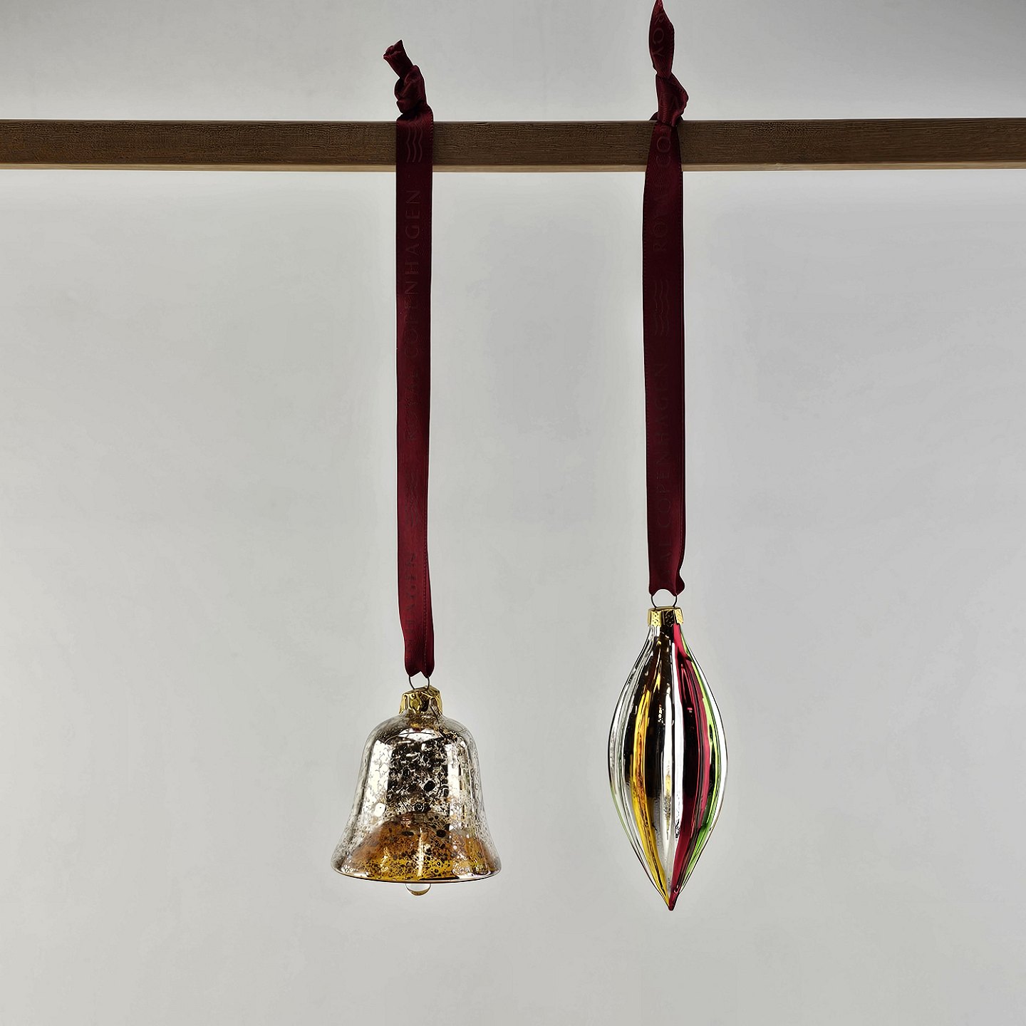 Beskrivelse: Juleornamenter i glas med motiv af en klokke og en aflang julekugle med rødt bånd til ophæng