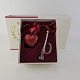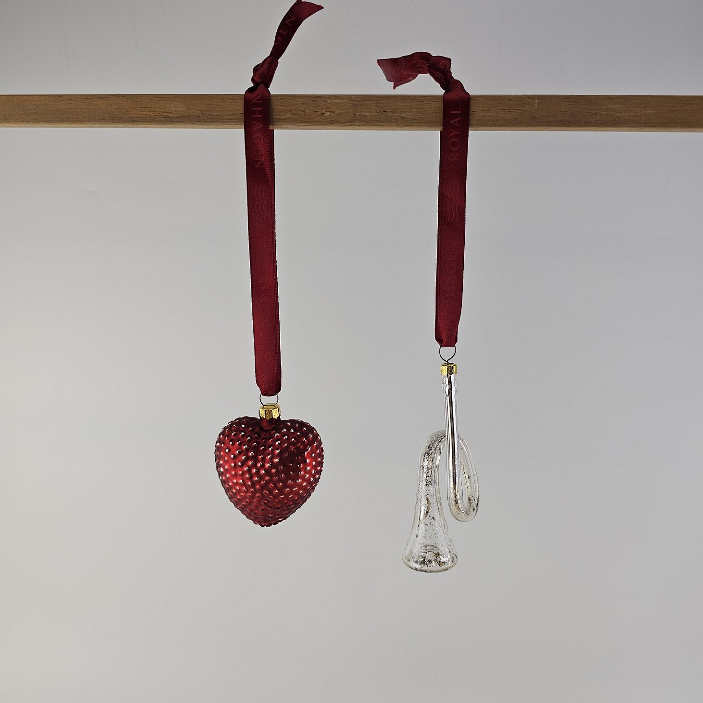 Beskrivelse: Juleornamenter i glas med motiv af et hjerte og en trompet med rødt bånd til ophæng
