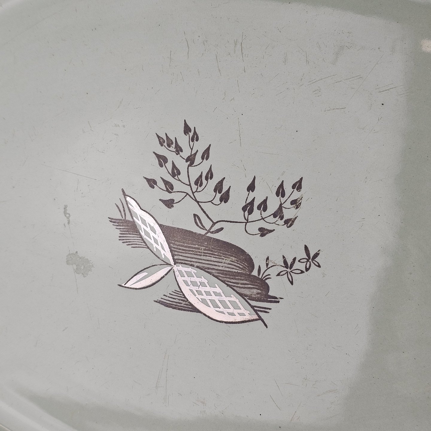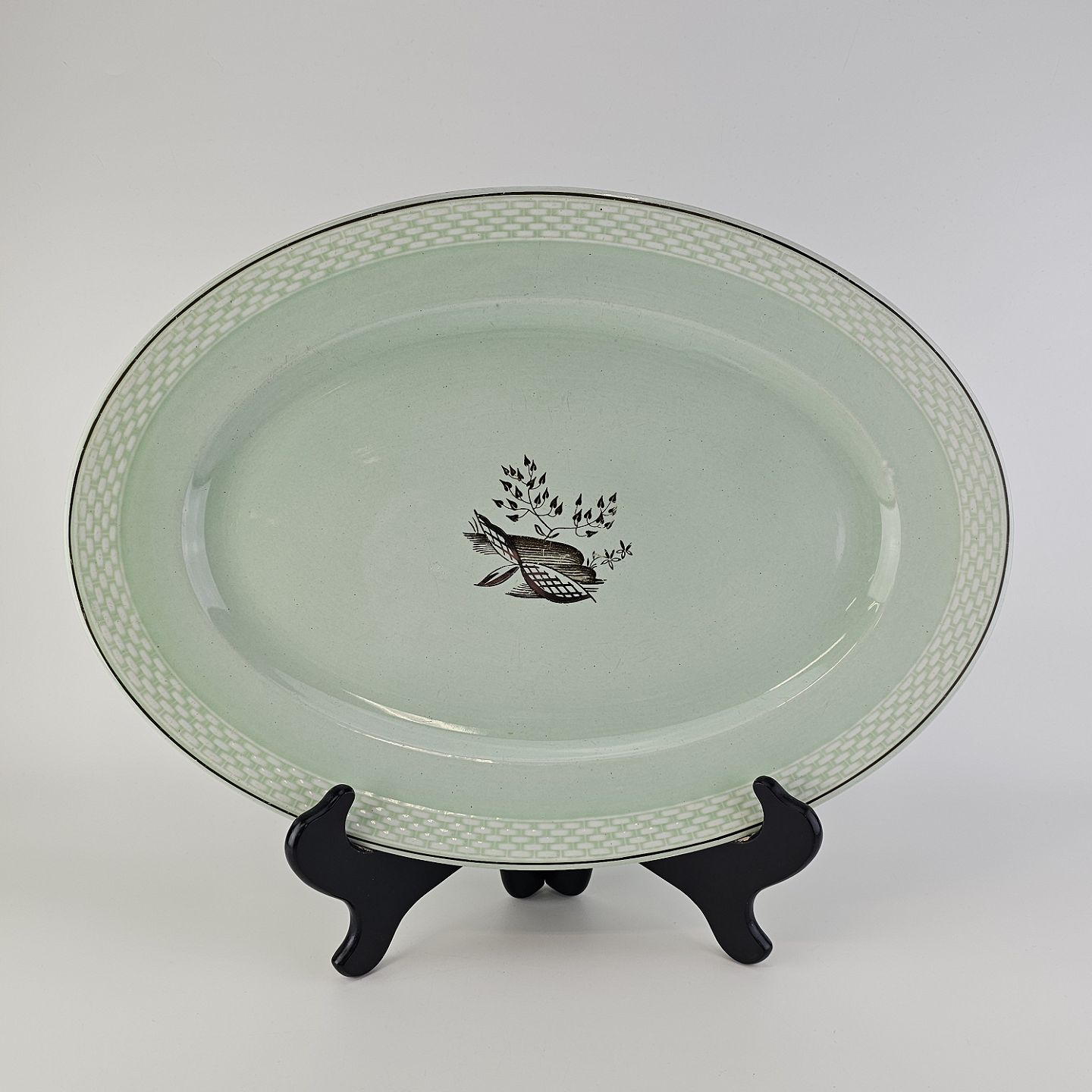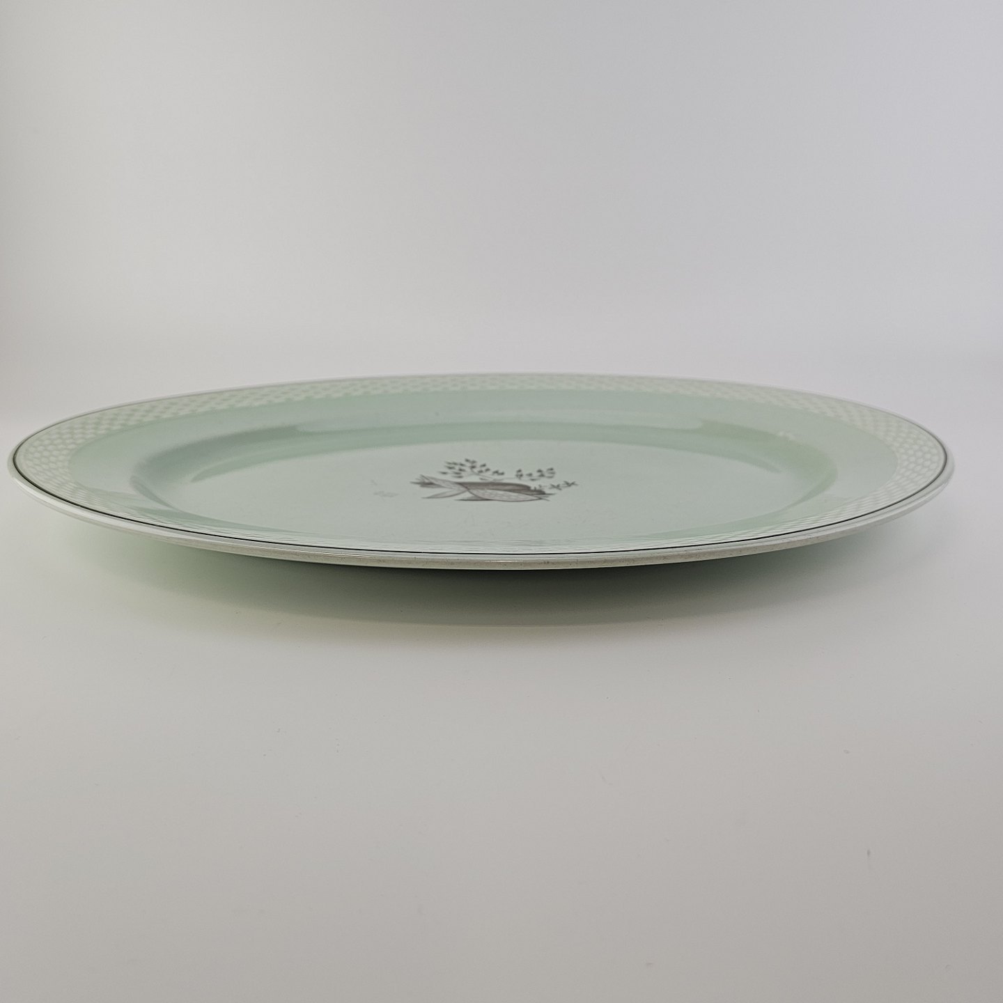 Stel i lysegrøn fajance med natur dekoration og flettet kant