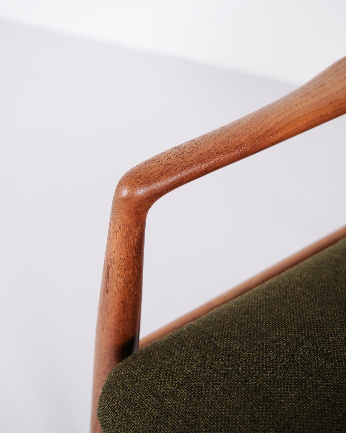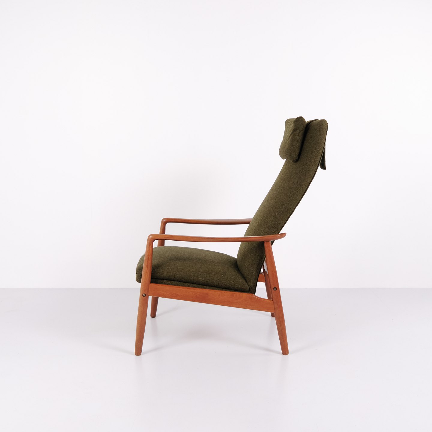 Beskrivelse: Et par hvilestole med skammel designet af Alf Svensson for Fritz Hansen. Teaktræ og grønt stof. Skandinavisk design fra 1960’erne med fokus på komfort.