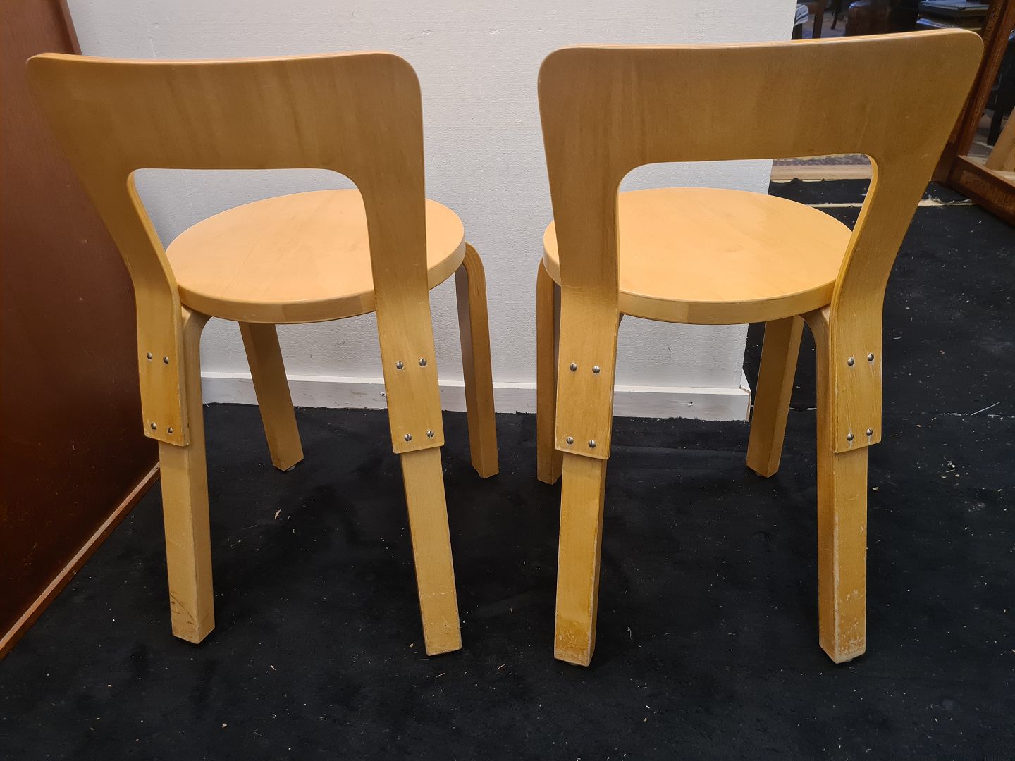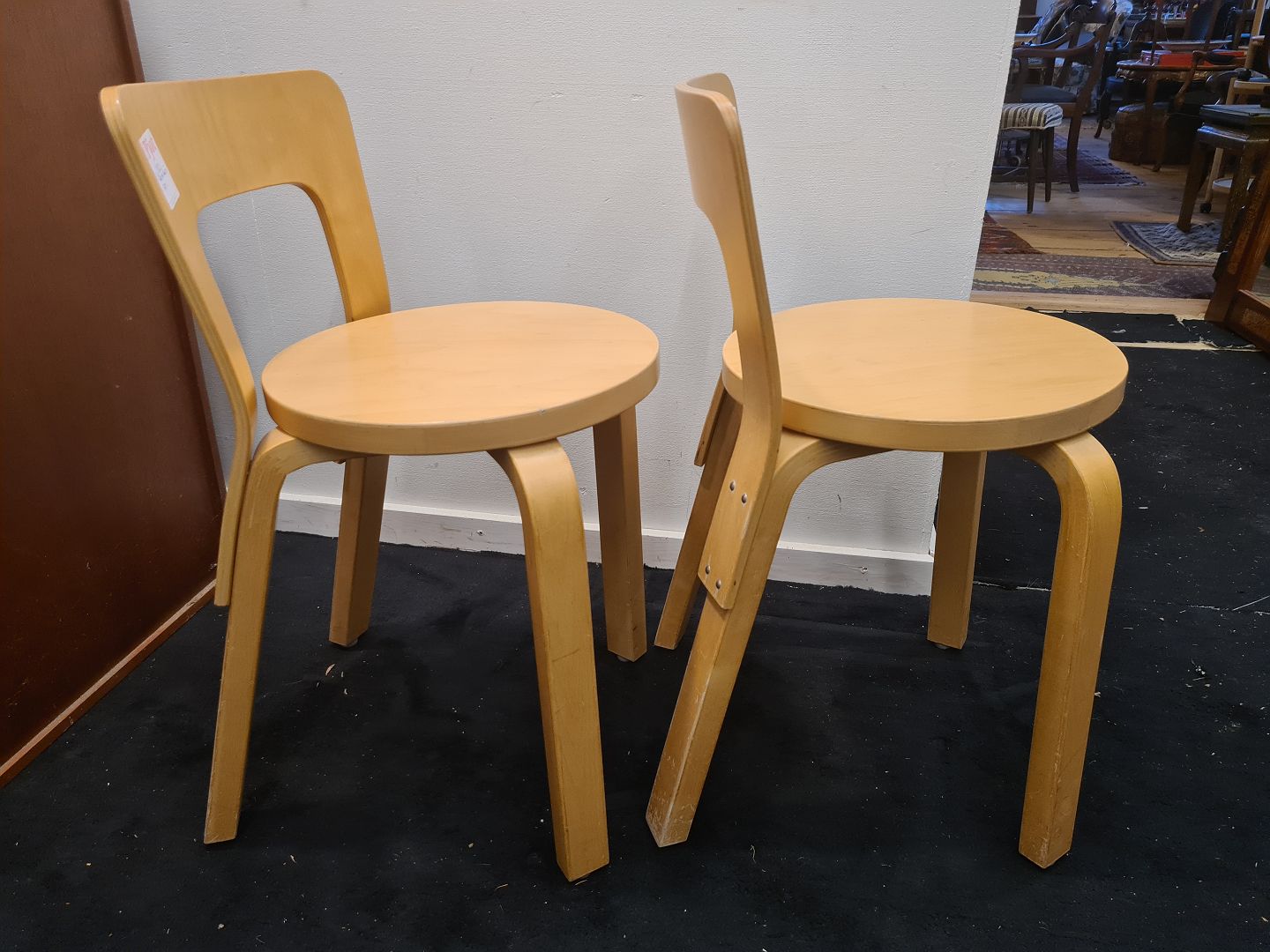Beskrivelse: Par Alvar Aalto stole model 65 i bøg. Fremstår pæne og stabile uden de store brugsspor.