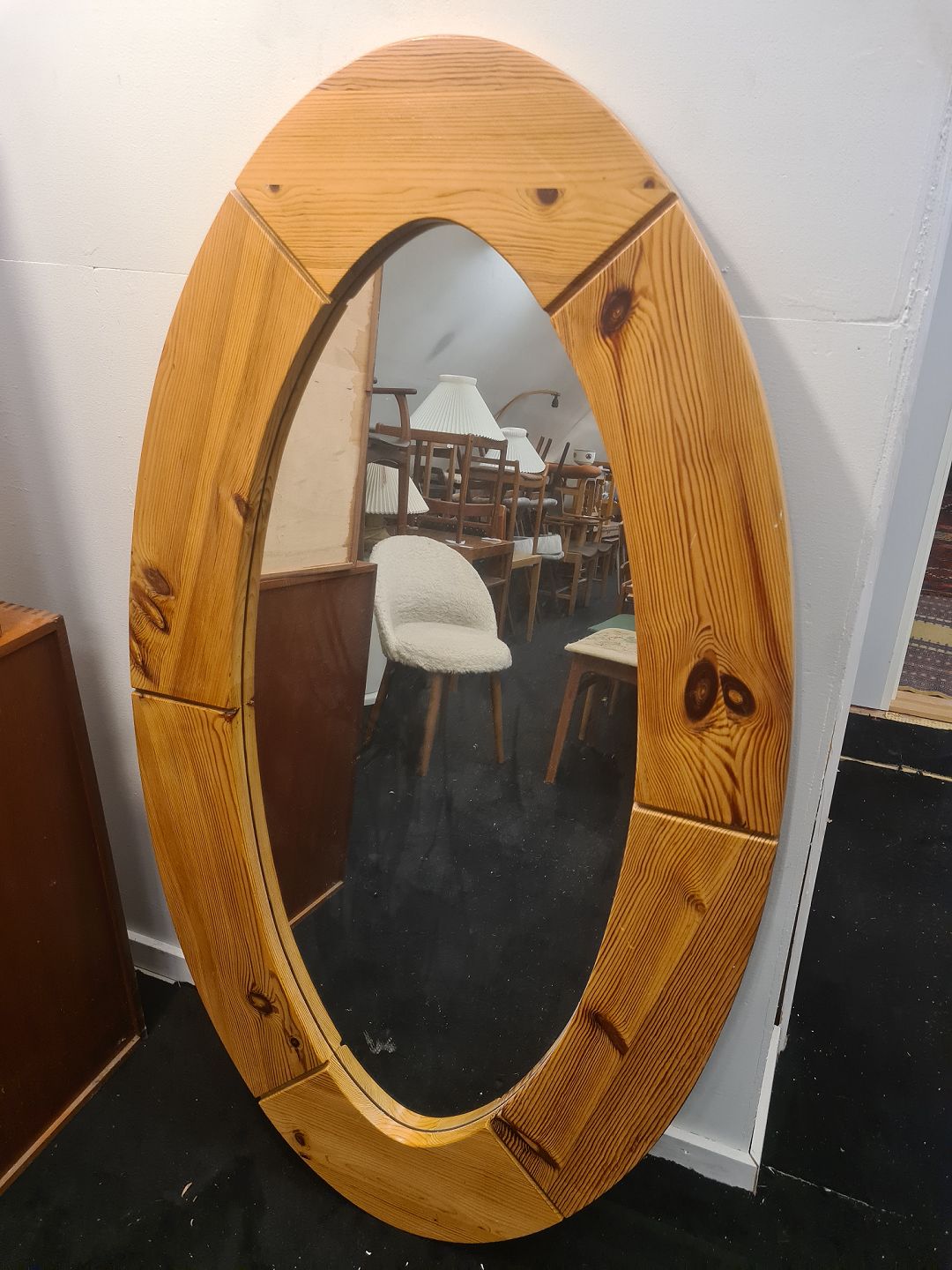 Beskrivelse: Svensk designet ovalt spejl i massiv fyr. Fremstillet i 1980'erne. Fremstår pænt og velholdt uden nævneværdige brugsspor.