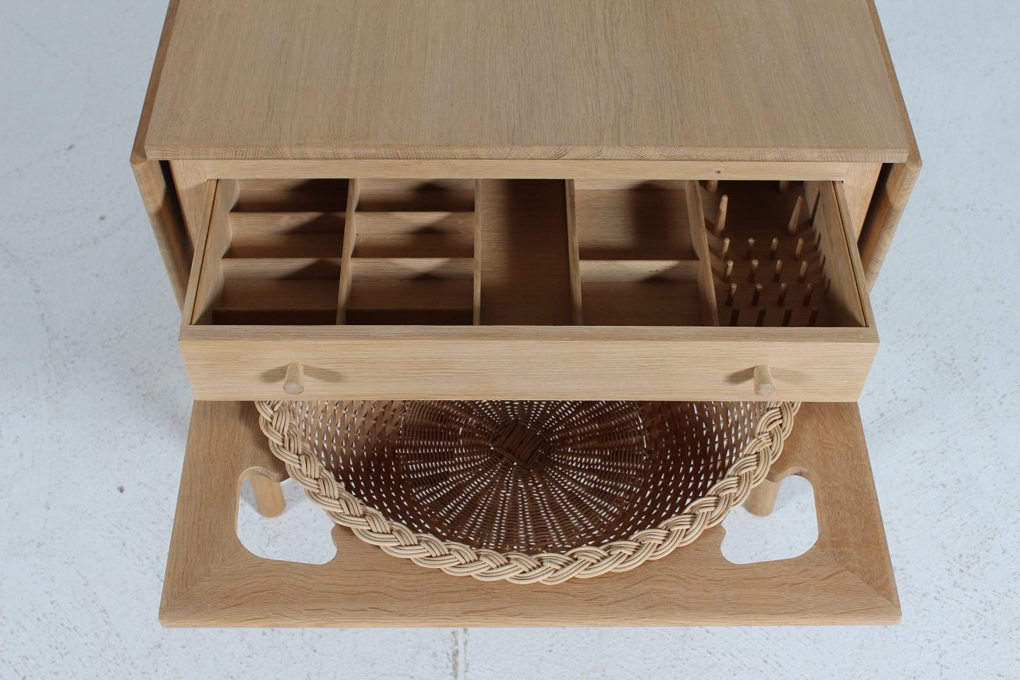 med skuffe og kurv til garnnøgler