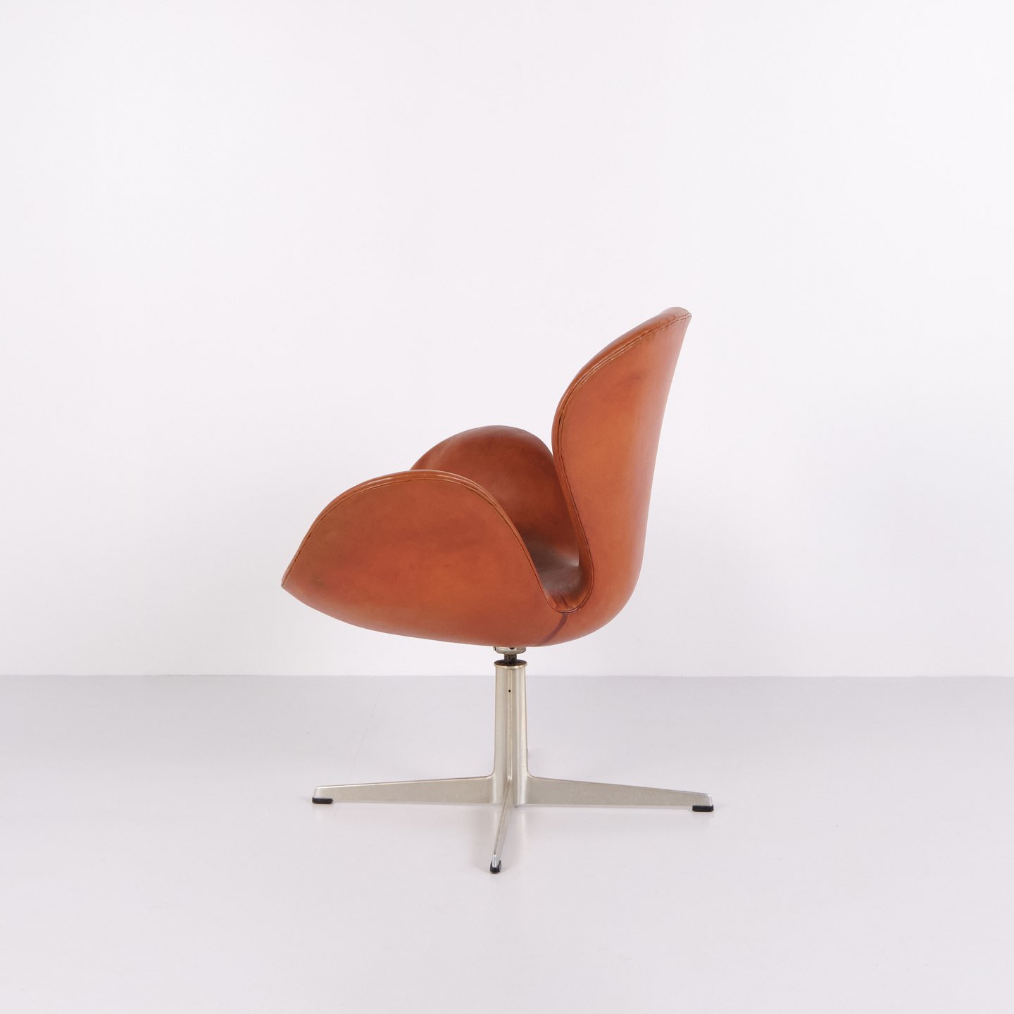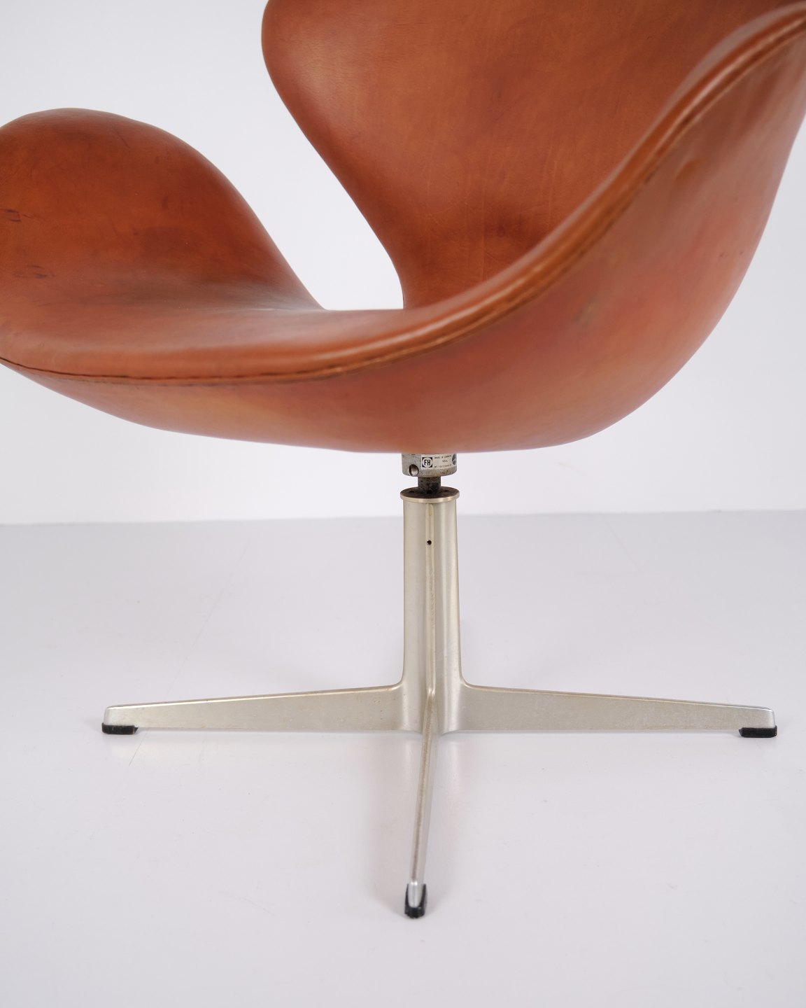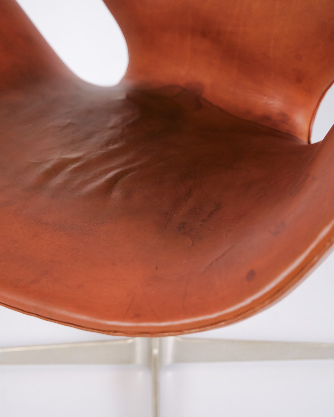 Beskrivelse: Svanen model 3320 af Arne Jacobsen for Fritz Hansen i originalt cognac læder fra 1960’erne. Ikonisk dansk design.