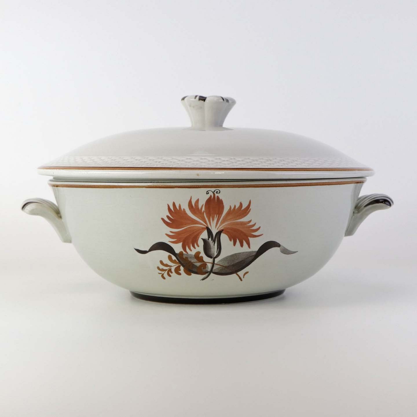 Fajancestellet er i stelformen Viktoria II med dekoration af orangebrune blomster på gråtonet baggrund med brun kant.