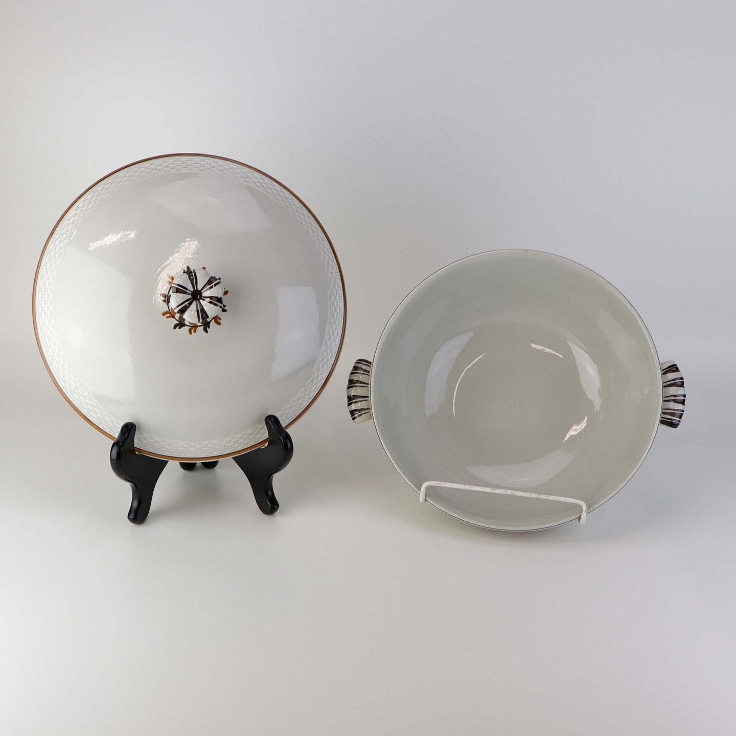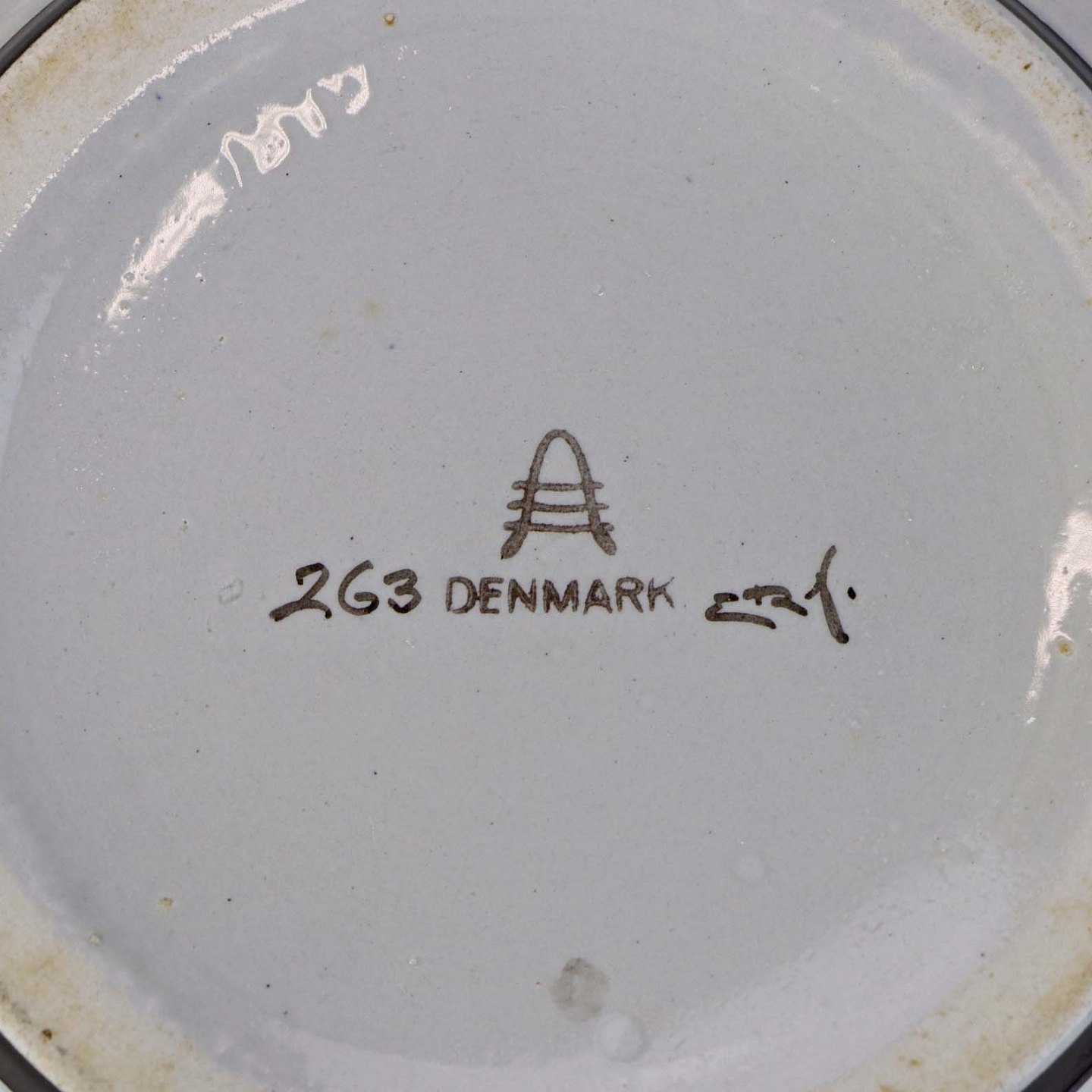 Beskrivelse: Lågfad i fajance med hanke fra stellet Kirsten, som blev fremstillet i perioden 1934-1957. Nr. 263