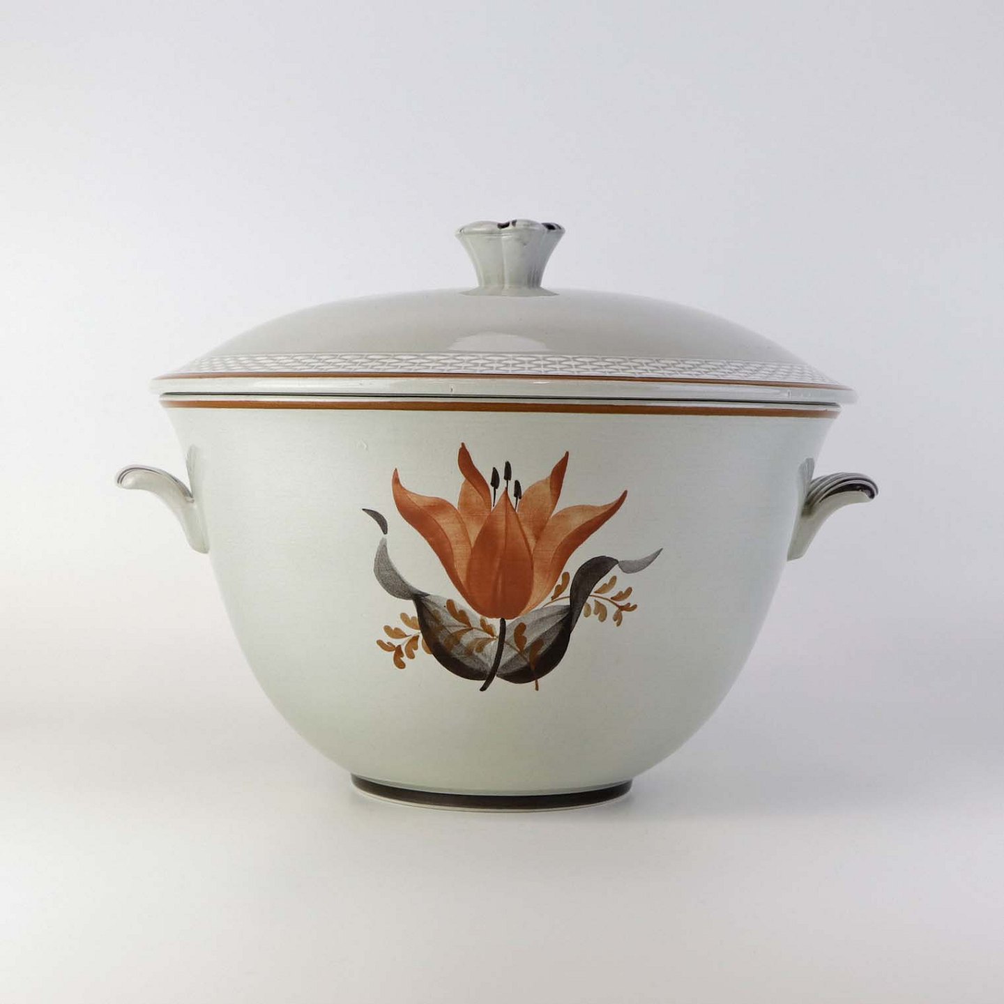 Beskrivelse: Stor suppeterrin i fajance fra stellet Kirsten, som blev fremstillet i perioden 1934-1957. Nr. 263/1518