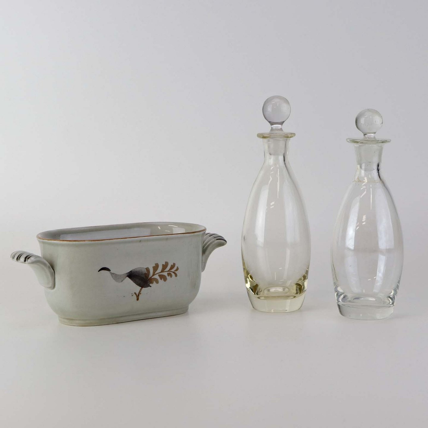 Beskrivelse: Sæt med to glasflasker til olie og eddike med prop i kar med hanke af fajance fra stellet Kirsten, som blev fremstillet i perioden 1934-1957.