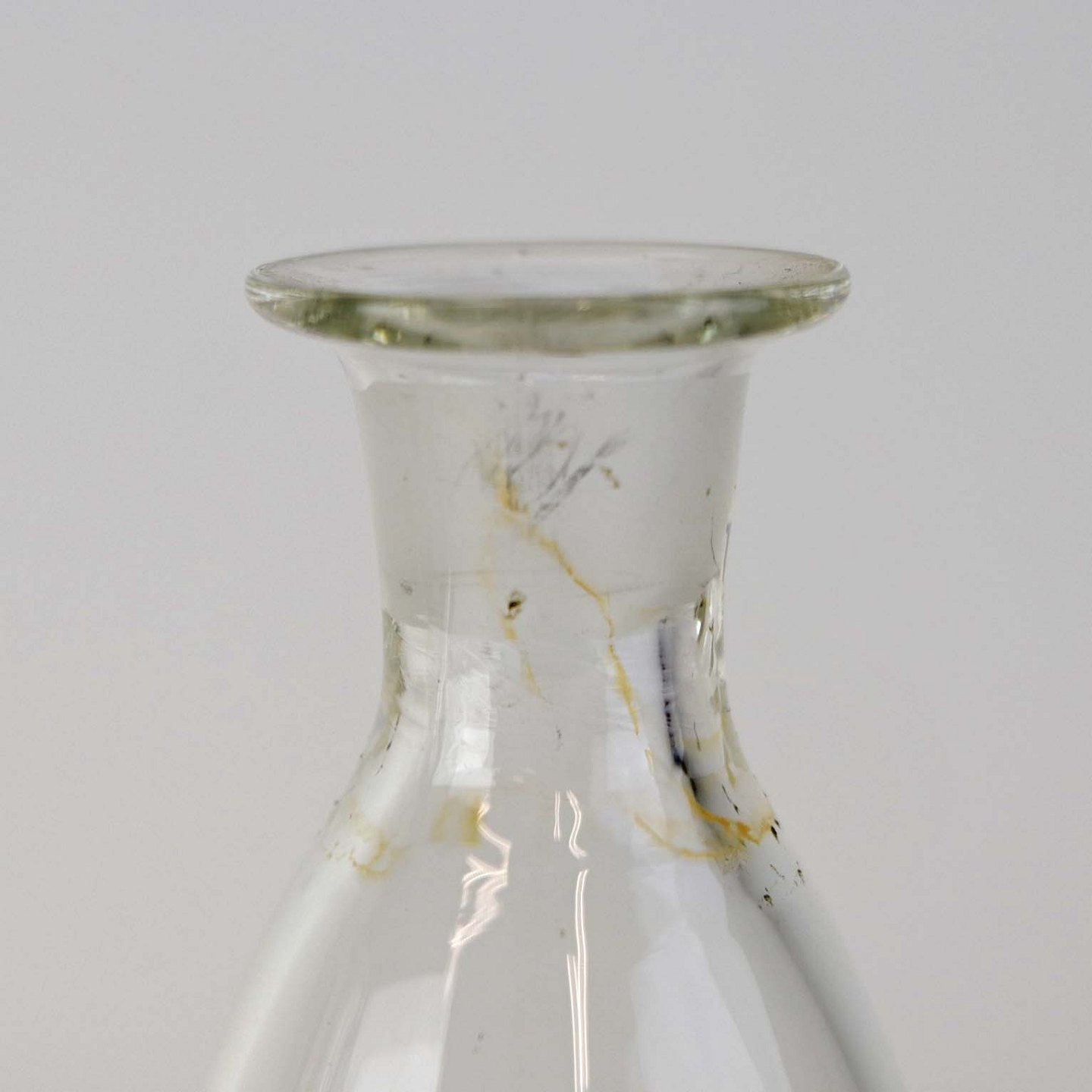 Fremstår med brugsspor glas ved den ene flaskehals.