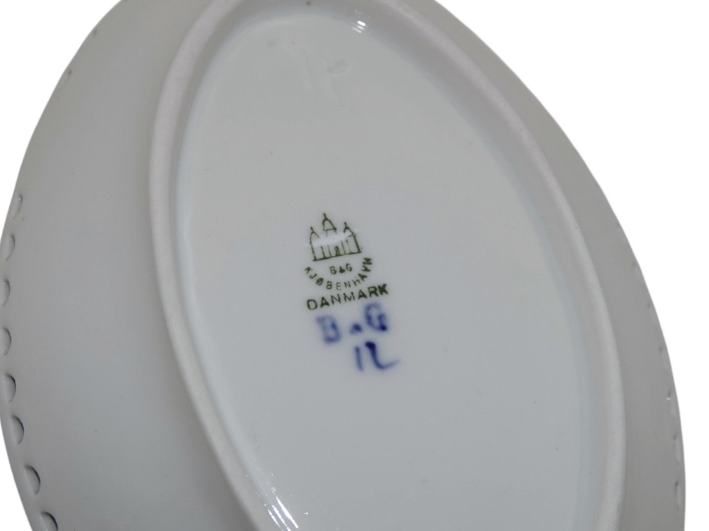 Beskrivelse: Bing & Grøndahl Blåmalet / Musselmalet, sjældent set mini fad med blondekant.