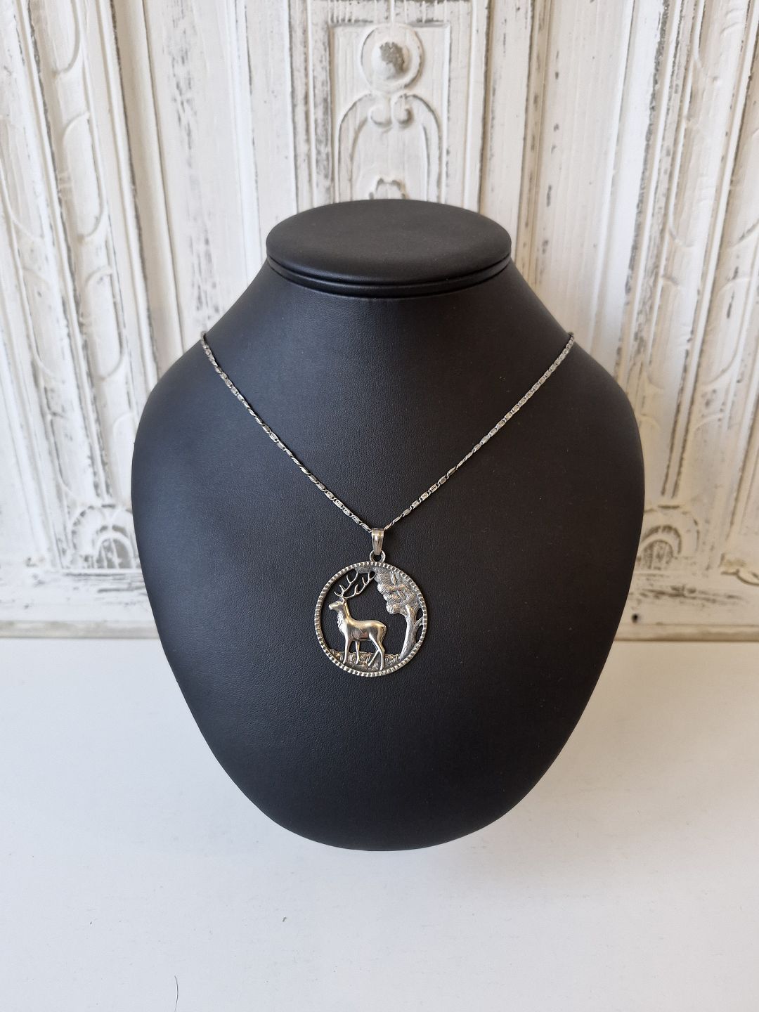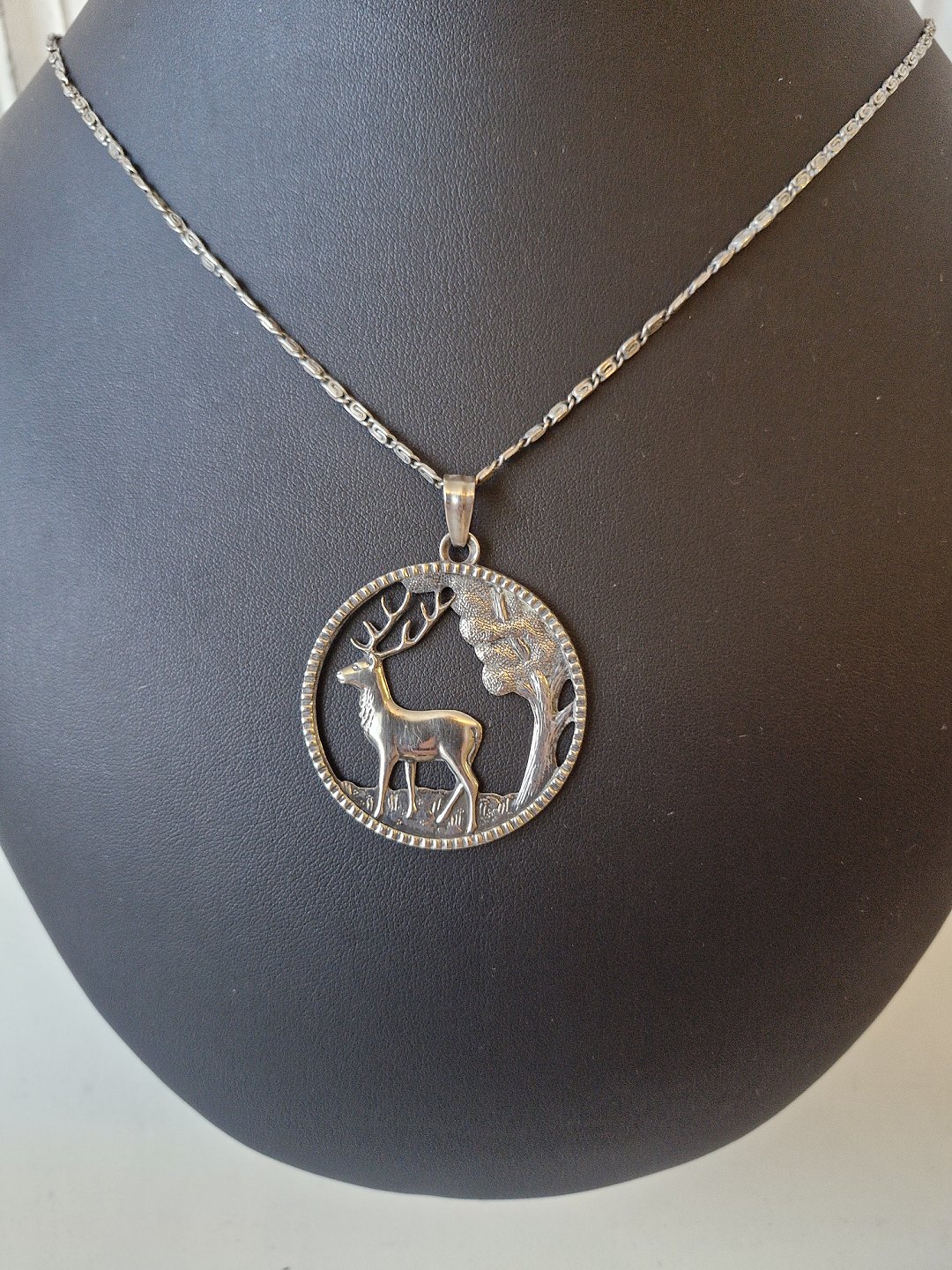 Halskæde og vedhæng i sølv, vedhænget er udformet som skovparti med krondyr