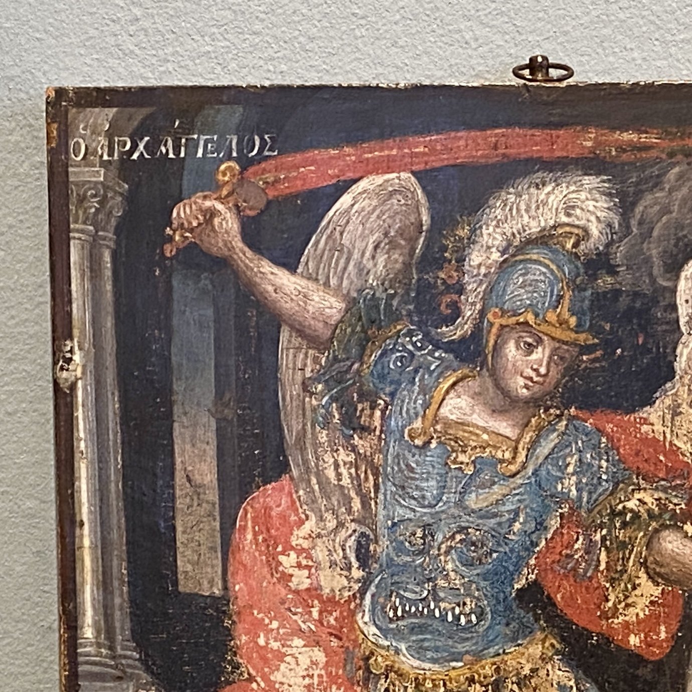 Beskrivelse: Græsk Ikon bemalet med ærkeenglen Mikael som besejrer Satan.